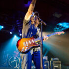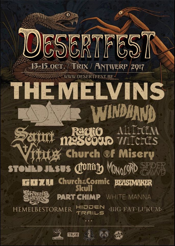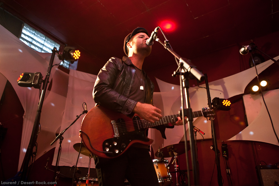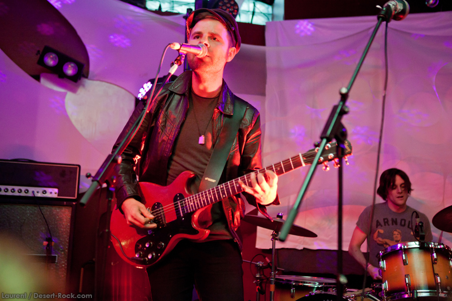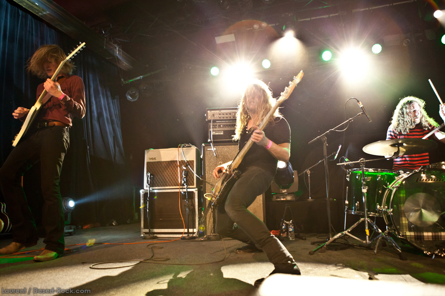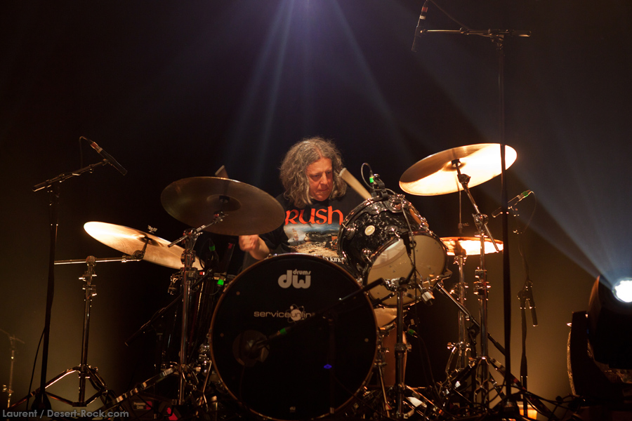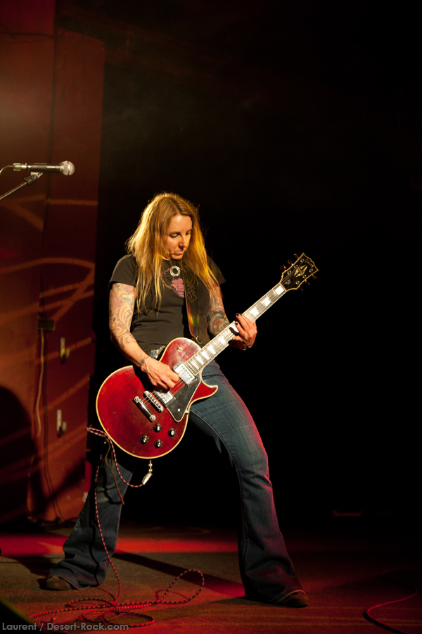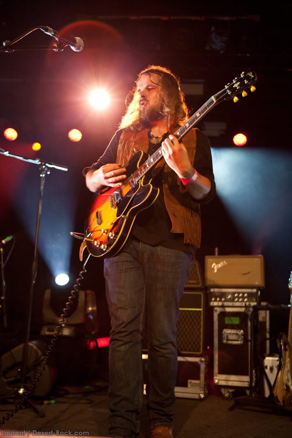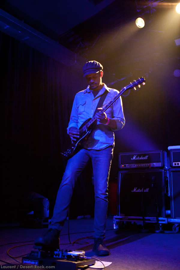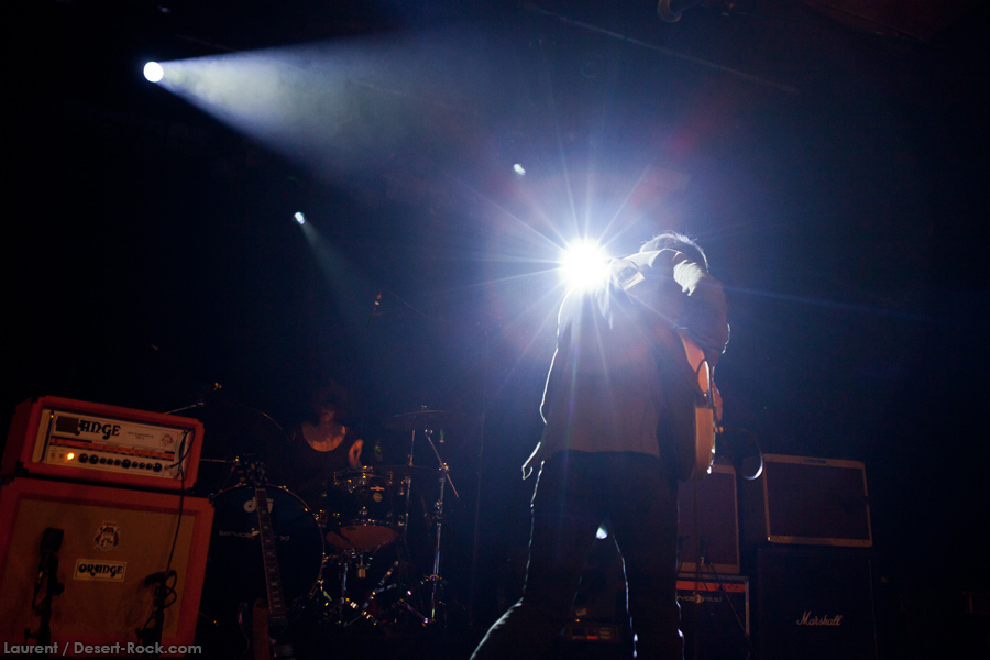 Présent depuis la veille sur le site du Desertfest, Brant Bjork était très attendu, et sa position de headliner de la journée est incontestable au vu de la notoriété démontrée du grand frisé ces derniers mois. Low profile jusqu’au bout des ongles, il débarque nonchalamment sur scène, un Martini à la main, qu’il dépose au sol devant ses retours, avant de s’engager avec son Low Desert Punk Band dans une impro instrumentale qui donne le ton de son set, impro se fondant en « Lazy Bones » enchaîné évidemment à l’indéboulonnable « Automatic Fantastic ». Plus qu’un vulgaire backing band, Bjork a trouvé une sacrée paire de cordistes avec le duo Bubba DuPree / Dave Dinsmore, qui l’épaulent avec efficacité et talent. On exprimera quelque réserve sur le nouveau batteur, Ryan Güt ; il faut dire que passer après Tony Tornay n’est pas facile, et le jeune batteur n’a pas le groove de son prédécesseur, même s’il fait le job. Le grand desert-rocker déroule un set de bon niveau, même si on sent le gaillard un peu en pilotage automatique de temps en temps, surtout quand on l’a déjà vu sur sa tournée précédente (d’autant plus que la set list n’est pas vraiment révolutionnée…) : tandis que le quatuor était impeccable de bout en bout il y a quelques mois, il vendange ici quelques titres qui perdent un peu en efficacité (« Too many chiefs… »). Mais on serait bien bégueule de ne pas apprécier la prestation du combo ce soir, qui déploie quand même une set list de classiques, qu’il étaye de quelques glorieuses impros instrus, et d’un nouveau titre en milieu de set. Soutenu par un light show efficace, et une évidente envie partagée de bien faire, le groupe joue sur du velours, surfant sur un coefficient sympathie qu’il n’a pas volé, ne serait-ce qu’au titre d’une carrière de besogneux, qui trouve son aboutissement légitime dans ces dernières tournées à succès. Perchés sur leur nuage, les zicos, heureux, festoieront une bonne part de la nuit, mettant à rude épreuve les détecteurs de fumée de leur loge jusqu’au bout de la nuit…