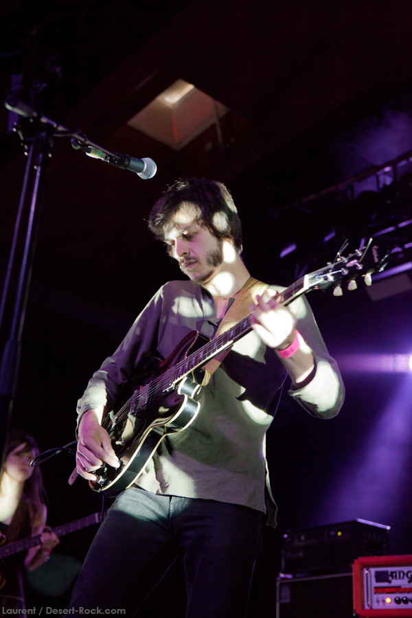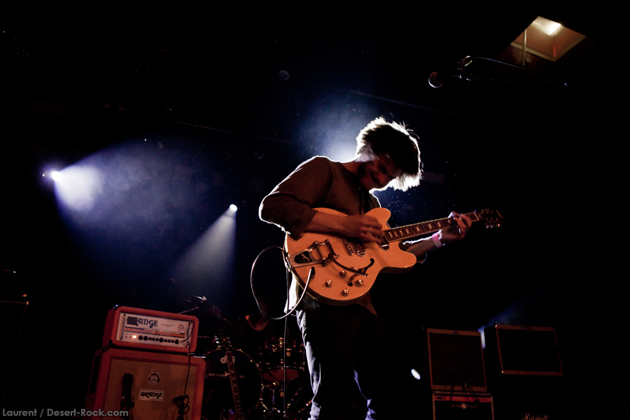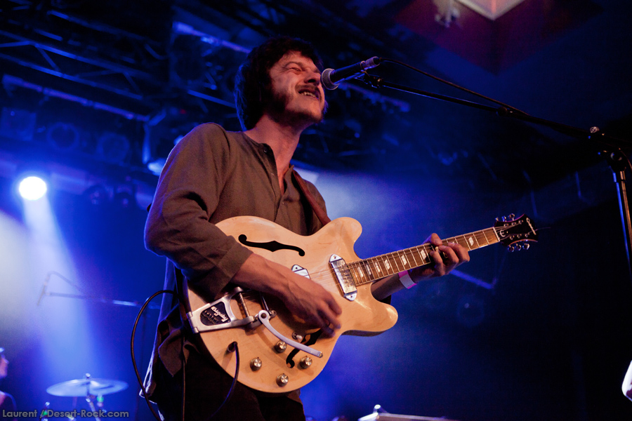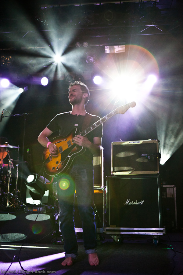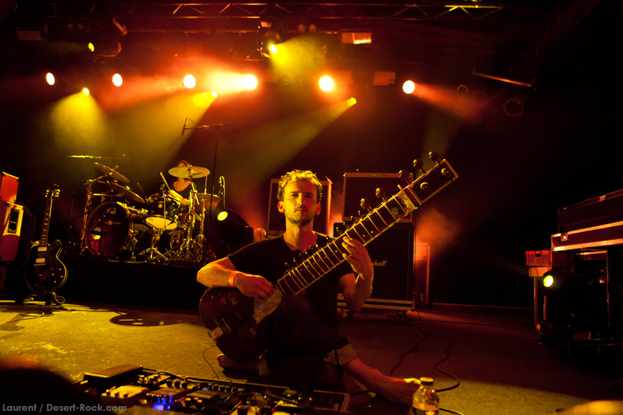 Les bruxellois de Moaning Cities ouvrent la main stage aujourd’hui, et font très vite montre d’une belle maîtrise dans l’exercice parfois casse gueule du rock psychédélique. Riffs lancinants, chant habité, les basiques sont bien là. La rythmique 100% féminine est redoutable d’efficacité, avec notamment un son de basse impeccable. En tous les cas, les quatre belges aux influences rappelant une sorte de Velvet version orientale, option Uriah Heep au bac et Jethro Tull en LV2, sont complètement dans leur trip, sans jamais non plus se perdre dans des jams stériles : les morceaux sont bien calés, ce qui contribue à l’aspect « moderne » de leur proposition musicale (qui évite l’écueil des impros vasouillardes sans fin trop souvent pratiquées dans cette veine musicale). Lorsque le bassiste s’empare de son sitar, assis par terre jambes croisées, pour s’engager dans un morceau pleinement oriental, on sent que les p’tits jeunes se la jouent authentiques. Et au final, ça fonctionne bien : le set déroule et le public, comme nous, prend du plaisir.