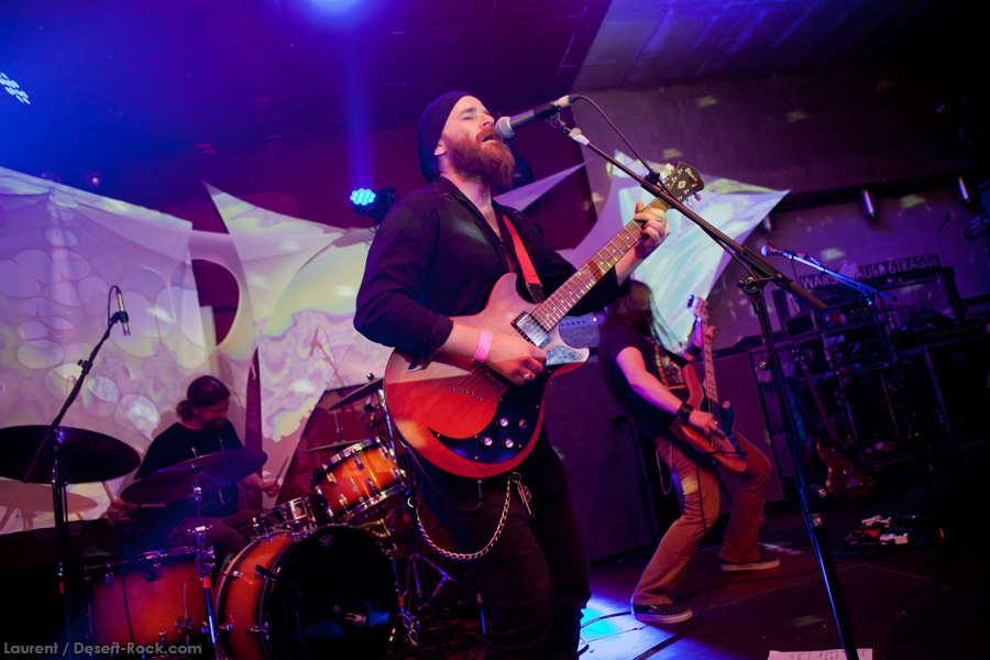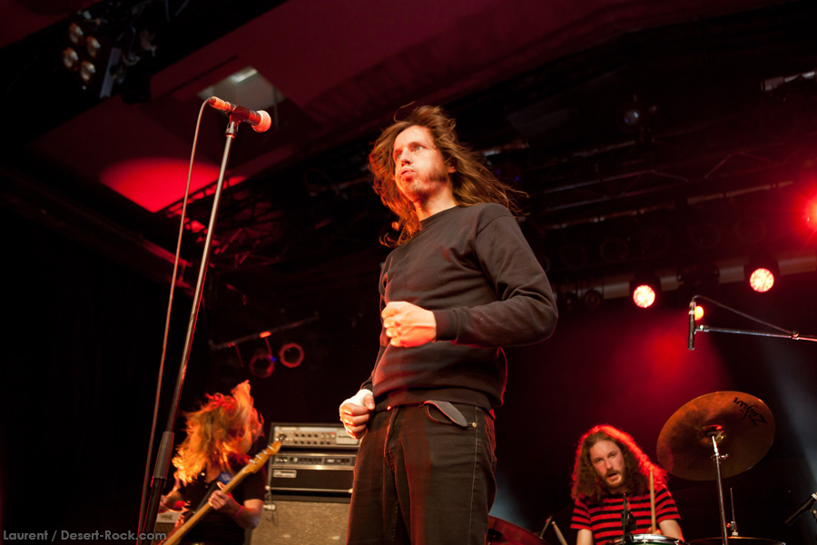 On est déjà bien calé devant la scène Foyer quand le trio suédois pose ses six pieds sur les planches : KAMCHATKA traîne avec lui une réputation étonnante, disproportionnée au regard de la confidentialité de ses productions vinyliques d’une part, et de la rareté de ses prestations live d’autre part. Mais être invité par Clutch pour faire leur première partie des deux côtés de l’Atlantique, participer au projet King Hobo qui accueille aussi Jean-Paul Gaster, et avoir en son sein Per Wilberg (Spiritual Beggars, Opeth, etc…), ça vous pose la légitimité d’un groupe. Il nous fallait donc valider ça sur pièce. Très vite, la qualité du combo ne fait plus grand doute : mené par un frontman chanteur / guitariste qui assure (Thomas Andersson), le power trio évolue dans un stoner heavy rock riche en riffs et en soli, très propice aux passages instrumentaux voire aux impros (50% de King Hobo sur scène, quand même…). La variété des compos est l’un des points marquants de ce set qui, en quarante-cinq minutes, aura convaincu un public dense et satisfait – à l’image de Tommi, de Dozer et Greenleaf, qui aura suivi tout le set avec le sourire aux lèvres (le bonhomme nous confiera quand même que le groupe aura été l’une de ses révélations sur ces trois jours). Sortez-les de leur froide scandinavie et venez les faire jouer par chez nous, bon sang !