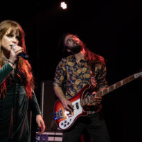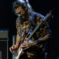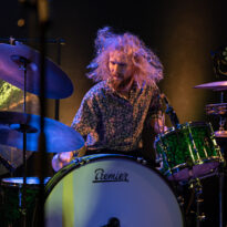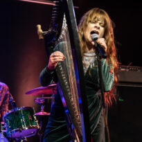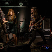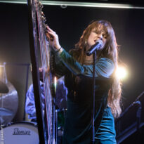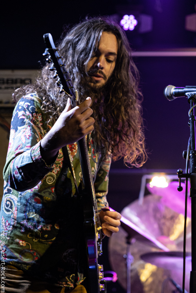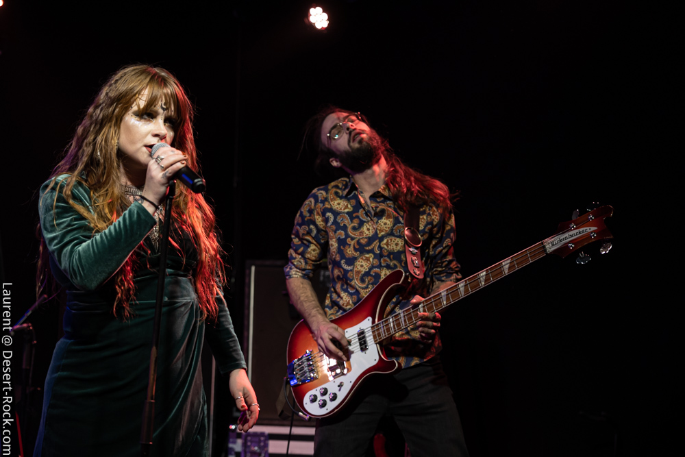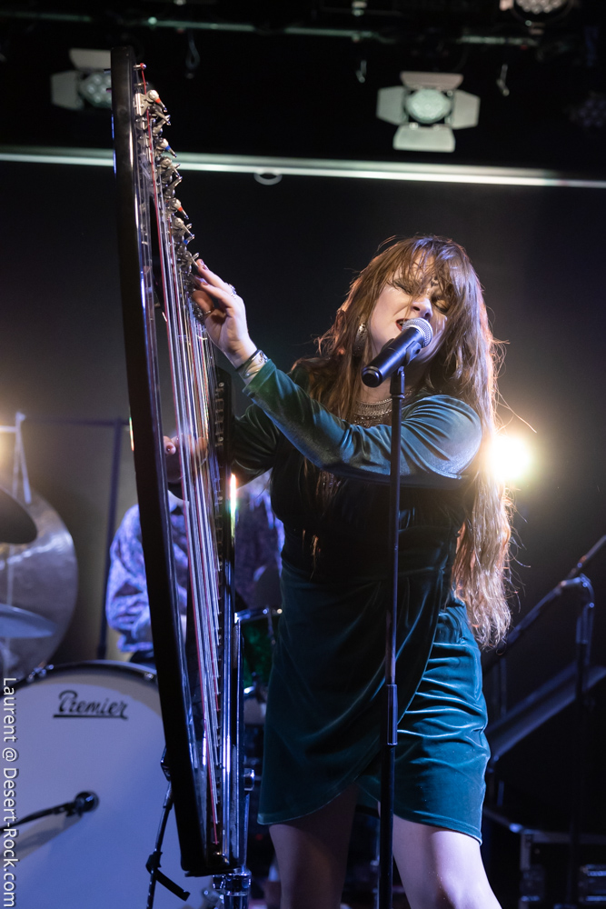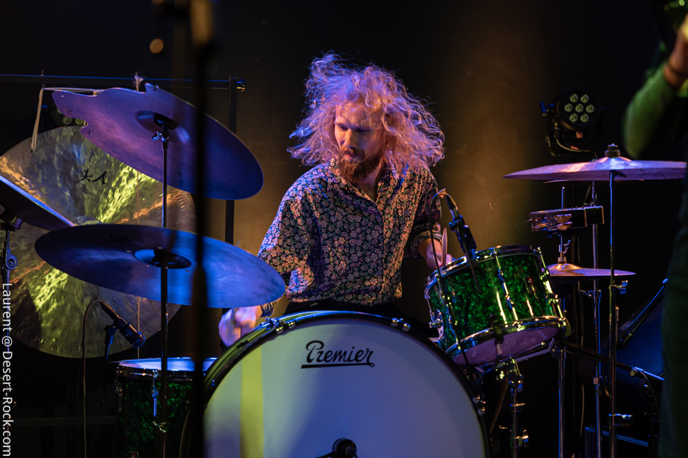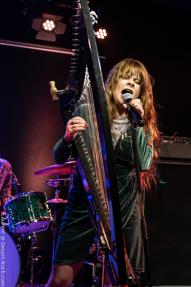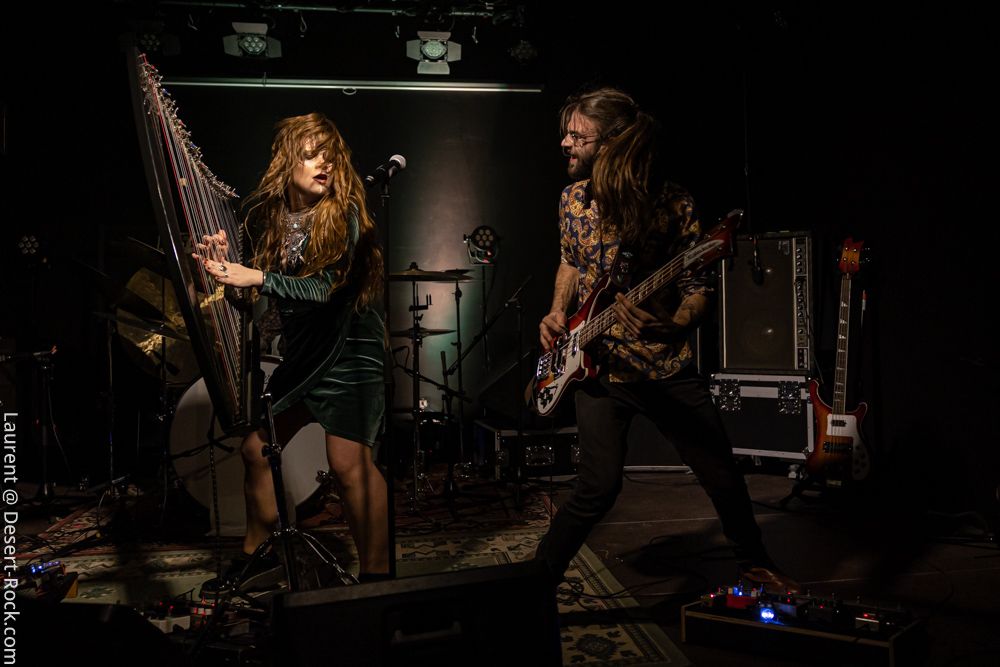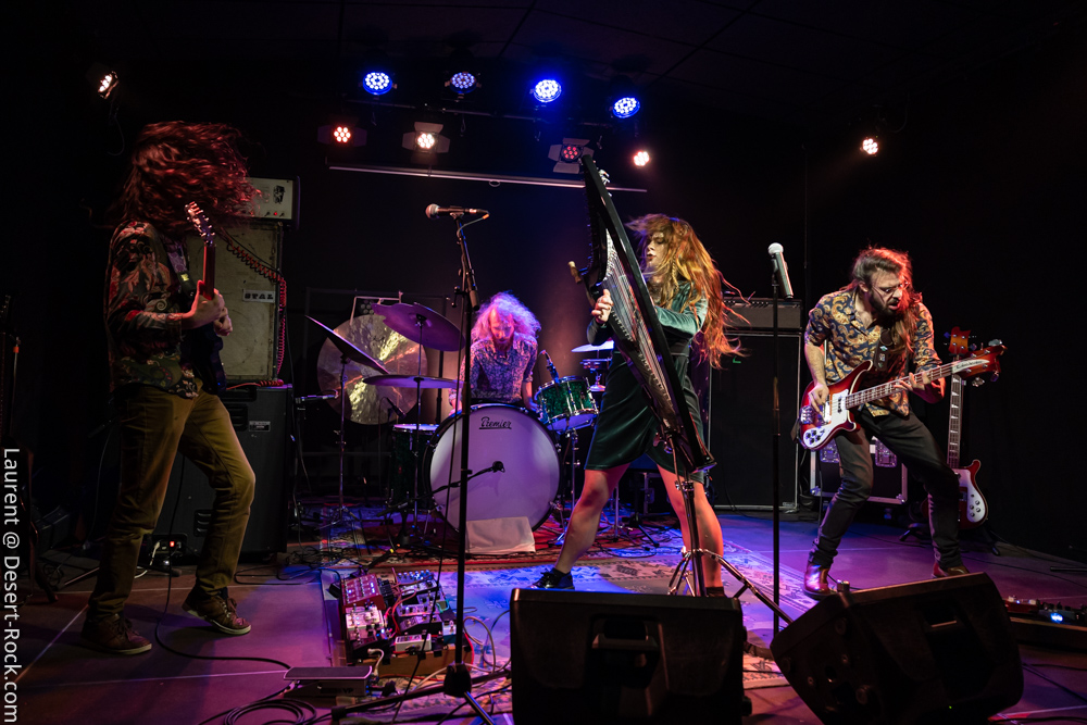 Musicalement, on a beau connaître la musique (jeu de mots), la musicalité du groupe est parfaitement adaptée au live, mêlant séquences groovy psyché menant aux bords de la transe, perforées souvent par des saillies de pure énergie rock. Toujours aux limites de l’impro, les séquences instrumentales sont bien en place, efficaces et maîtrisées. Pour celles et ceux qui ne connaissent pas Djiin, le groupe a comme particularité de disposer d’une harpe électrique, opérée par Chloé occasionnellement, qui a le profond mérite de ne pas faire « gimmick », avec un réel apport mélodique. Dans la même veine, notons que même si Chloé assure en front-woman, captant l’attention quasiment en continu (son timbre de voix rauque et sa puissance vocale restent impressionnants), chaque musicien assure à l’identique et apporte une réelle contribution musicale au groupe – mention spéciale à cette section rythmique infaillible sur l’heure de concert. Les titres s’enchaînent sans que jamais l’ennui ne s’installe, avec quelques extraits de leur prochain album qui trouvent bien leur place dans le set.
