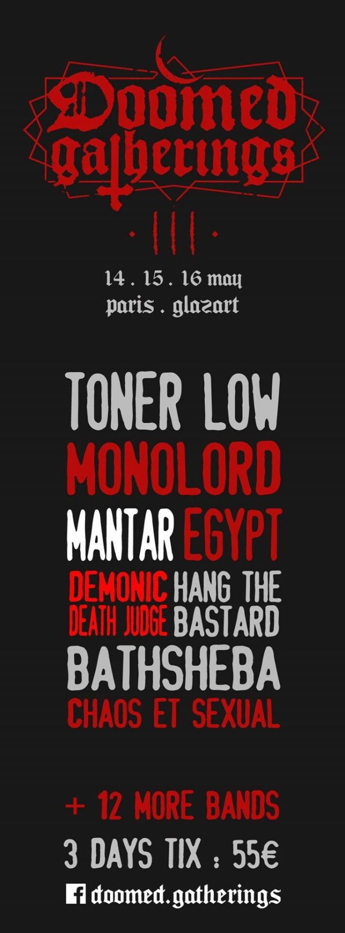 On vous a déjà fait part des premières annonces de groupes qui viendront martyriser les tympans sensibles lors des prochains DOOMED GATHERINGS (les 14, 15 et 16 mai à Paris), à savoir TONER LOW (un concert par jour, où ils joueront chacun de leurs albums en intégralité), DEMONIC DEATH JUDGE, EGYPT et BATHSHEBA.
