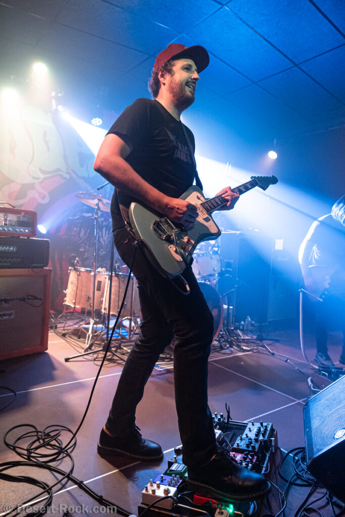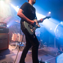En tous les cas, le concert démarre sur les chapeaux de roue… et ne ralentit presque jamais ! Le trio est solide et aguerri, et le public ne s’ennuie pas. Vincent apporte évidemment la part principale du son du groupe, et son jeu n’est jamais pris à défaut. On entend toujours ici ou là quelques influences de Josh Homme (période Kyuss – écoutez les soli en particulier…) mais il est sur tous les fronts musicalement et ne donne jamais l’impression de plagier quiconque. Dynamique, il capte l’attention d’une bonne part du public – c’est d’autant plus le cas à Pessac, le gaillard étant d’origine locale. Sa présence scénique sauve un peu le trio qui du côté de la basse reste souvent cantonné à son mètre carré de scène, bien qu’on ne puisse pas dire que Clém’ manque pour autant de dynamisme : il multiplie les efforts de prise de micro entre les titres pour laisser penser au public que le choix des titres est décidé sur l’instant (ce que l’absence de set list au sol laisse croire bien volontiers). Le bassiste sera en outre particulièrement mis en lumière lors du set de Nantes, jour de son anniversaire que les premiers rangs n’oublieront pas de lui souhaiter – démonstration d’une fan base solide.