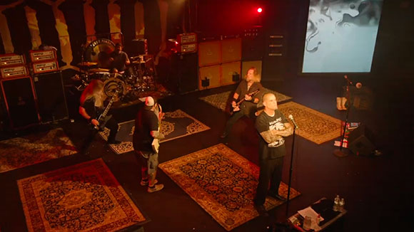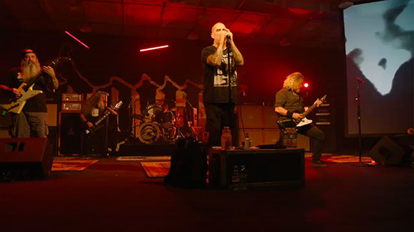 A l’heure dite, c’est finalement une succession de reportages courts, interviews et petits sketches qui nous accueille et non pas le concert, qui commencera trois quarts d’heure plus tard. Enfin, donc la scène apparaît sur l’écran, sombre mais vaste, avec deux grands écrans latéraux (largement sous-exploités durant le set), baignée par un light show pro (aux tons très jaunes / rouge). Les musiciens sont tous là, menés par un Phil Anselmo bien crampé en front de scène, bien au milieu, sur son pied de micro.