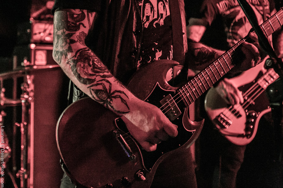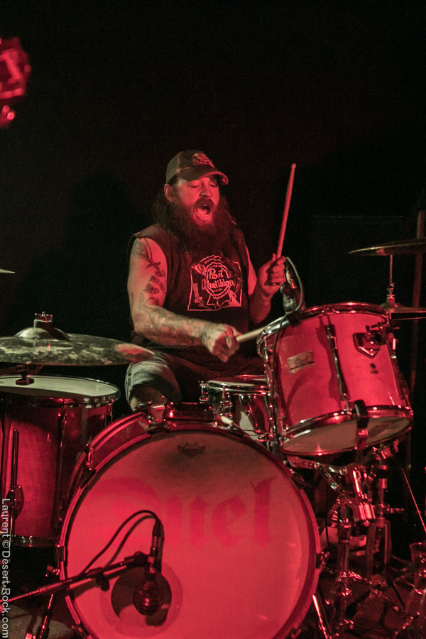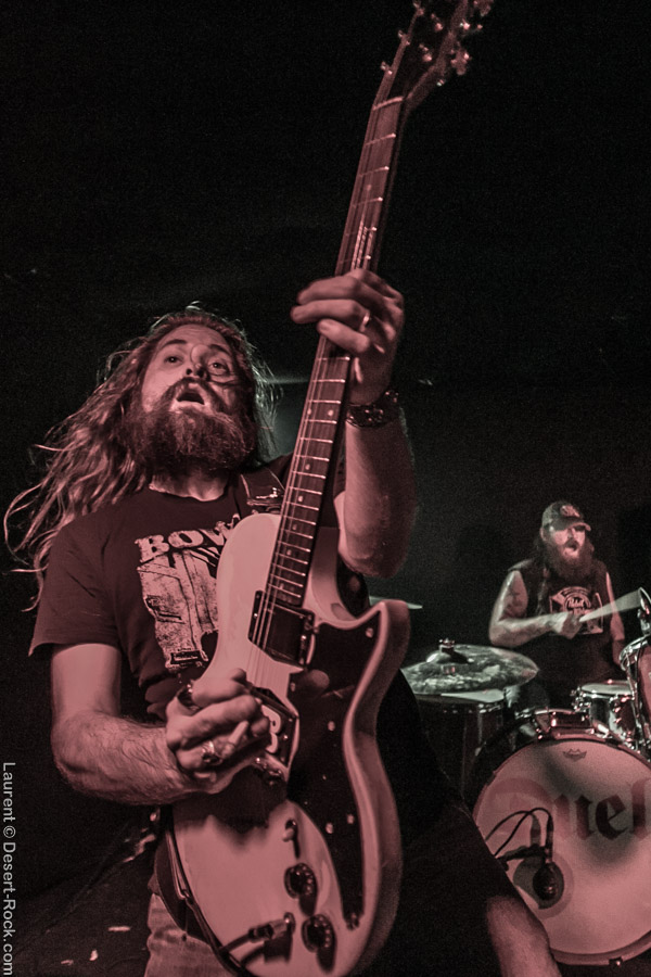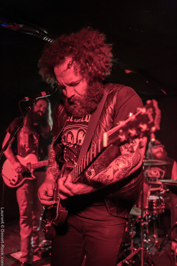 Tom Frank a beau mener la barque avec assurance et brio, son exubérance ne masque ni ne bride jamais un line up impeccablement taillé dans le plus pur sang texan (taux de santiags = 100% sur scène, un indicateur de la plus haute pertinence) : Jeff enquille les soli impeccables avec le sourire et des poses de shredder magnifique tandis que Shaun étale sa bouillonnante classe de gentleman farmer longiligne pendant plus d’une heure de set, structurant l’édifice rythmique avec maestria. Quant à JD derrière son kit, il apporte le quota redneck qui donne son plein équilibre au groupe : pieds nus, débardeur trop grand et trucker hat vissée sur la tête, le gaillard enquille des rythmiques impeccables sans jamais se dépareiller de son sourire. Et le combo d’aligner ainsi les brulots piochés aléatoirement dans ses deux galettes, faisant marcher la machine à riffs à plein régime, artillant chacun de soli limpides, le tout en tenant la scène de main de maître.