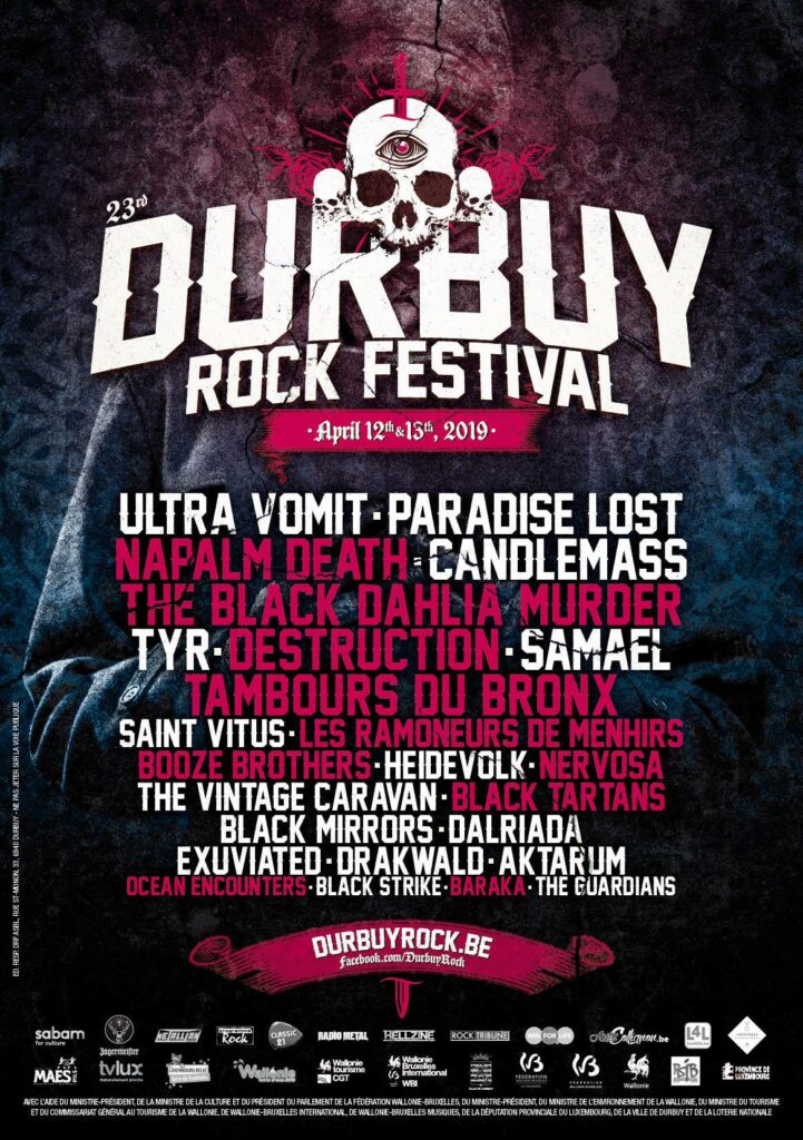 En ce week-end de Roadburn le doom ne se pratiquait pas qu’à Tilburg (où il se pratique de moins en moins d’ailleurs ou sous des formes mutantes) mais aussi en Belgique, à Bomal (et pas Durbuy, mais bon c’est à côté on va pas chipoter), où un petit festival s’accroche à flan de roche et de rivière depuis désormais 23 éditions. Un festival doté d’un esprit d’Astérix (franco-belge quoi), coincé à quelques semaines et quelques encablures de gros festivals estivaux. Un festival qui se tient pour moitié dans un gymnase (incroyablement rétro) et sur la pelouse attenante en faisant une sorte de semi plein air. Le Durbuy est l’incarnation du festival familial par excellence. Dans ses bons (enfants friendly, taille humaine, jovialité certaine, proximité des artistes) et mauvais côtés (minimum au niveau des stands, organisation à géométrie variable, speaker qui annonce les groupes avec la verve d’un GO du Club Med). Mais surtout le Durbuy festival a une grande spécificité, qui n’appartient qu’à lui : son livret. Ce petit bijou, entre des dizaines de publicités, est une anthologie de tout ce qu’il ne faut pas faire, se plaignant ouvertement de la concurrence déloyale des grands festivals, justifiant la présence pour la seconde fois d’affilée d’Ultra Vomit en tête d’affiche par un « on s’en fout on fait ce qu’on veut », décrivant les groupes qui passent au festival par des « pas sa meilleure période » ou « en perte de vitesse », bref un bijou d’absence de réalités promotionnelles. Là où le bât blesse dans cette bible noire c’est en matière d’approximation. Mais nous y reviendrons.