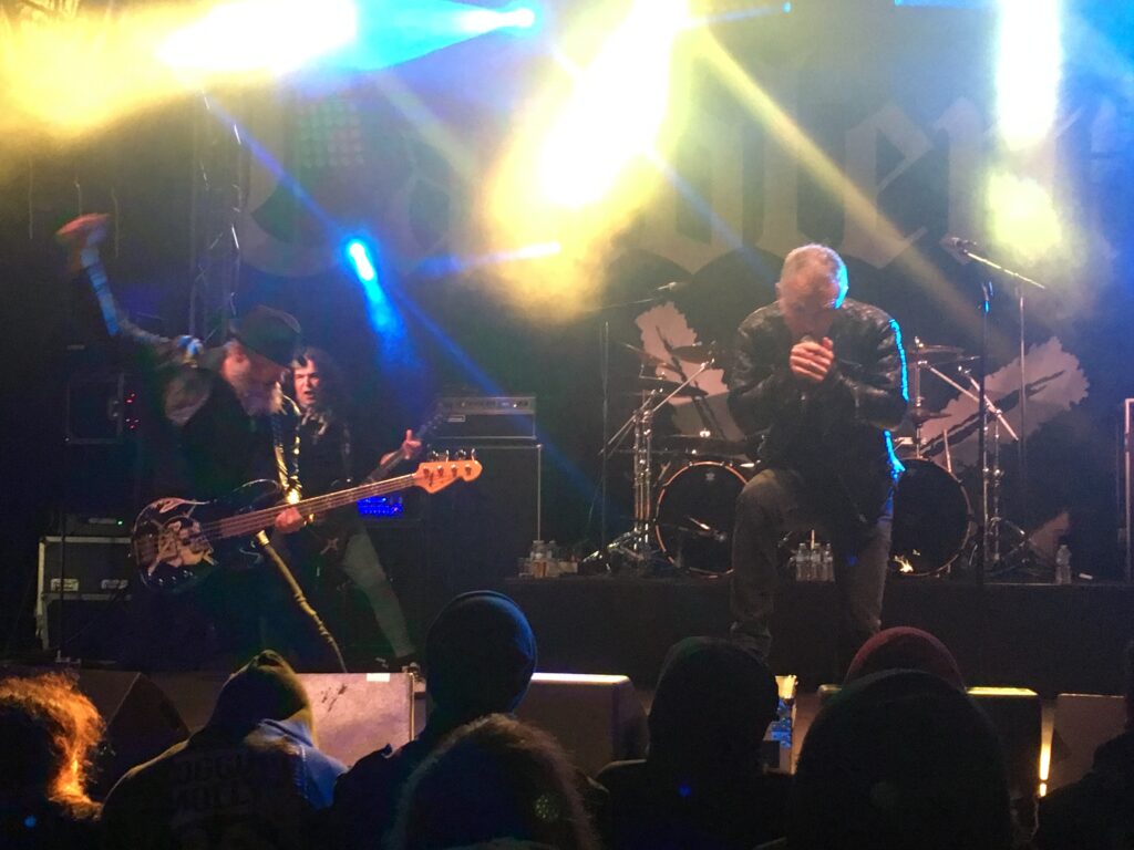 Les plus courageux (une petite centaine ?) se retrouvent dehors, sous moins trois degrés (oui moins trois putain de degrés) pour la première sortie de Candlemass en festival avec Johan Längquist, son… premier et dernier chanteur en date. Un évènement donc, d’autant plus que le livret du festival annonce que le groupe va jouer Doomicus Epicus Metallicus en intégralité. Il n’en sera bien évidemment rien et les puristes le savent dès que résonne l’introduction « Marche Funèbre » de Chopin, qui ouvre le disque Nightfall. Les suédois montent sur scène frigorifiés et balancent « The Well Of Souls » (extrait de pas-du-tout Epicus Doomicus Metallicus) en soufflant du givre. La basse de Leif Edling s’enrhume et ne semble pas vouloir marcher, ce qui rend fou cette figure historique du doom que de récurrents problèmes de santé éloignent trop souvent de la scène. Heureusement tout rentre dans l’ordre et le groupe délivre l’un des shows les plus magistraux qu’il m’ait été donné de voir de la part de la formation de Stockholm (et oui j’étais de l’incroyable concert anniversaire au Roadburn 2011 où Epicus a été joué en intégralité pour de vrai). « Mirror Mirror » (extrait lui aussi de pas-du-tout Epicus Doomicus Metallicus) est un moment énorme, et après quelques traits d’esprit (« j’aime la Belgique vous avez même une bière à mon nom » dira par exemple « Leffe » Edling) et leur single Iommiesque du dernier album (qui ne s’appelle pas Epicus… bref vous avez compris), le groupe balance un « Bewitched » ensorcelant puis enfin livre quelques extraits d’Epicus Doomicus Metallicus (« A Sorcerer’s Pledge », « Demon’s Gate », « Solitude »), pour le plus grand bonheur de tous. Une heure quinze de show malgré les éléments et un souvenir impérissable pour ceux qui ont mis le nez dehors. Pas la force de rester voir Ultra Vomit qui pourtant, soyons honnête, déchaine les passions sur la scène du (Hall Le) Sassin ; nous préférons partir sur ce souvenir formidable d’un Candlemass généreux comme jamais.