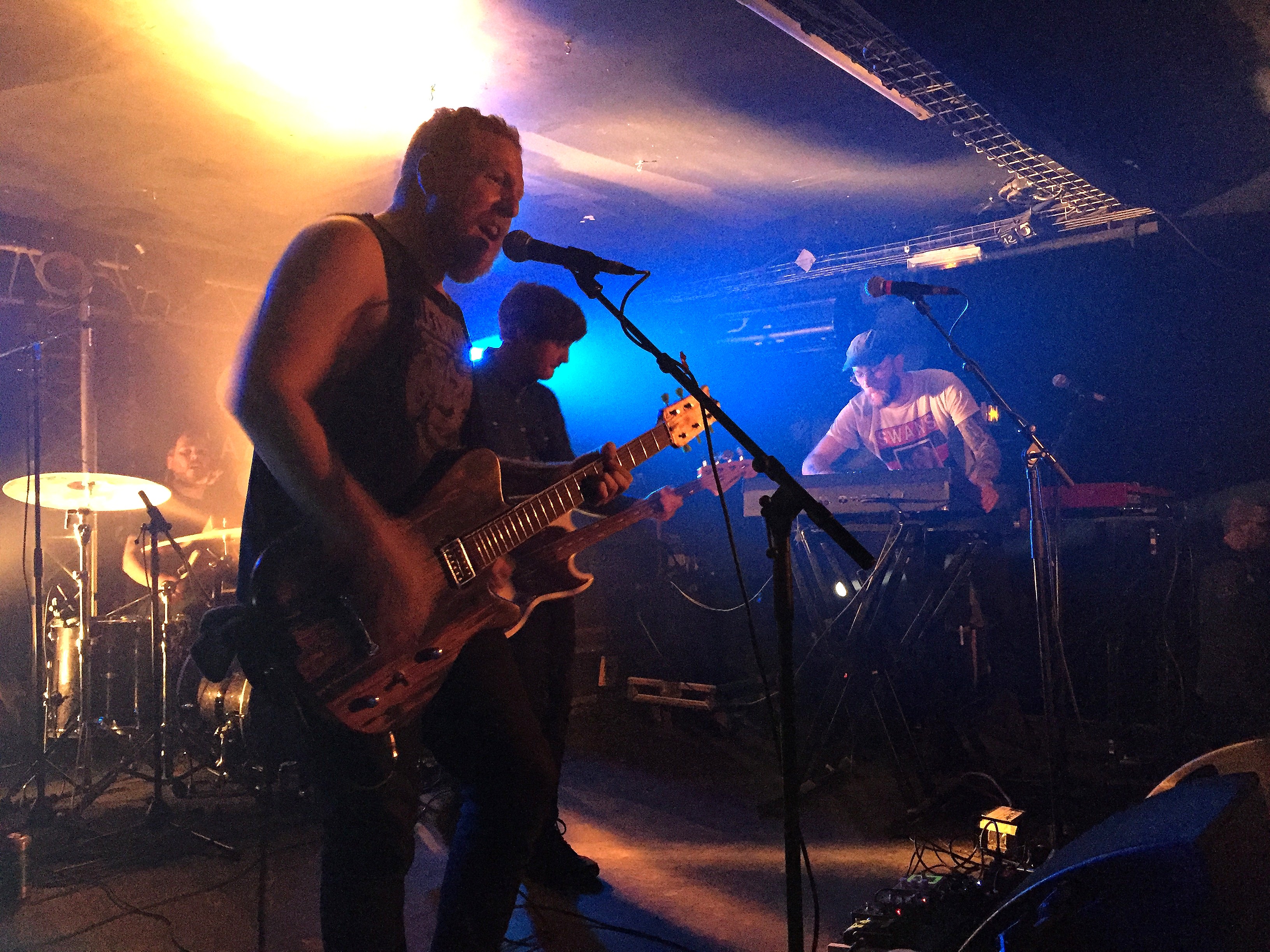 Les habitués le savent, au Glazart il s’agit de faire preuve de ponctualité. À peine le gong des 19 h retentit que le Progressif mêlé d’Heavy space rock aux accents doom d’Ancestors se met en branle. Bien que beaucoup trépignent encore d’impatience bloqués dans les transports ou au boulot, nombreux sont déjà là pour accueillir le quatuor made in Los Angeles. Leur style hybride tantôt d’une mélancolie pesante, tantôt d’une lourdeur cosmique se déploie en douceur et vient peu à peu rassembler les fidèles au-devant de la scène. Sans trop comprendre pourquoi, on se retrouve envoûté par ce mur de son, par ce chant aérien, céleste, qui survole des riffs puissants frappant comme les vagues d’une mer tumultueuse. Éventuellement cette tension finit par exploser à mesure que les titres s’enchaînent et que l’on abandonne l’influence Pink Floydienne du dernier album au profil de celle plus Earthlessienne des premiers. Le chant passe de clair à saturé, la batterie s’emporte et les invocateurs sinistres réussissent à agiter les nuques, mettant finalement l’audience dans les dispositions requises à la suite des hostilités.