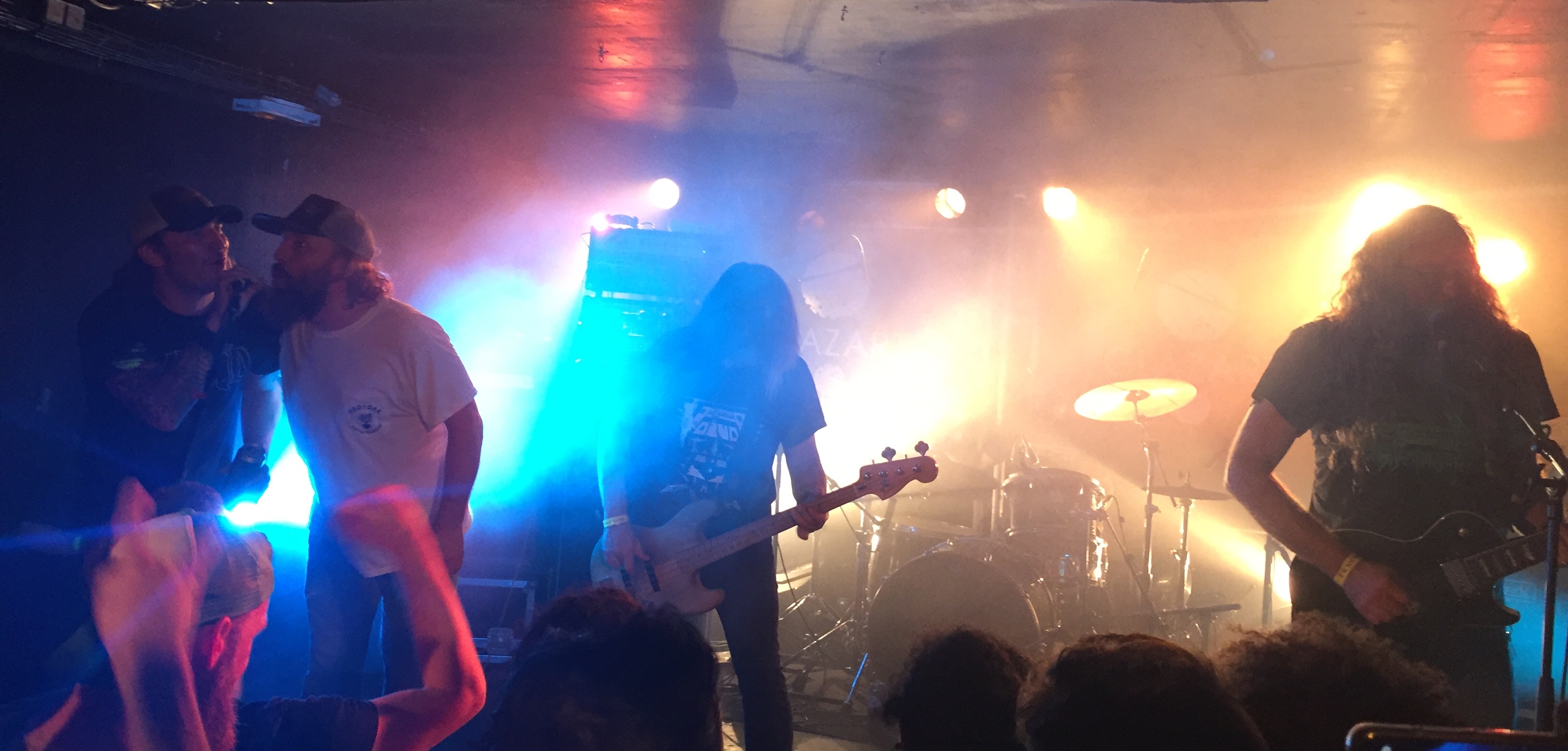 Le temps d’une énième roteuse histoire de réhydrater la machine, et on file se replacer au cœur de la forge. Pour ce dernier concert, le fer s’apprête à être battu par Elder, ce groupe originaire de Boston que tout le monde attend (si on doit en juger par la proportion de fidèles prêts à s’agiter quinze minutes avant le lancement du premier riff). Sans surprise, la prestation met sur le cul. Déjà par la beauté des compositions admirablement bien retranscrite en live ; ensuite par toute la technicité déployée par chacun des membres. Et si Nick Disalvo, chanteur, guitariste et majoritairement auteur et compositeur du bousin reste planqué derrière son pédalier, ses claviers, son micro et son orgue à pied, c’est le bassiste Jack Donovan qui assure le rôle de frontman. À grand renfort de sourire, il lie ses trois compères entre eux, mais aussi avec le public. Et pas uniquement sur le plan visuel. Comprendre que la basse revêt le rôle d’instrument le plus important d’un groupe s’avère ici facile à admettre. Côté fosse, c’est la liesse. Lorsque tout le monde finit de hurler les lyrics de « Sanctuary », chacun se jette dans le chaos global lors du démarrage de « Compendium ». Ce chef d’œuvre met littéralement la pagaille. La prestation passe presque trop vite. À peine six titres et il faut déjà quémander (pas beaucoup non plus) le rappel. Une ultime panacée offerte grâce au titre « The Falling Veil » tronquée de sa douce et onirique introduction pour n’en conserver que la substance active. Puis le rideau tombe. Déjà.