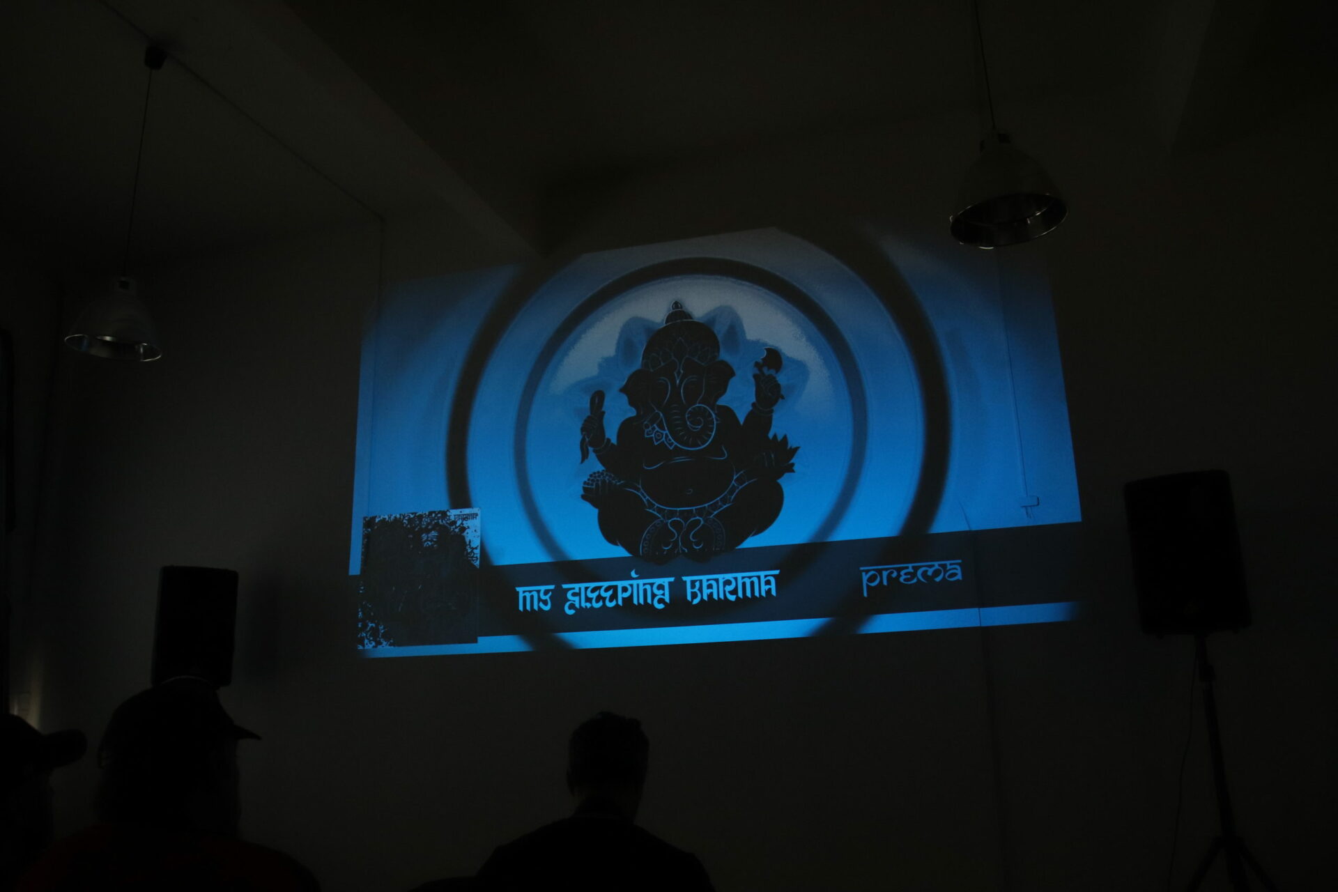 Un projo, deux enceintes et un des meilleurs groupes de la scène psych, voilà pour le décor. L’audition de Atma dernier album à paraître de My Sleeping Karma se fait en parallèle de la projection de clips.