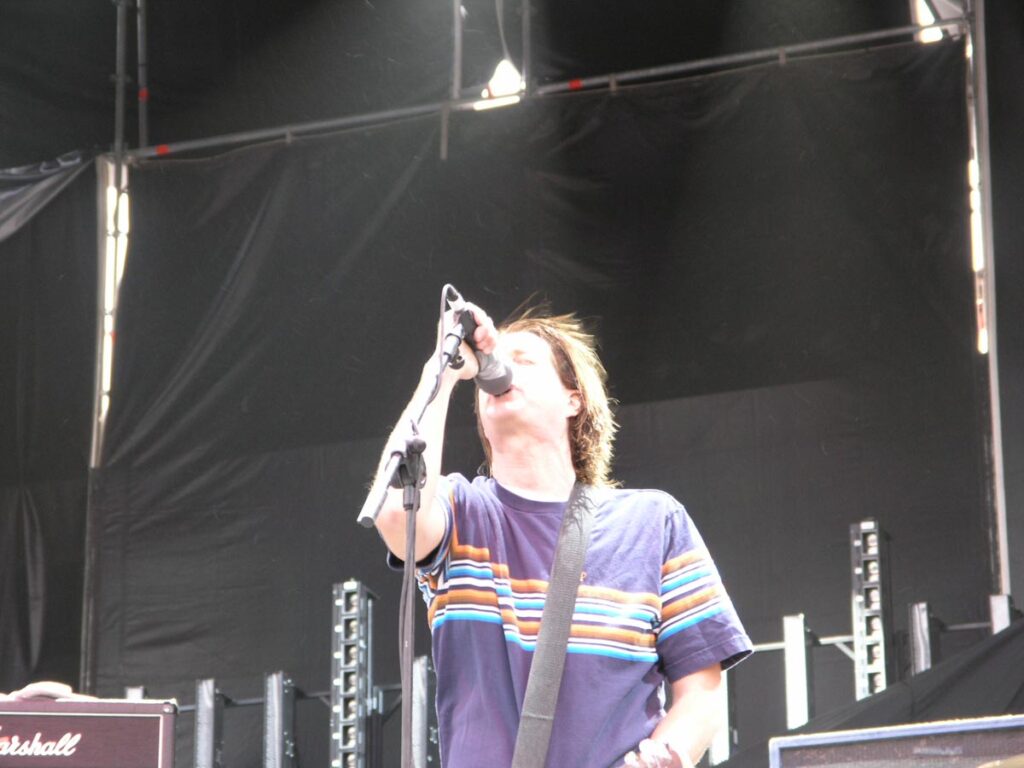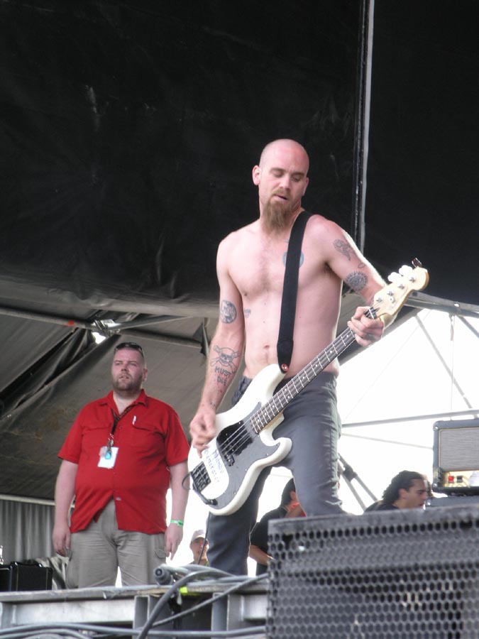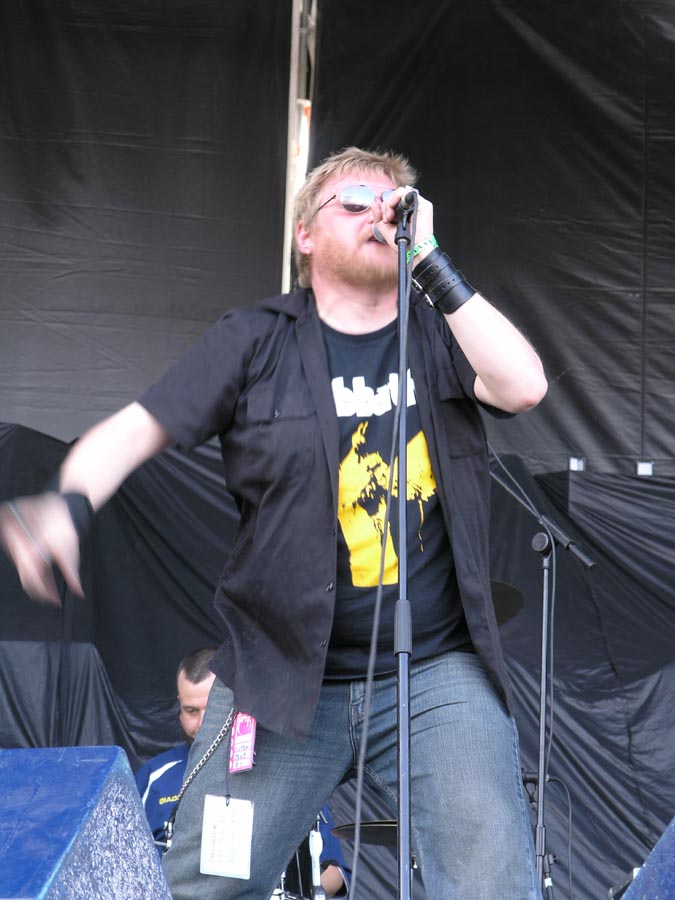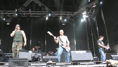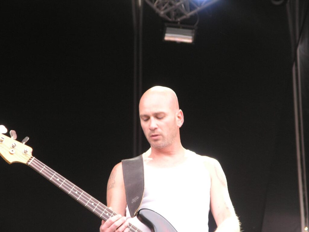 Comment mieux revenir sur le plancher des vaches que par un bon concert de Clutch ? Franchement, l’enchaînement est un vrai délice Dès les premiers accords, on se laisse bercer et entraîner dans les griffes du trio instrumental, et Neil Fallon, avec une assurance sans faille, surenchérit avec des vocaux toujours chaleureux et percutants. Il se fait plaisir, et ça se voit : il hurle, il sautille, il va voir ses collègues, il arpente la scène, il est vraiment le centre d’attraction du groupe et il assume avec classe et talent. Parce que oui, il ne faut pas vraiment demander à Dan et Tim d’assurer le spectacle : chacun dans son coin joue ses parties avec une aisance et une concentration troublantes. Ces mecs là ont le groove au bout des doigts, et ils le laissent glisser sur les cordes de leurs instruments sans que l’on ne puisse déceler la moindre difficulté dans l’exécution. Remarquable. Mais au delà de ces performances musicales, ce qui scotche en premier à chaque concert de Clutch, c’est le GROOOVE (oui, en majuscules). La paire Dan/Jean-Paul balance des lignes rythmiques somptueuses, rondes et ventripotantes, chaleureuses, sur lesquelles les autres peuvent s’éclater ce qu’ils font sans retenue. La gratte de Tim est le parfait pendant mélodique à ce duo magique, et il n’est pas rare de voir Neil se mettre en retrait sur le coté de la scène, non pas pour regarder avec satisfaction plusieurs dizaines de milliers de personnes sautiller avec le sourire aux lèvres (ça doit valoir le coup d’oeil, vu de là-haut), mais bel et bien pour regarder ses 3 potes balancer le GROOOVE à coté de lui Même lui, qui les a vus des centaines de fois jouer ensemble, ne se lasse pas de voir la magie opérer. Il n’est pas le seul, d’ailleurs, puisque la totalité de System Of A Down est sur le bord de la scène en train de hocher la tête avec le sourire, et de chanter les chansons par coeur !