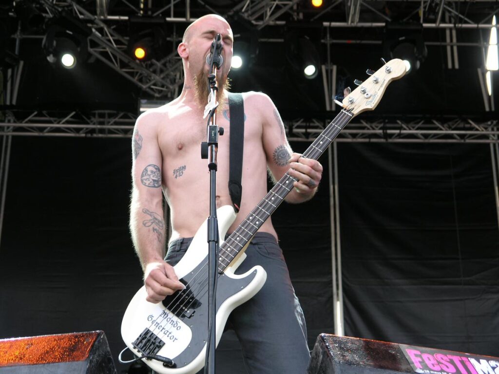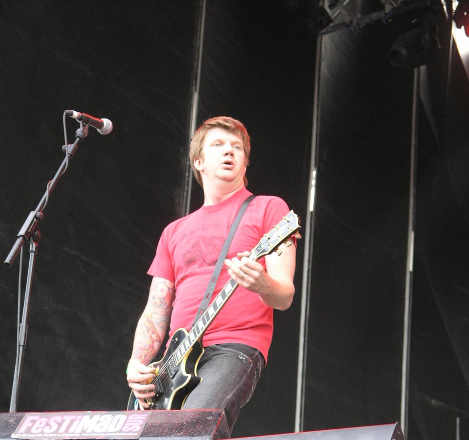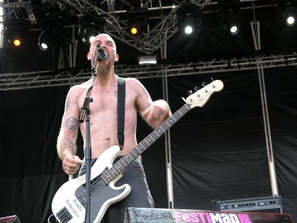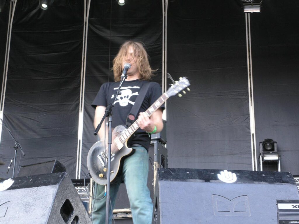 5 secondes après que la dernière gratte de FHJ soit posée, on entend les premières suaves vocalises de Nick Oliveri qui balance l’intro de « Six Shooter ». Et là, agréable surprise. Je m’étais toujours imaginé Mondo Generator comme un patchwork de musiciens faisant figuration derrière Oliveri, mais cette époque est révolue : désormais trio, le duo gratte-batterie de Winnebago Deal se démène sur scène comme deux beaux diables, comme si c’était leur groupe, finalement ! Résultat, ben musicalement ça assure ! L’homogénéité est là. Première surprise, donc. Deuxième surprise, le concert est bon, voire excellent, et les compos, un peu sous-estimées sur disque, ont une seconde vie en concert. Certes, le grand bassiste hurleur pioche allègrement dans le répertoire des Queens, mais bon On lui en aurait voulu de faire autrement, finalement, tant certains morceaux de QOTSA sont liés à la personnalité d’Oliveri. Troisième surprise, et pas la pire : on sent une véritable électricité dans l’air en voyant la silhouette ténébreuse d’un très ancien partenaire d’Oliveri monter sur scène pour le rejoindre. C’est ni plus ni moins que John Garcia, qui était avec Nick dans Kyuss en 1992 ! Plus de douze ans plus tard, un duo mythique foule donc les planches et se lance dans un « Allen’s Wrench » plus historique qu’autre chose, finalement : je ne sais pas si on écoute vraiment la musique et la qualité d’interprétation, dans ces moments-là. Magique.