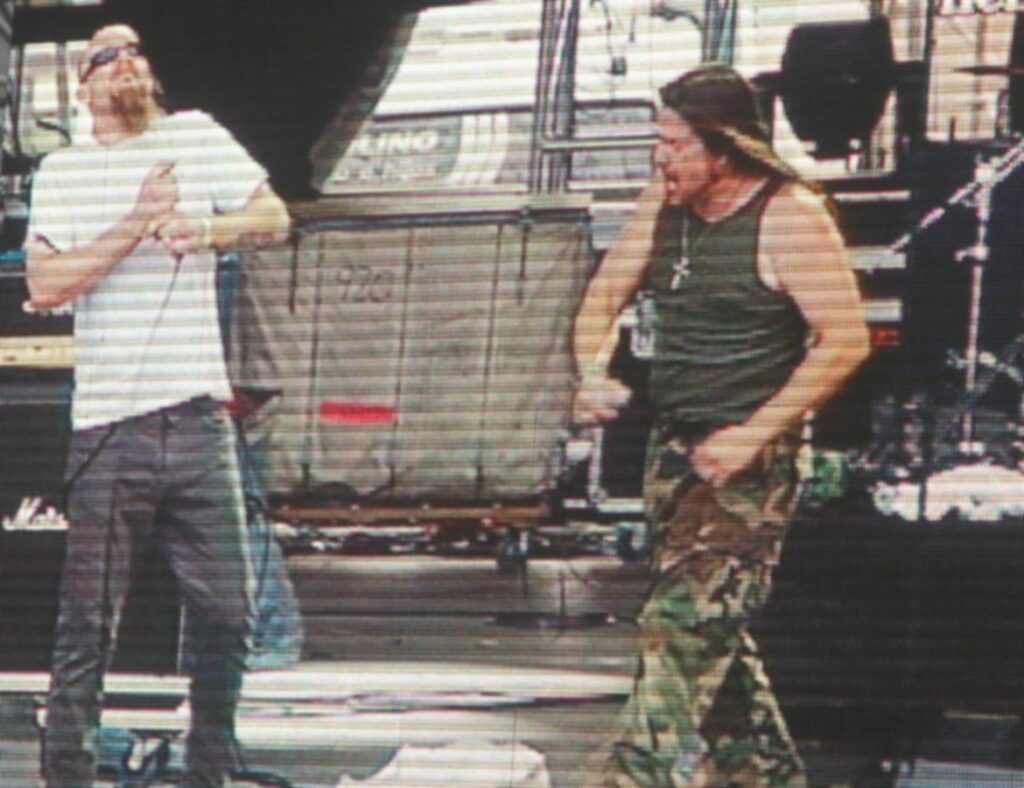 On croyait avoir tout vu en voyant le père Garcia rejoindre Mondo Generator sur scène tout à l’heure Et ben non, retour d’ascenseur : c’est Oliveri qui rejoint Hermano sur son terrain à la fin du concert Et la sincérité du geste, ainsi que l’émotion engendrée, sont palpables. On s’enlace, on partage son micro, on se sourit Le public n’existe plus, sur scène les musiciens se regardent, essayent quand même de jouer et chanter en même temps (ce qu’ils arrivent à faire de fort belle manière, je vous rassure ). Le groupe « bredouille » le début de « Wrench » (sur lequel Nick ne sait pas vraiment où et quand chanter), puis surtout « Green Machine », un morceau que Hermano joue à quasiment tous ses concerts. Les musiciens sont donc bien rodés, et Nick alterne le chant avec Garcia (quand Garcia lui fait signe de se lancer pour le couplet suivant ). Encore une fois, c’est bien la sincérité de la démarche qui touche le plus. C’est avec une petite boule dans la gorge qu’on voit les musiciens saluer le public et quitter la scène Quelle baffe !