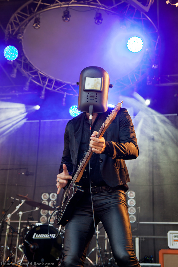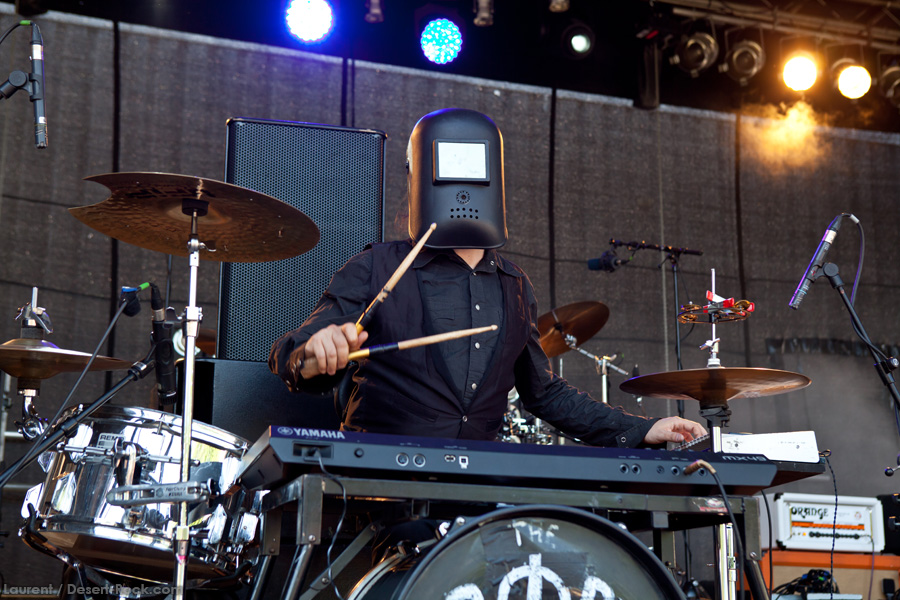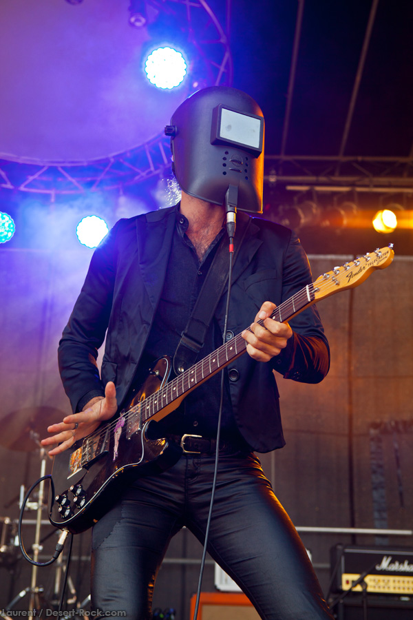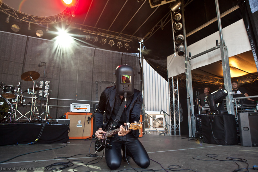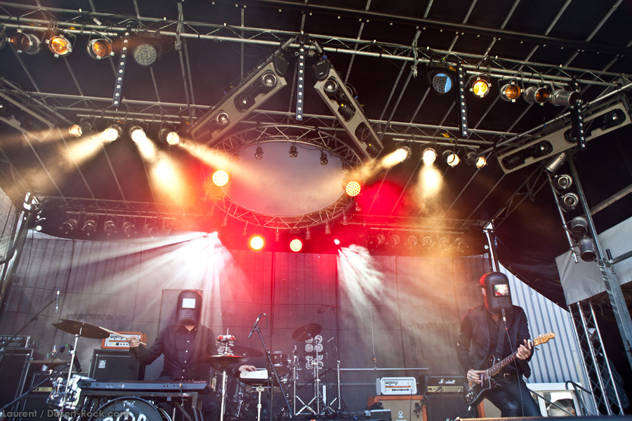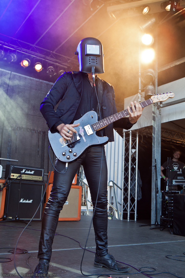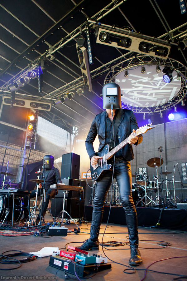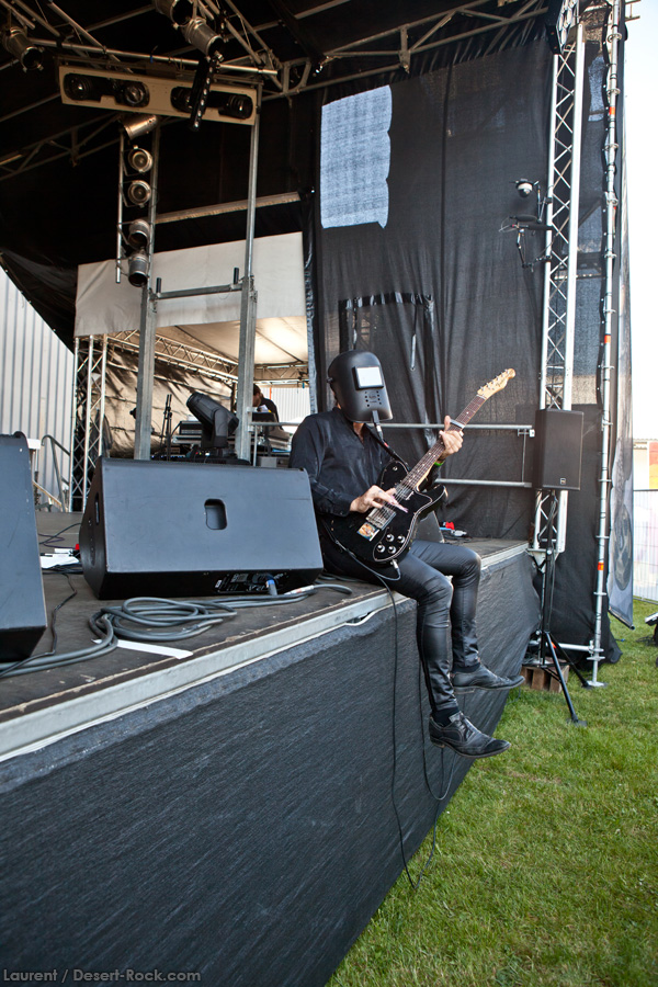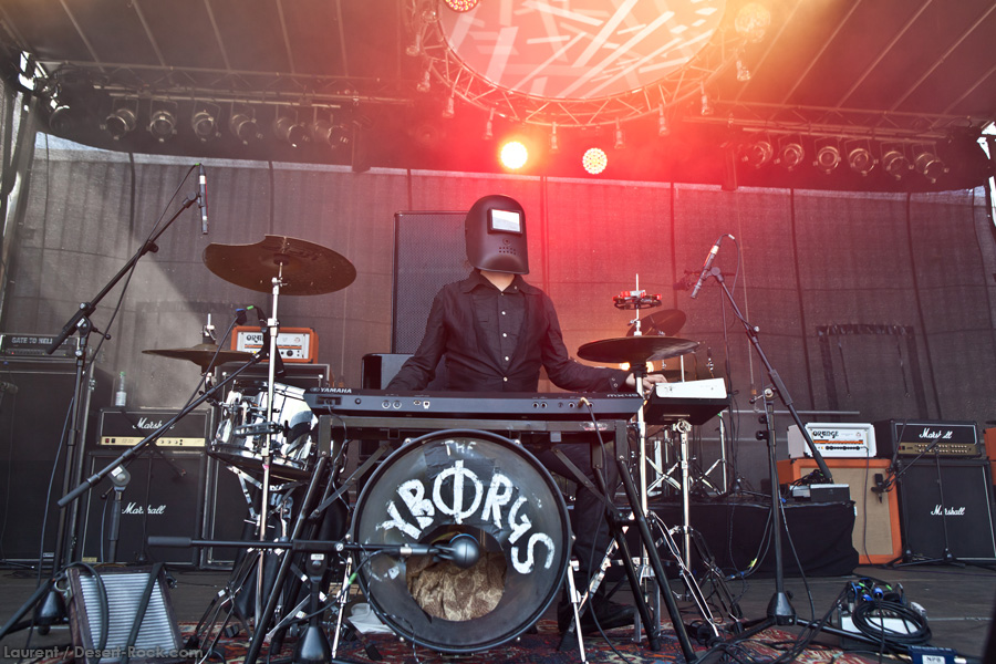 En ouverture de rideau, les transalpins adeptes de boogie électro ont remplacé Gas Giant initialement prévus pour le début des festivités. Heureusement à l’heure – car c’est toujours un sacré plaisir visuel que de se taper un show de ce duo – nous sommes fins prêts et en place pour le début des expérimentations sonores de Cyborg-0 ainsi que de Cyborg-1. Parés de leurs tenues de scènes sombres et affublés de leurs casques de soudeurs, les Italiens embrayent sitôt que le speaker, velu, a ponctué sa phrase annonçant la venue du duo de Rome avec leur style minimaliste à fort impact en public (en tous cas nettement plus que quand on les écoute sur disque allongé dans le sofa). Comme d’hab, la structure sonore est assurée par le membre aux commandes de son – euh, comment dire ça précisément – synthé joué de la main gauche alors que la droite est en charge de la baguette destinée aux cymbales et autres percus sises de part et d’autre du clavier, alors que ses pieds se chargent de battre la mesure sur la grosse caisse coincée sous le Yamaha (vous suivez ?). L’interaction verbale était assurée par ce bon vieux cyborg debout à la guitare dans un style nettement plus traditionnel.