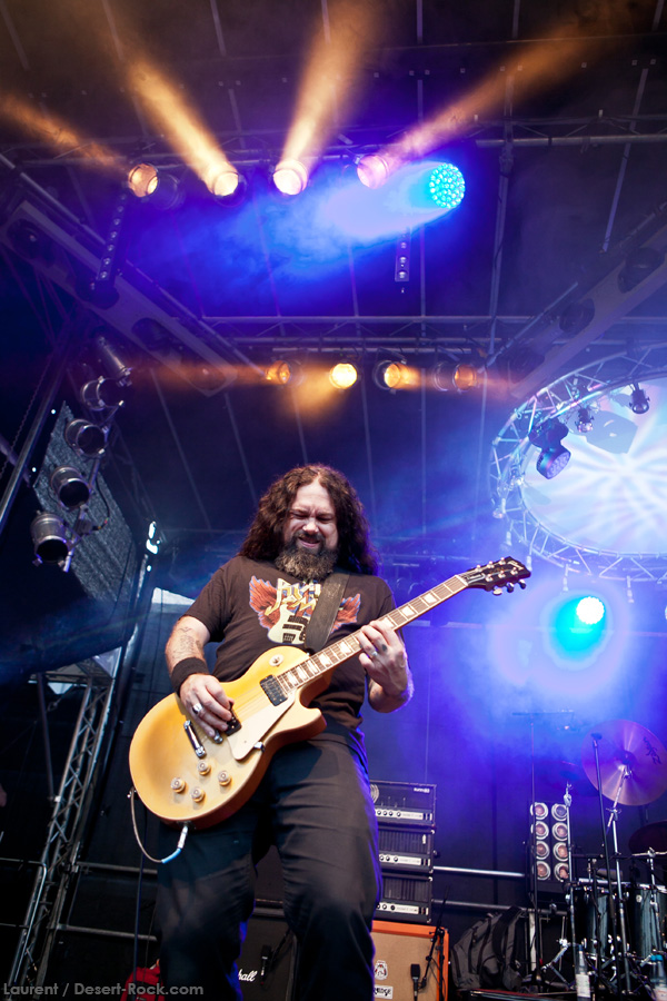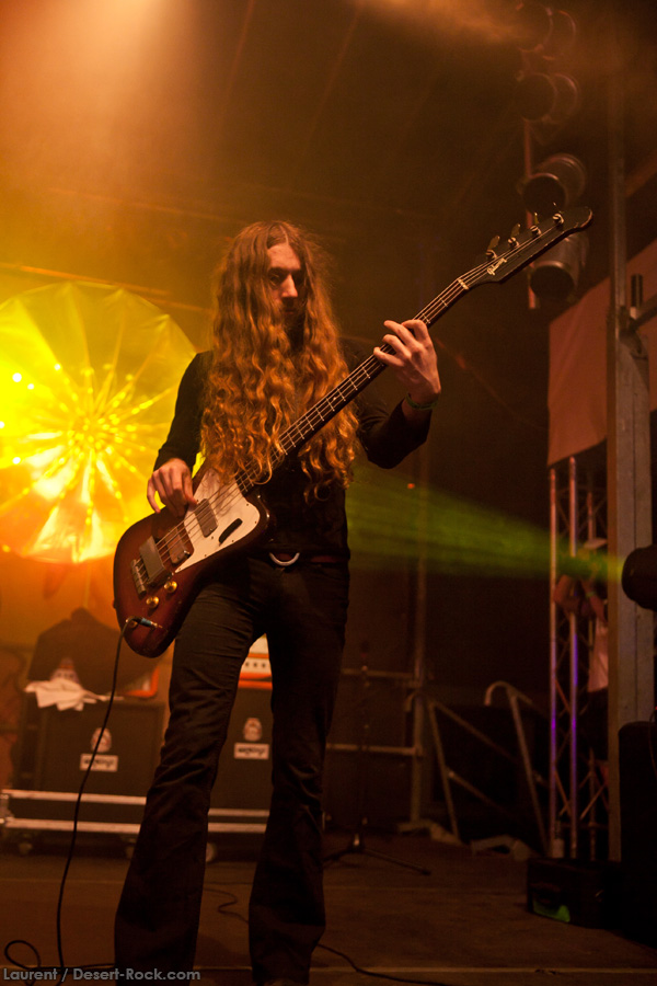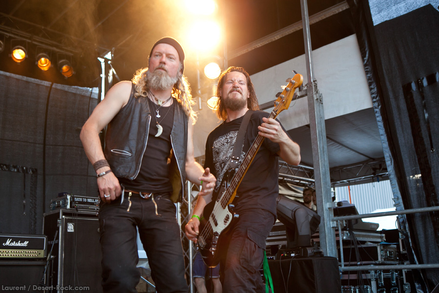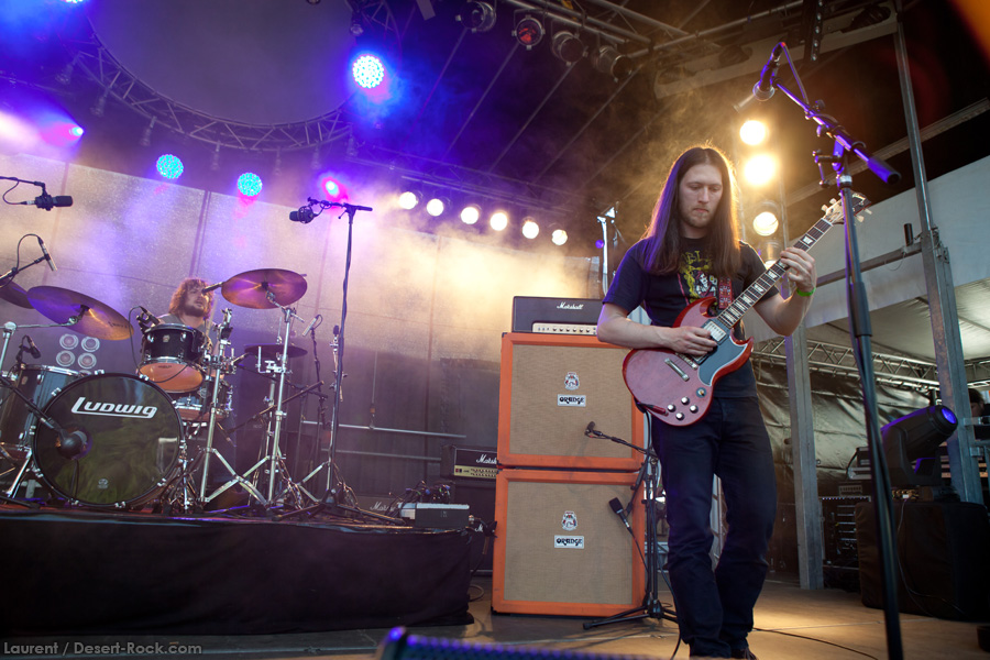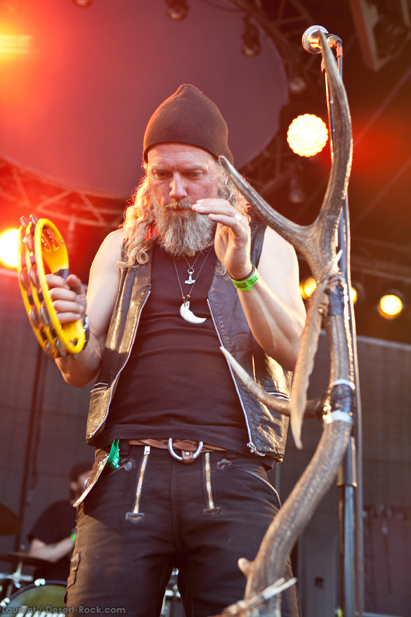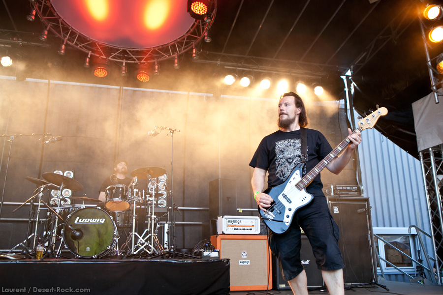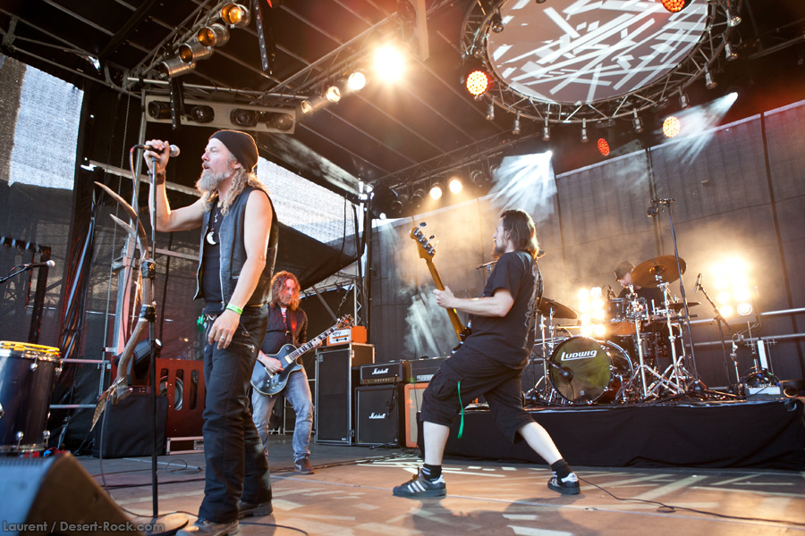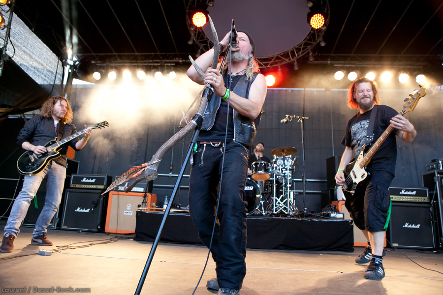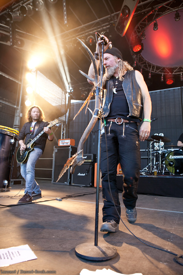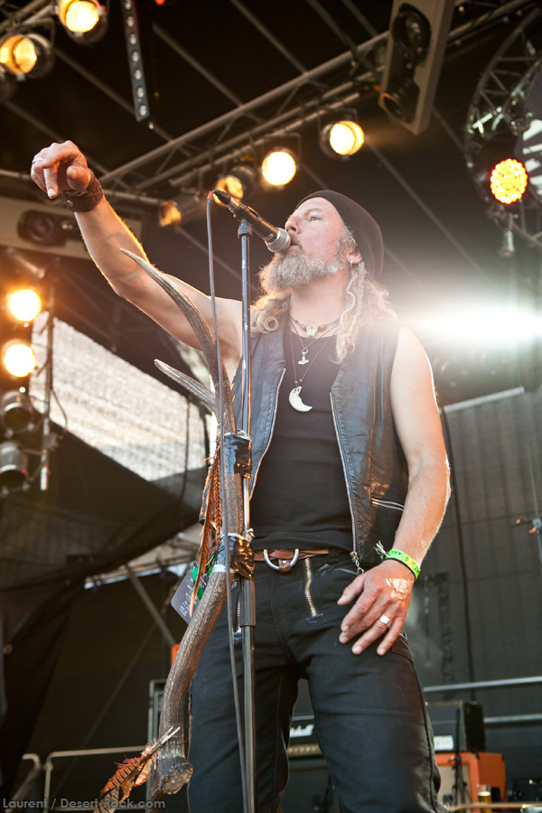 Le début de soirée est des plus agréables durant le week-end le plus chaud de l’année en Allemagne quand les vétérans danois attaquent leur heure de set. Ces mecs avaient disparu de nos écrans radars depuis quasiment une décennie et c’est avec une excitation certaine que nous prenons place dans la fosse à photographes (nous avons de la place car le moins que l’on puisse dire c’est que le groupe n’est pas le plus médiatique de la soirée). Le pied de micro orné d’une corne de cervidé avec son tambourin ainsi que son tambour flanqués sur ses côtés fait tout son effet et annonce le meilleur. Les lascars attaquent directement dans le gras ce qui génère rapidement un déplacement du public, bien inspiré, aux abords de la scène afin d’assister à ce concert (et du coup nous sommes moins seuls dans le secteur photographe). Nous avions un vague arrière-goût d’une formation aux sonorités proches de celles de l’écurie Small Stone des années deux-mille et nous n’allions pas être déçus par une prestation à la hauteur de nos attentes. La formule Gas Giant version 2015 a rapidement pris en live non seulement en ce qui concerne le son (qui dépote), mais aussi pour ce qui est du rendu visuel ainsi que de l’ambiance avec le moment tribal qui a fonctionné tip top. Après avoir balancé des titres issus de leur discographie quasi-complète, les vétérans scandinaves embrayent directement sur un rappel sans même effectuer la moindre pause afin d’optimiser les minutes restantes sur le temps de jeu. Le frontman charismatique pourra se targuer d’avoir remarquablement assuré son rôle sur scène alors que ses collègues envoyaient le gras avec panache. Franchement quel plaisir de se retaper des perles telles que « Never Leave This Way », « Too Stoned » et surtout « Storm Of My Enemies » – une réussite du genre ce fut.