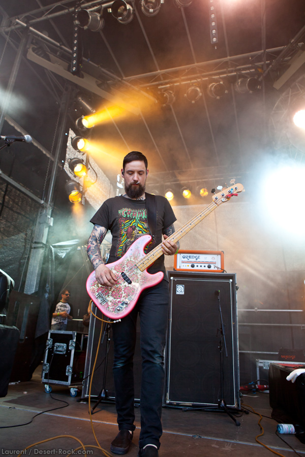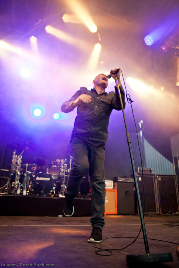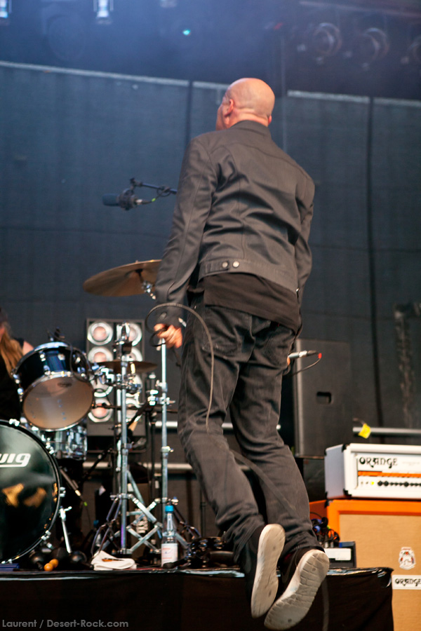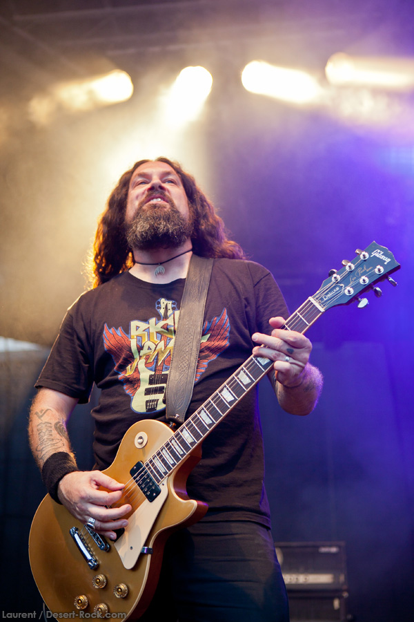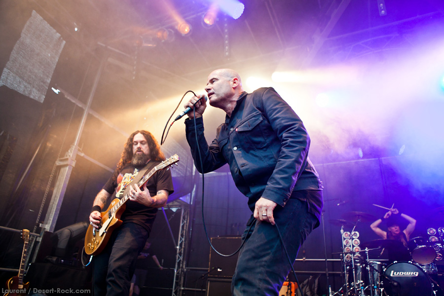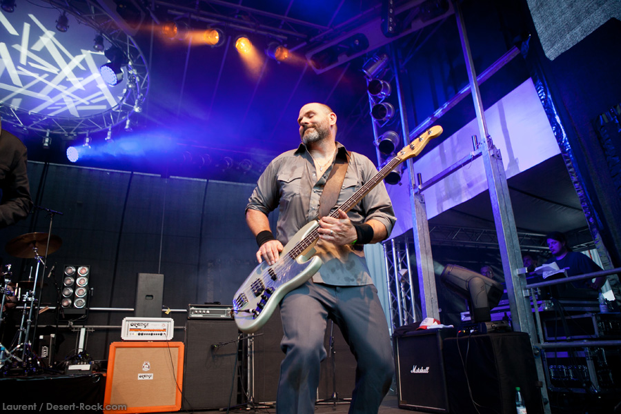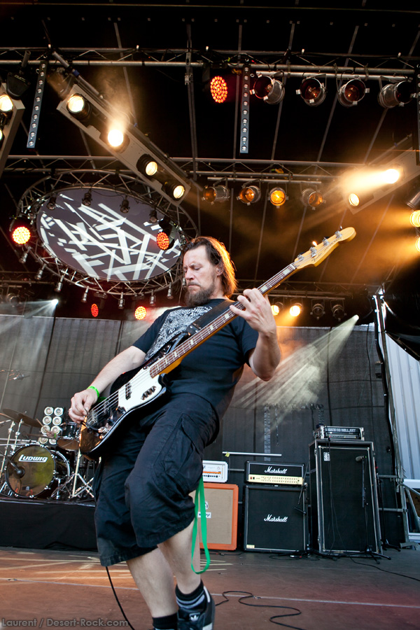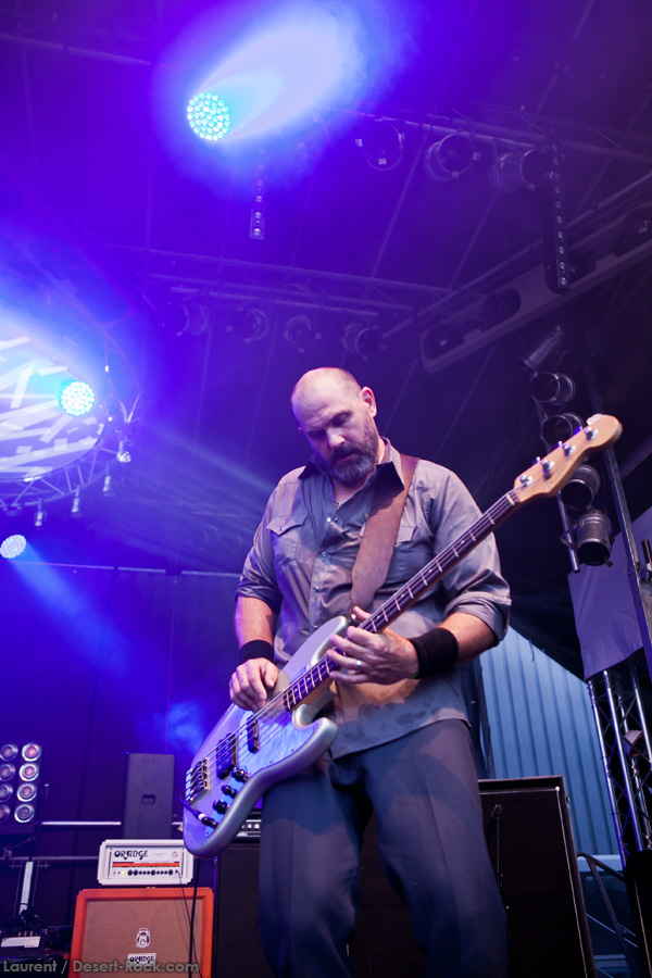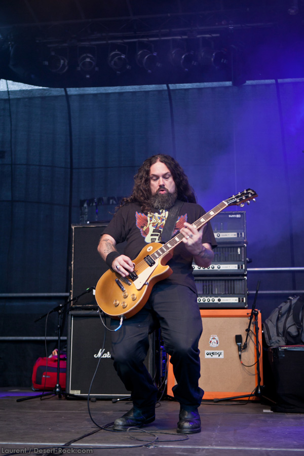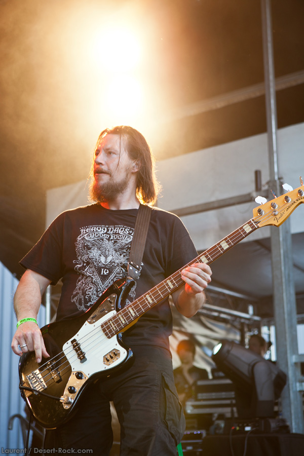 Ne nous leurrons pas : une large part du public est venue pour déguster le set des seigneurs américains de Goatsnake (vos serviteurs avouent piteusement être dans ce cas). La montée sur scène du légendaire quatuor et l’excitation qui en découle suffit à valider ce constat. Il faut dire que dans ce cas plus encore, la rareté de l’événement rend ce moment exceptionnel, dans tous les sens du terme. Les concerts du combo sont rarissimes, leurs tournées minuscules, et y assister est donc par nature un plaisir rare. Dans ce contexte, les premières riffs de « Slippin’ The Stealth », en outre premier titre de leur discographie, gravent la banane sur les visages des milliers de présents pour l’heure qui suit : gros son, grosse énergie, exécution impeccable. Les conditions d’un moment d’exception sont réunies, d’autant plus que le soleil écrasant de la journée commence à se coucher, permettant aussi aux lights sur scène de faire leur première apparition probante de cette journée. Lorsque Pete Stahl, déjà en nage dès l’intro de « Flower Of Disease » qui suit, s’en va au contact du public en descendant de scène, on comprend aussi que nos quatre gaillards ont bien prévu de tout donner ce soir. Ce sera aussi le cas des petits nouveaux, une section rythmique redoutable d’efficacité et de présence scénique. Tout en puissance tranquille Greg Anderson, enthousiaste et souriant, façonne des riffs venus de nulle part, occupant la part belle d’une mise en son impeccable. Quant à Pete Stahl, il attire et capte tous les regards : il danse, se contorsionne, saute, se roule par terre, sans jamais manquer une ligne de chant, ce chant atypique, toujours nonchalamment nasillard, puissant et charmeur. Les nouveaux titres joués ce soir (« Black Age Blues », « Graves », le monstrueux « A Killing Blues »…) trouvent leur place toute naturelle dans un set explorant par ailleurs de manière minimaliste toutes les facettes de la carrière du groupe. Le groupe conclut son set par un « Mower » dantesque, riche, qui devient de fait le point culminant d’un set trop court, qui nous laisse exsangues. Quelle majesté…
