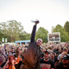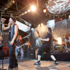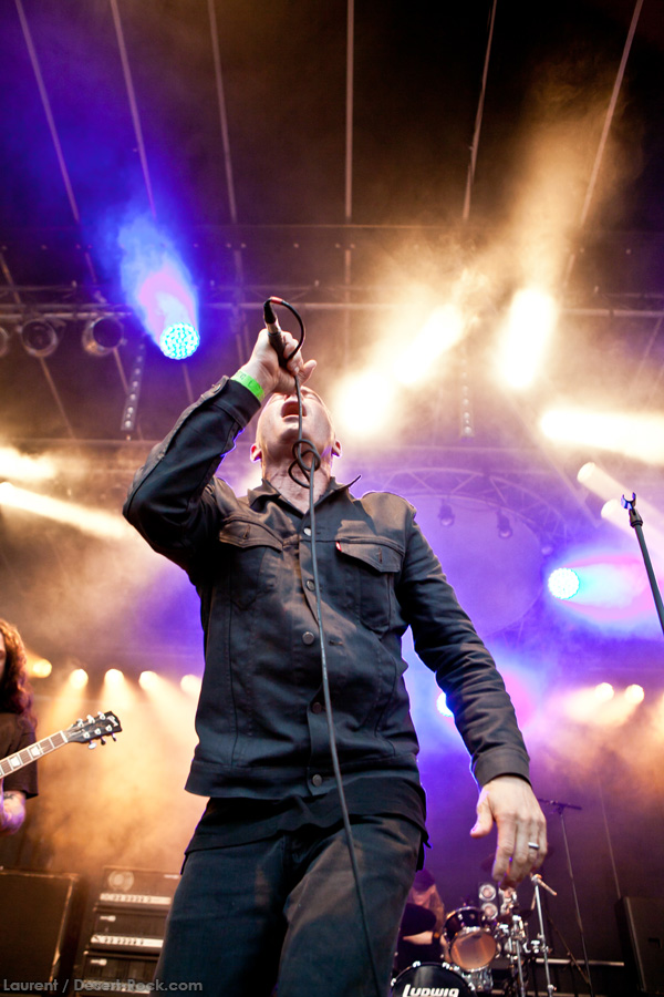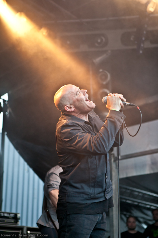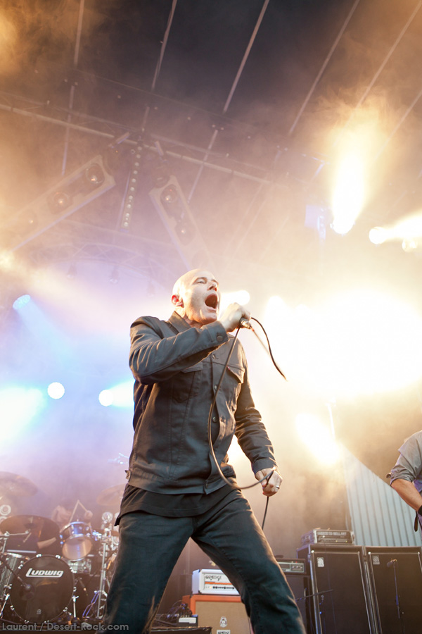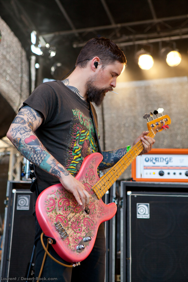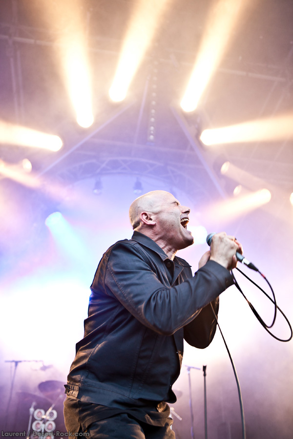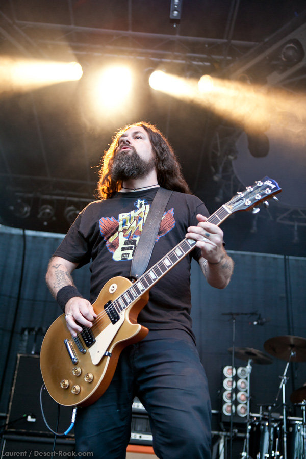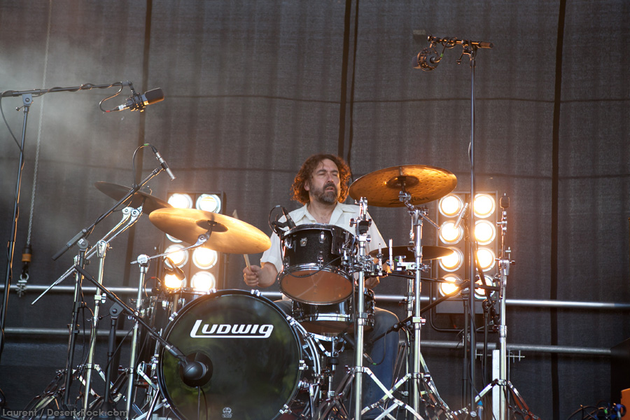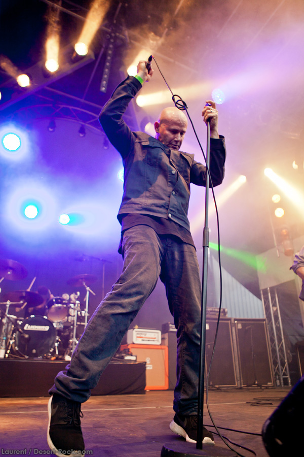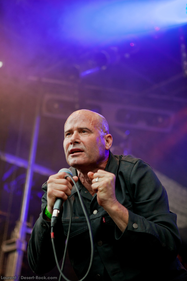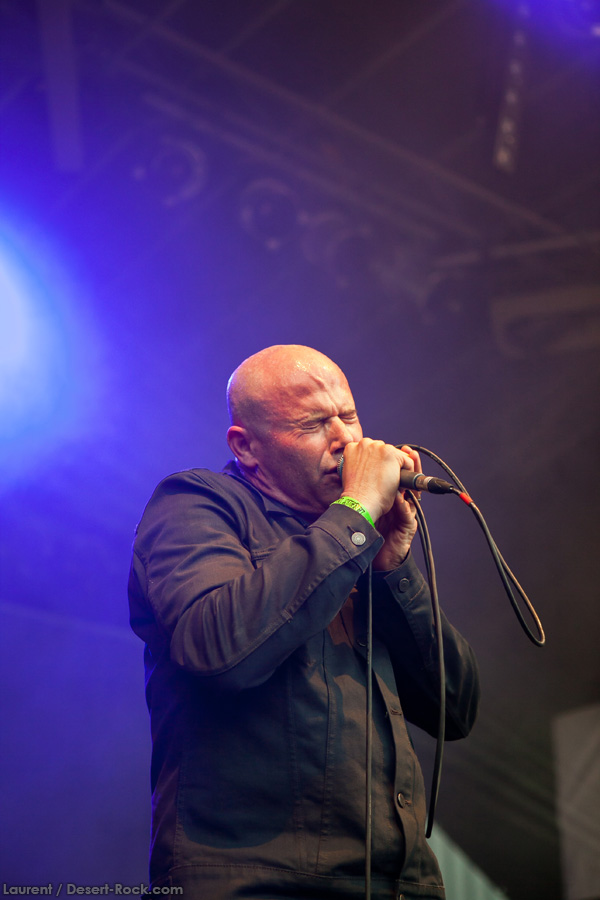 Ne nous leurrons pas : une large part du public est venue pour déguster le set des seigneurs américains de Goatsnake (vos serviteurs avouent piteusement être dans ce cas). La montée sur scène du légendaire quatuor et l’excitation qui en découle suffit à valider ce constat. Il faut dire que dans ce cas plus encore, la rareté de l’événement rend ce moment exceptionnel, dans tous les sens du terme. Les concerts du combo sont rarissimes, leurs tournées minuscules, et y assister est donc par nature un plaisir rare. Dans ce contexte, les premières riffs de « Slippin’ The Stealth », en outre premier titre de leur discographie, gravent la banane sur les visages des milliers de présents pour l’heure qui suit : gros son, grosse énergie, exécution impeccable. Les conditions d’un moment d’exception sont réunies, d’autant plus que le soleil écrasant de la journée commence à se coucher, permettant aussi aux lights sur scène de faire leur première apparition probante de cette journée. Lorsque Pete Stahl, déjà en nage dès l’intro de « Flower Of Disease » qui suit, s’en va au contact du public en descendant de scène, on comprend aussi que nos quatre gaillards ont bien prévu de tout donner ce soir. Ce sera aussi le cas des petits nouveaux, une section rythmique redoutable d’efficacité et de présence scénique. Tout en puissance tranquille Greg Anderson, enthousiaste et souriant, façonne des riffs venus de nulle part, occupant la part belle d’une mise en son impeccable. Quant à Pete Stahl, il attire et capte tous les regards : il danse, se contorsionne, saute, se roule par terre, sans jamais manquer une ligne de chant, ce chant atypique, toujours nonchalamment nasillard, puissant et charmeur. Les nouveaux titres joués ce soir (« Black Age Blues », « Graves », le monstrueux « A Killing Blues »…) trouvent leur place toute naturelle dans un set explorant par ailleurs de manière minimaliste toutes les facettes de la carrière du groupe. Le groupe conclut son set par un « Mower » dantesque, riche, qui devient de fait le point culminant d’un set trop court, qui nous laisse exsangues. Quelle majesté…