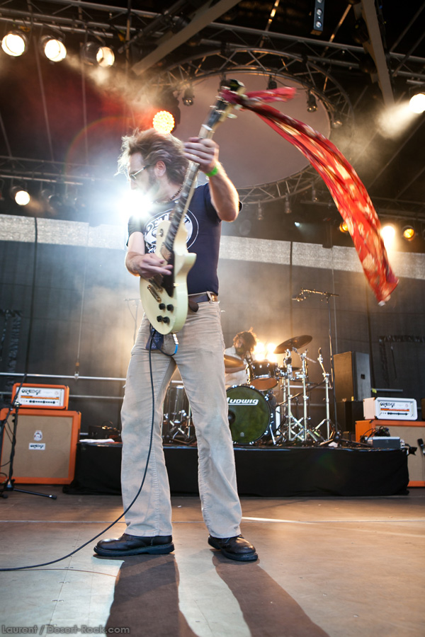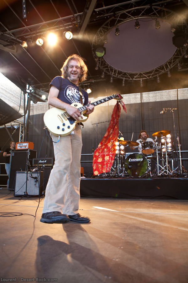 Les lascars déballent la panoplie complète de leurs gimmicks scéniques durant le temps alloué pour leur prestation : expérimentations musicales avec le concours des quidams agglutinés derrière la barrière, interactions de la moitié du couple avec les instruments de l’autre (si possible avec une partie des accessoires perso pour corser le tout) et occupation de tout l’espace visuel (et scénique) par l’être debout (une prouesse pour ce duo à moitié immobilisé) voire à deux collés contre les premiers rangs. Question titres, ils ont plutôt bien assuré avec l’imparable « Cyborgs Boogie » dont il est difficile de se défaire même des heures après le concert et une réinterprétation très personnelle d’un standard Muddy Waters durant lequel Cyborg-1 s’était levé pour jouer du washboard alors qu’un dispositif tout personnel lui permettait d’actionner la grosse caisse à l’arrière depuis le bords de la scène. Carton plein pour ce groupe à part et pas vraiment dans le style du festival (en a-t-il vraiment un ?).
