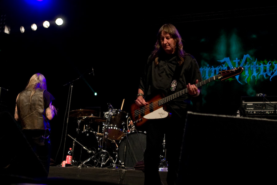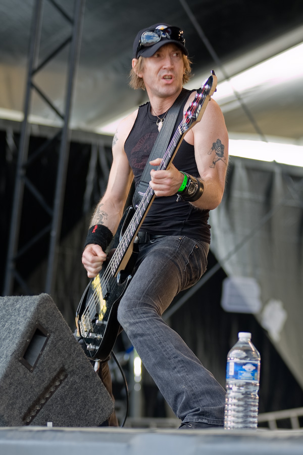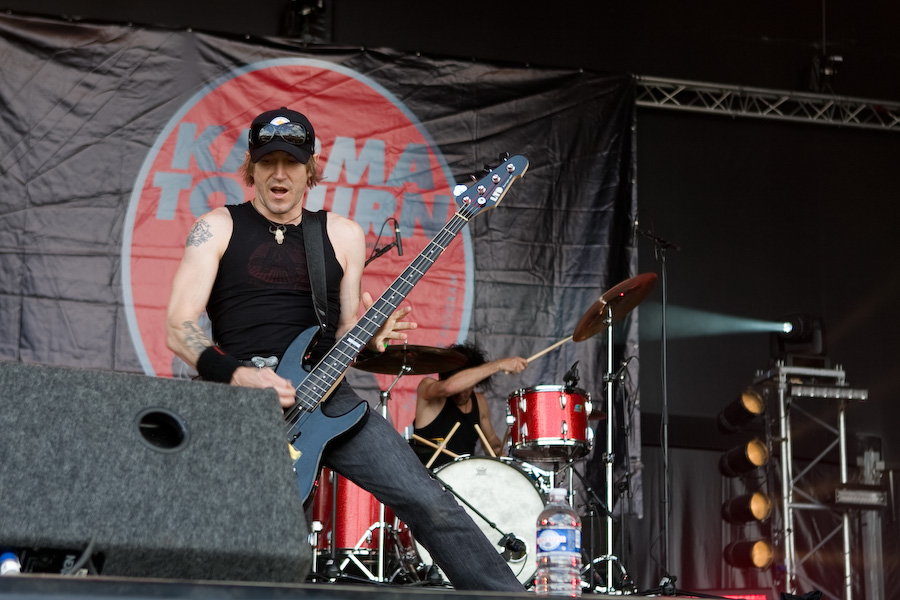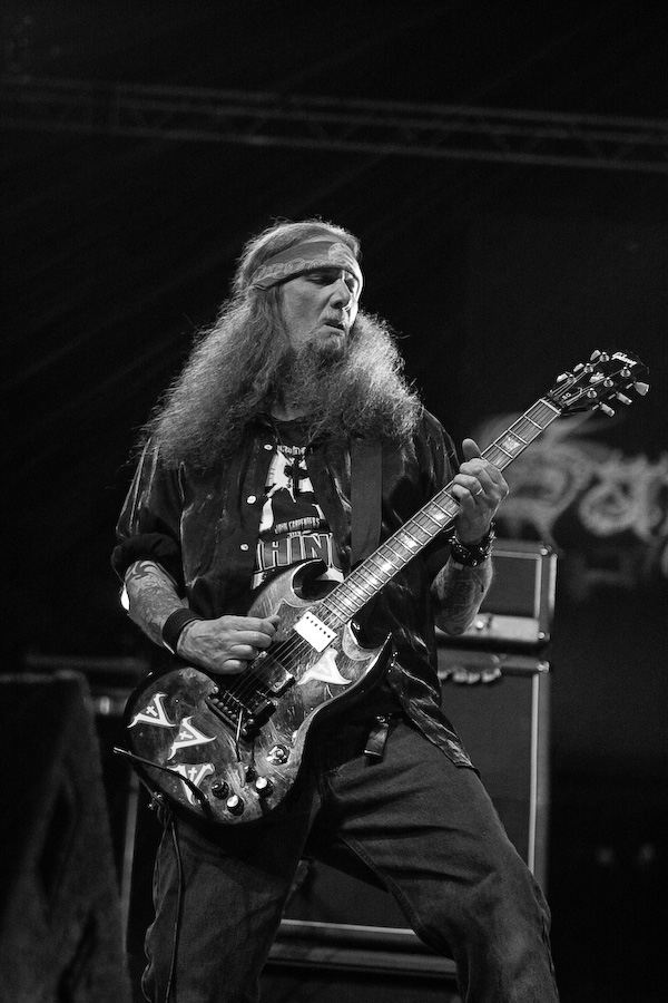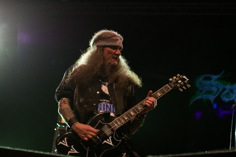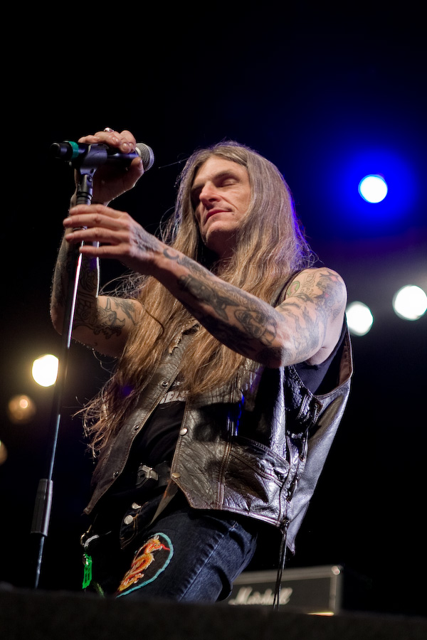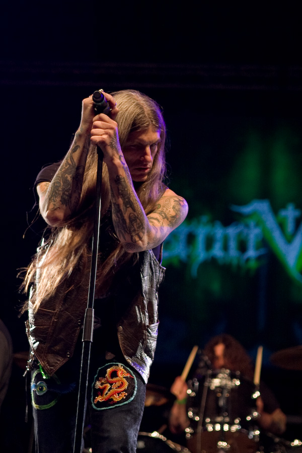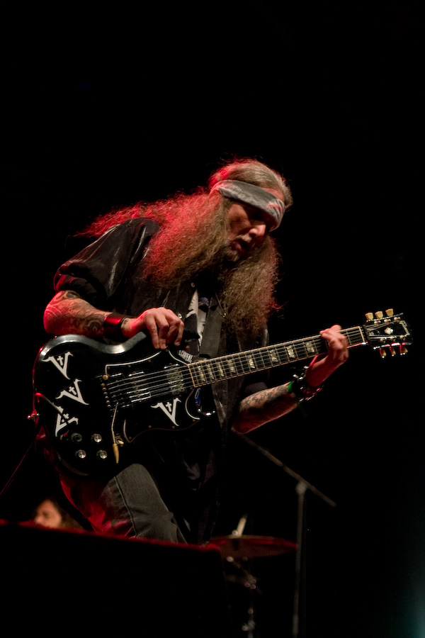 Les concerts de Anthrax (bien péchu… pas mal ce nouveau chanteur, même si ça me fait mal de le dire !) et de Heaven & Hell (horaire probablement trop tardif pour les papis : on ne peut pas vraiment dire qu’ils avaient une pêche et une bonne humeur comunicatives…) viennent compléter la soirée pour mieux nous préparer aux berceuses de… St Vitus ! Le légendaire quatuor de doomsters menés par Wino Weinrich, reformé officiellement depuis quelques années (et ravivé à l’occasion de quelques événements ici ou là) surprend rapidement par sa fougue et sa bonne humeur ! Même si les musiciens ne sont pas non plus des boute-en trains, ils sont non seulement heureux d’être là (les sourires entre eux ne trompent pas) et ont sacrément la pêche : il faut voir le sieur Chandler, bandana « 70’s » autour de la tignasse, sauter et tournoyer sans cesse, et Wino se balancer derrière son micro en grimaçant pendant une heure ! Un Wino impeccable, soit dit en passant, qui se cantonne ici au chant, et nous rappelle avec sa voix chaude pourquoi il a acquis ce statut culte parmi le petit monde des stoner-fans… Excellent show, qui nous permet de passer une heure avec le sourire, avant de se gauffrer les gros mégalos de Mötley Crüe (prestation calamiteuse, courte et sans passion, pas à la hauteur d’une tête d’affiche de festival).