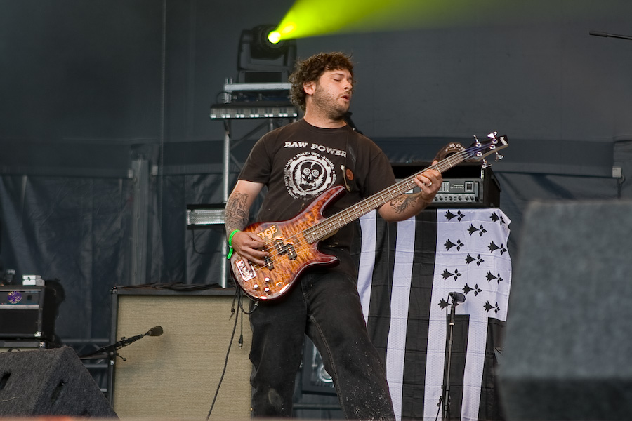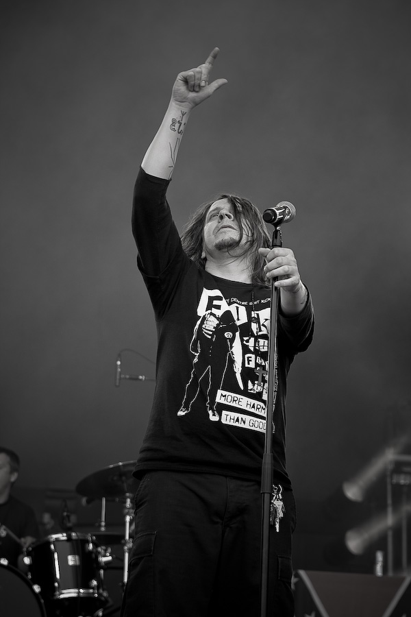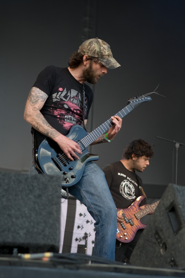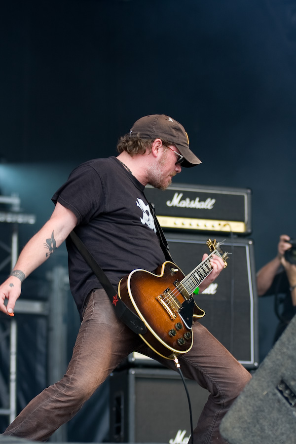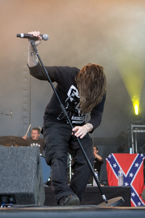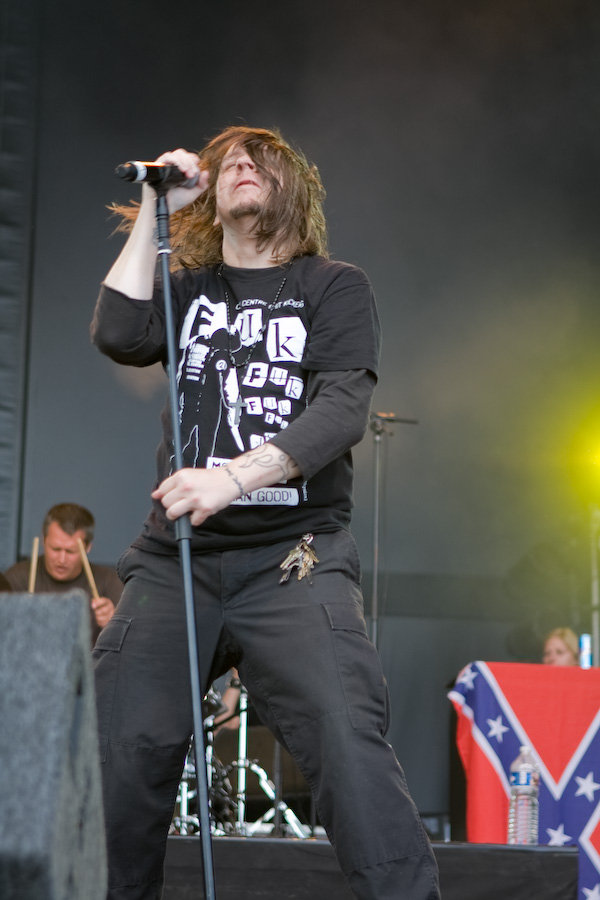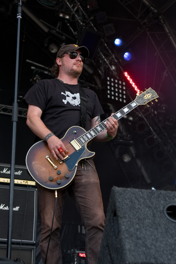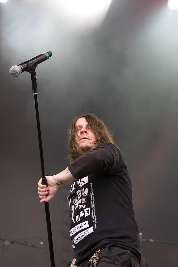 Après une petite pause relax avec notamment les Backyard Babies, un public de die-hards se masse devant la main stage 2 pour l’arrivée des cultissimes Eyehategod. D’ailleurs, un détail ne trompe pas : les musiciens d’autres groupes occupent totalement les côtés de la scène, à l’image de Phil Anselmo (Down), qui n’arrêtera pas de headbanguer de tout le concert, de venir sur scène pour saluer les zicos, et même prendre la gratte à son pote Jim Bower sur un titre complet ! Musicalement, les je-m’en-foutistes de la Nouvelle Orléans enquillent les titres les plus massifs de la journée : des tempos lents, lourds, servis par des riffs de gratte accordés 3 tons trop bas et une basse ronflante… Pachydermique, mais diantrement efficace. Le succès rencontré auprès du public dépasse la vague réputation « culte » du groupe, un excellent concert.
