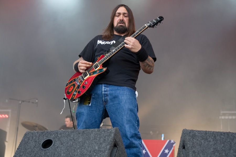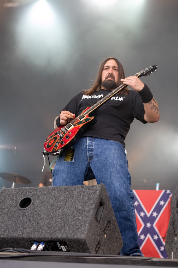 S’enchaînent ensuite les prestations un peu moins stoner de Kylesa (gros succès public) et Entombed (idem, un pit de folie), qui ne font que préparer les oreilles pour l’un des shows les plus attendus du public : Down, sur la main stage n°2. Le groupe monte sur scène avec une envie d’en découdre évidente, ce qui fait chaud au coeur (Down peut à d’autres occasions paraître « en roue libre »…). Le co-leadership du groupe est assuré par Pepper Keenan, qui se donne à fond, et évidemment Phil Anselmo : ce dernier, frontman efficace, ne prend pas vraiment le pas sur ses co-équipiers, et l’impression de « vrai groupe » qui se dégage de ce fait participe vraiment à l’efficacité de cette machine bien huilée. Même si Rex et le père Windstein restent un peu en retrait, tout le monde abat sa part avec envie, à l’image de Jimmy Bower, qui martèle ses fûts avec fougue alors qu’il enquillait les riffs quelques heures plus tôt à peine avec ses collègues de Eyehategod. Les morceaux des 3 albums du groupe défilent (pas assez de « Nola » à mon goût…). Impeccable.