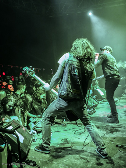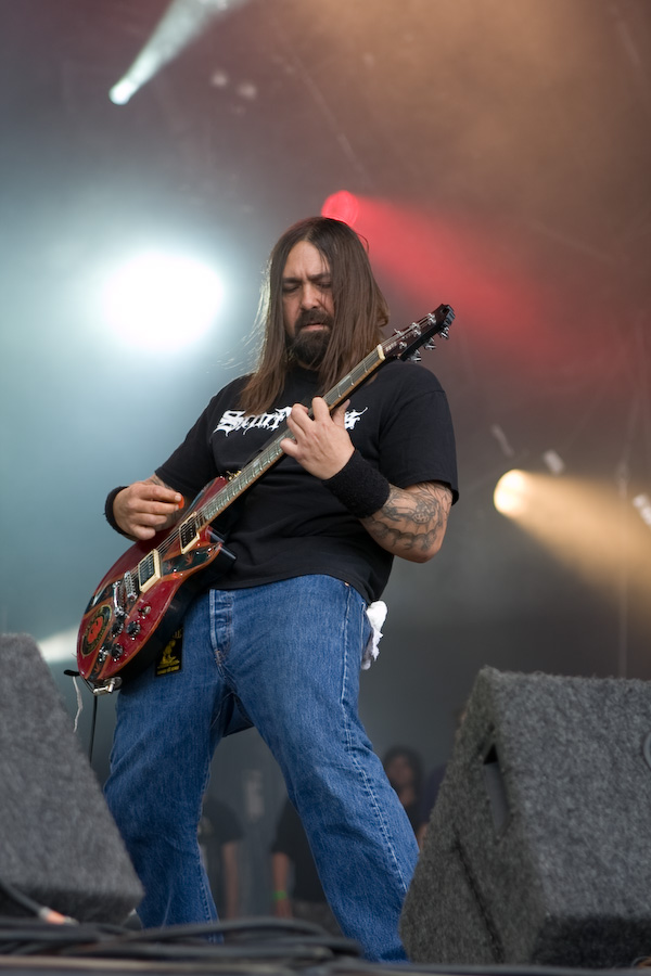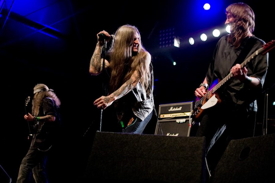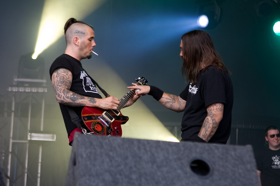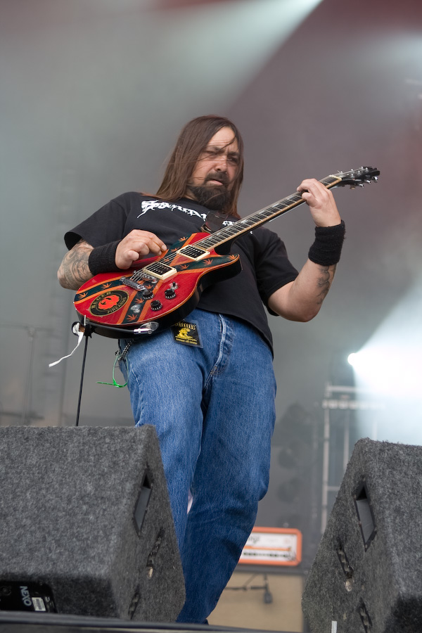 Une heure plus tard, on nous annonce une pause imprévue, et probablement la plus mauvaise nouvelle du festival : Pentagram a dû annuler son concert ! Dégouté… L’heure peut donc être passée à noyer sa tristesse dans l’alcool… Dont acte. Sans conviction, je me traîne jusqu’à la tente Terrorizer pour assister au show d’un groupe dont on m’a vaguement parlé : Torche. Et quelle claque ! Evoluant dans une sorte de sludge metallisé très carré et très technique, le trio se révèle, en plus de musiciens vraiment accomplis, un grand groupe de scène : non seulement ils sont à fond dedans, mais l’interaction avec le public va au delà de l’excellente musique qu’ils proposent. Encore une fois, voilà 3/4 d’heure de baston sonore qui m’ont donné le sourire. La découverte de la journée !