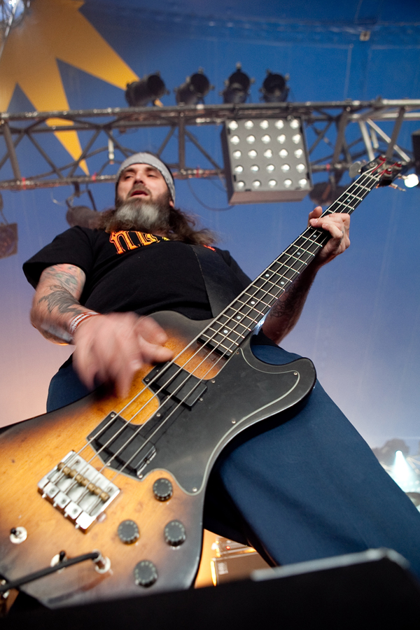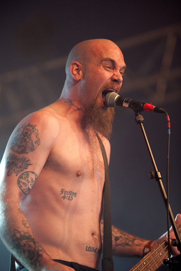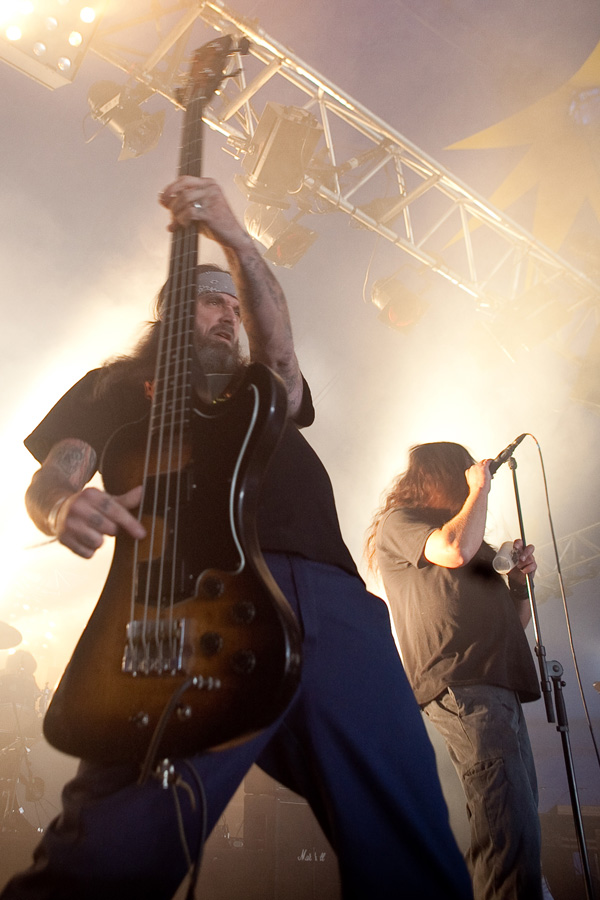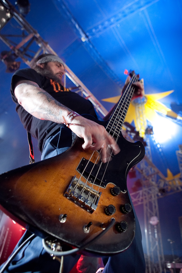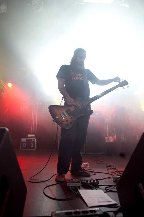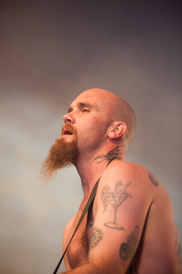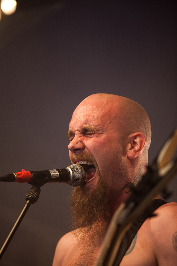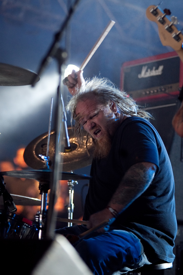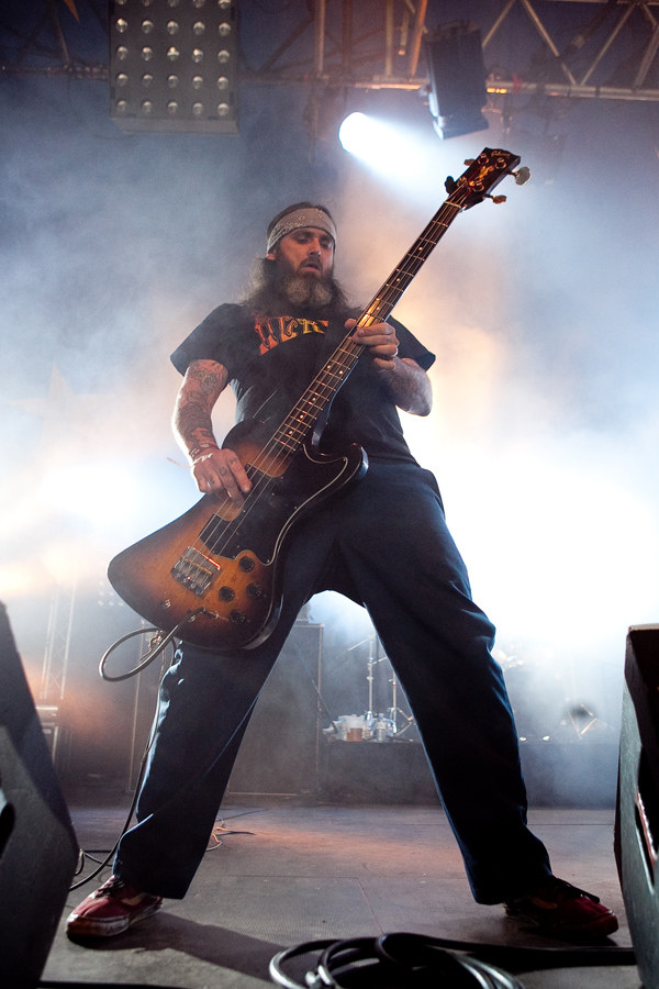 Retour au sludge avec WEEDEATER, des anciens Buzzov-En bien entamés du bulbe. Complètement barré sur scène, Dixie Collins vomit ses vocaux en grimaçant comme un débile consanguin, danse comme un hillbilly, le tout en assurant ses parties de basse. Son duo avec le batteur déjanté Keko (dont le kit est posé juste au bord de la scène, initiative intéressante !) assure le spectacle. Les titres bien catchy et accessibles du trio cartonnent, et Nick Oliveri, qui est arrivé sur le site un peu plus tôt, s’éclate pendant leur set sur le bord de la scène. Excellent.