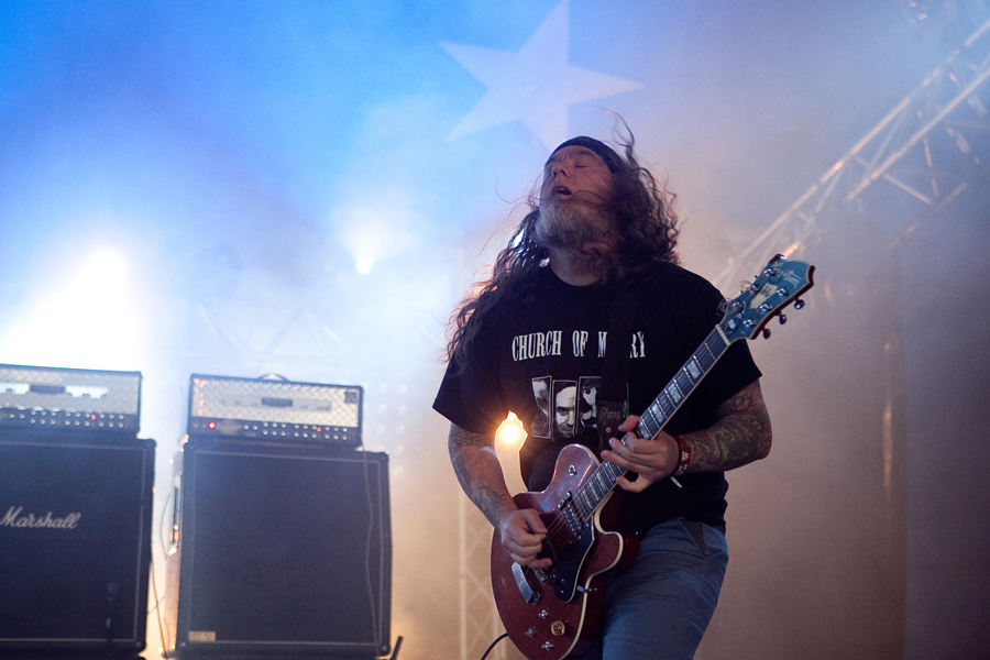 Alors que la tente Terrorizer est dédiée au stoner pour toute la journée, on ne peut qu’être dubitatif sur l’ajout de quelques groupes qui viennent « perturber » l’ambiance qui règne dans ce public d’aficionados. C’est le cas de 16, qui même s’il garde un esprit très sludge, détonne quand même en prenant la suite du super culte Solace. Cris, son chanteur, est clairement la pierre angulaire de l’édifice, avec son physique de bagnard condamné à perpète, il arpente la scène de long en large, vomissant ses tripes sur chaque titre de ce set pêchu, et finalement plutôt sympathique !