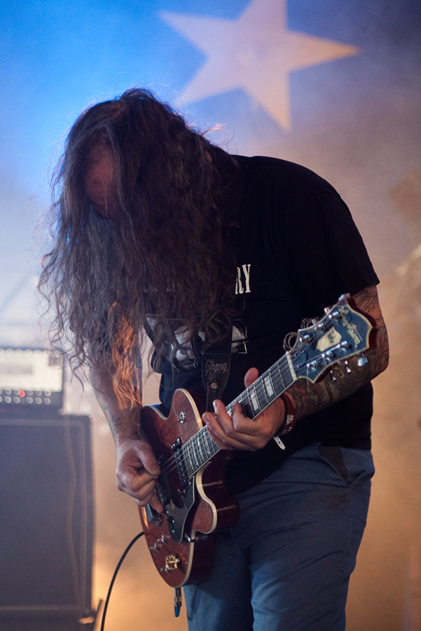 Mais heureusement, je ne rate pas les cultissimes SOLACE, l’un des groupes qui justifiaient à eux seuls d’être présents ! Les retrouver si tôt dans la journée, aussi bas sur l’affiche, relève en revanche de la plus grande aberration. Quel gâchis pour ce groupe culte ! Pas de quoi gâcher notre plaisir d’être là néanmoins. Le groupe américain, ayant atterri en Europe la veille, n’y prête aucune attention : ils sont là pour dérouler leur meilleure musique, sans retenue. Et le déluge de stoner coule des amplis pendant 30 minuscules minutes, mais dont le groupe profite à fond pour composer un set splendide. Ce dernier pioche un peu dans « A.D. », la récente galette sortie chez Small Stone, mais aussi dans les sorties plus anciennes. Tandis que Tommy Southard et son look totalement improbable (short en jean, chaussettes multicolores…) assure la quantité syndicale de riffs sur un concert de cette trempe, Rob Hultz se la joue « bass hero » en larvant la musique du combo de ses lignes de basse infectieuses. Jason au chant assure, sans pour autant monopoliser la place de frontman, un rôle partagé par l’ensemble des zicos. Superbe set, qui nous donne la banane pour le reste de la journée.