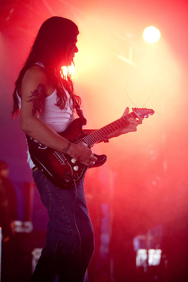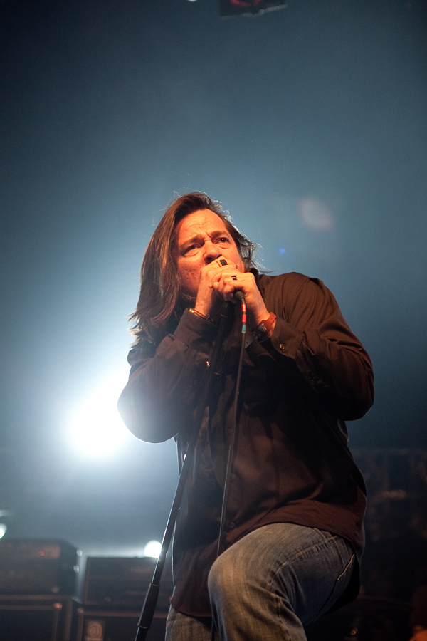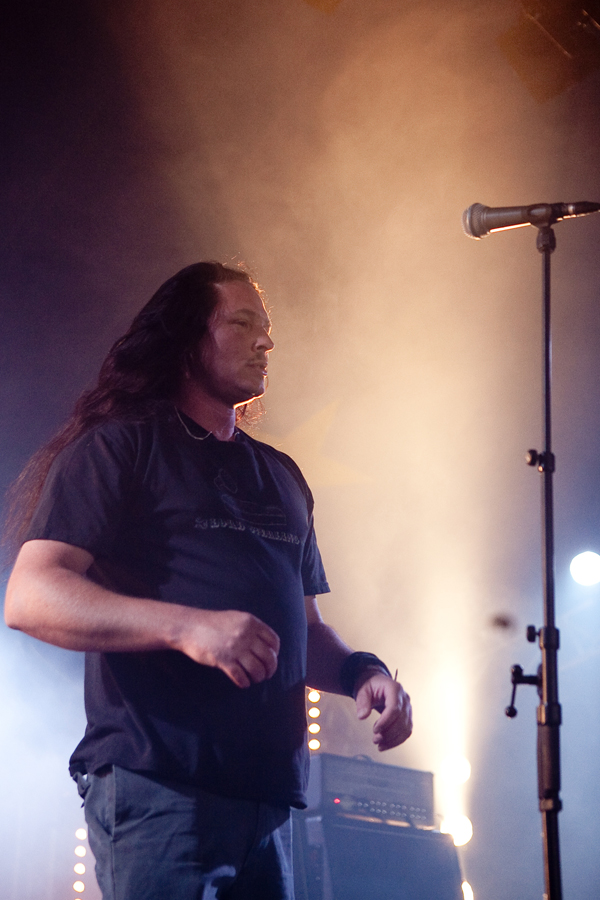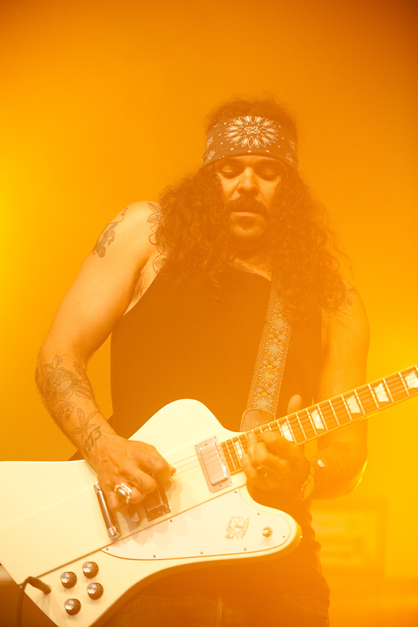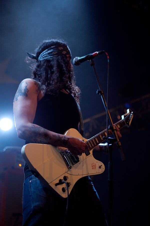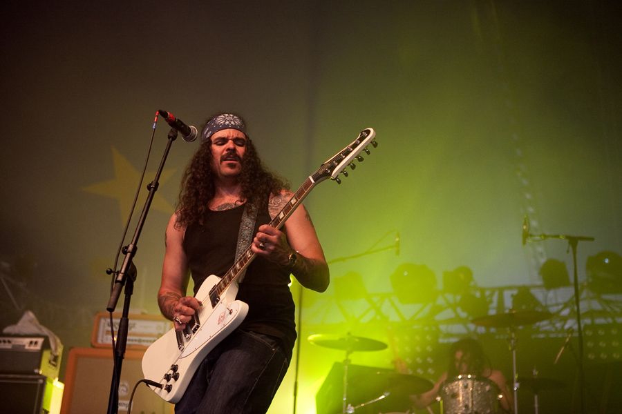 En effet, John Garcia, sous sa configuration GARCIA PLAYS KYUSS se prépare à monter sur scène sous la Terrorizer. De manière toute à fait emblématique et hautement symbolique, le set commence par un titre instrumental de Kyuss, « Asteroid », avec uniquement sur scène les 3 musiciens néerlandais qui épaulent le chanteur sur cette tournée. Le message est clair : Kyuss, c’est avant tout la musique, et seulement « entre autres » une voix. Cela remet les choses en places pour ceux qui croient le bonhomme présomptueux et doté d’un ego démesuré ; il est en réalité modeste et reconnaissant. Garcia débarque donc sur scène sur le 1er titre, « Thumb ». Pas l’entrée en matière la plus directe, mais très vite le ton est donné par l’intermédiaire d’une succession de classiques (« One Inch Man », « Hurricane »…). Et puis alors que le feeling commence à bien prendre progressivement, on remarque que même si la magie de Kyuss est irremplaçable, on prend un sacré plaisir à écouter ces titres. Et on n’est pas les seuls : le public est incandescent ! La tente est d’ailleurs ultra-bondée… Instrumentalement, ça joue bien, voire techniquement très bien. Certes, le son de basse rondouillard et ronflant de Scott Reeder est ici plus clair et carré, la guitare graveleuse et aérienne de Homme paraît plus acérée et claire… Mais les chansons sont là, les musiciens très compétents, et Garcia se donne à fond derrière ces (ou plutôt « SES ») titres, au top vocalement de ces dernières années. Alors que l’on commence à sérieusement prendre notre pied, arrive un moment que l’on attendait tous (et qui a été improvisé quelques instants plus tôt backstage), alors que Jacques de Haard cède sa place de bassiste à Nick Oliveri ! Le groupe entame « Freedom Run » sous cette configuration, avec un Oliveri presque timide, évoluant sans micro dans son coin, « presque » concentré sur son jeu de basse… Frissons renforcés quelques morceaux plus tard quand Oliveri garde le poste de bassiste et que… Brant Bjork prend les baguettes derrière le kit de batterie de Rob Snijders ! Comme beaucoup le diront depuis, 3/4 de Kyuss se trouve à entamer « Gardenia » puis « Green Machine » sous nos yeux ! Le tout dans une ambiance manifeste d’amitié franche et sincère entre ces musiciens. Énorme expérience… La fin du concert voit d’autres classiques défiler, et le set se prolonger bien plus que le timing initialement prévu ! Encore chaud, Garcia voudra même remonter sur scène après un rappel, mais l’horaire étant tellement dépassé, le régisseur l’interrompt un peu abruptement.