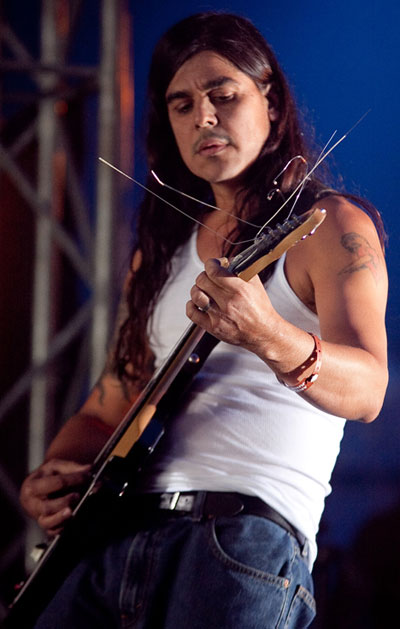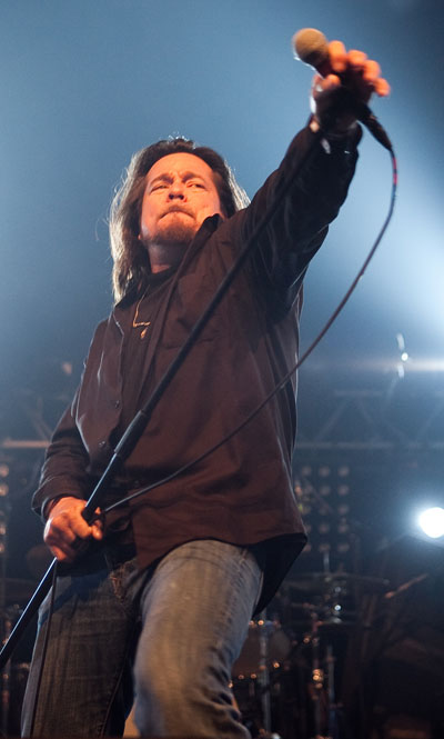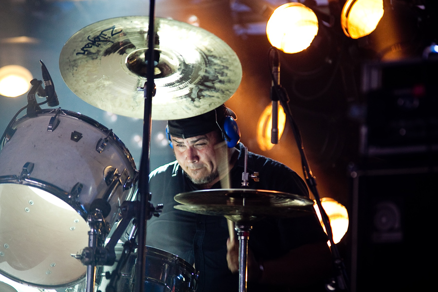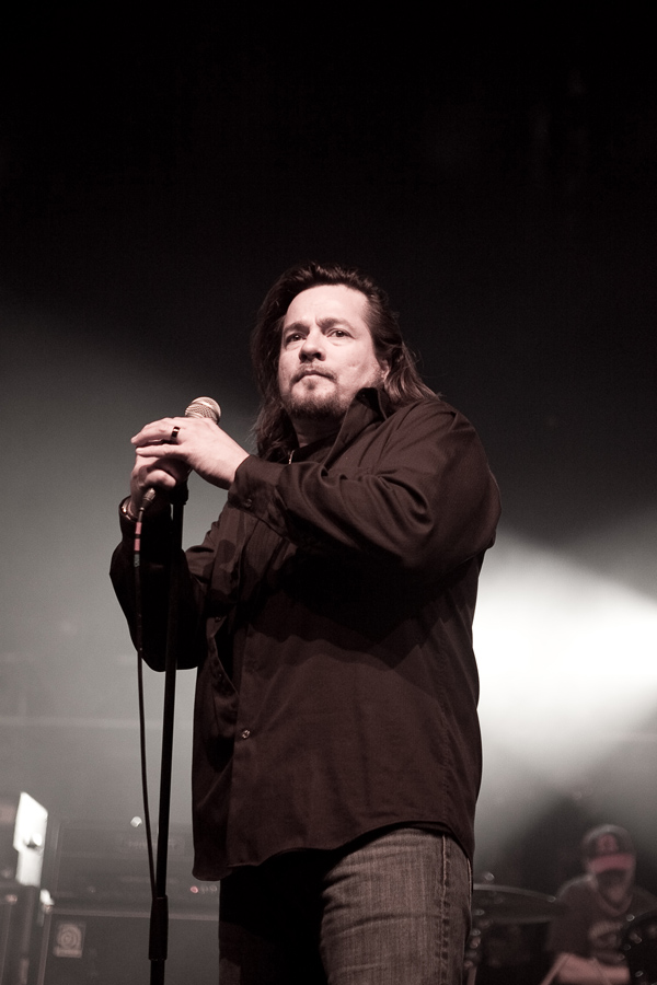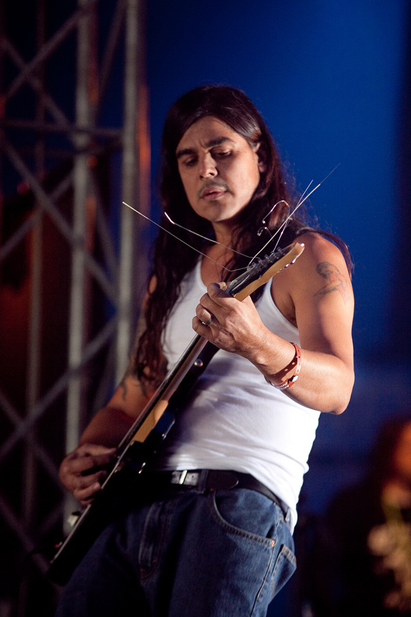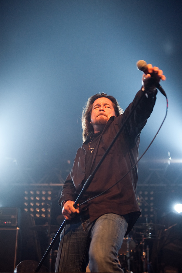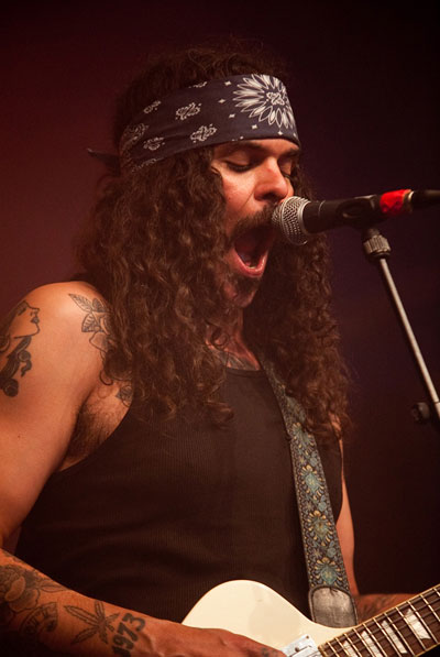 En effet, John Garcia, sous sa configuration GARCIA PLAYS KYUSS se prépare à monter sur scène sous la Terrorizer. De manière toute à fait emblématique et hautement symbolique, le set commence par un titre instrumental de Kyuss, « Asteroid », avec uniquement sur scène les 3 musiciens néerlandais qui épaulent le chanteur sur cette tournée. Le message est clair : Kyuss, c’est avant tout la musique, et seulement « entre autres » une voix. Cela remet les choses en places pour ceux qui croient le bonhomme présomptueux et doté d’un ego démesuré ; il est en réalité modeste et reconnaissant. Garcia débarque donc sur scène sur le 1er titre, « Thumb ». Pas l’entrée en matière la plus directe, mais très vite le ton est donné par l’intermédiaire d’une succession de classiques (« One Inch Man », « Hurricane »…). Et puis alors que le feeling commence à bien prendre progressivement, on remarque que même si la magie de Kyuss est irremplaçable, on prend un sacré plaisir à écouter ces titres. Et on n’est pas les seuls : le public est incandescent ! La tente est d’ailleurs ultra-bondée… Instrumentalement, ça joue bien, voire techniquement très bien. Certes, le son de basse rondouillard et ronflant de Scott Reeder est ici plus clair et carré, la guitare graveleuse et aérienne de Homme paraît plus acérée et claire… Mais les chansons sont là, les musiciens très compétents, et Garcia se donne à fond derrière ces (ou plutôt « SES ») titres, au top vocalement de ces dernières années. Alors que l’on commence à sérieusement prendre notre pied, arrive un moment que l’on attendait tous (et qui a été improvisé quelques instants plus tôt backstage), alors que Jacques de Haard cède sa place de bassiste à Nick Oliveri ! Le groupe entame « Freedom Run » sous cette configuration, avec un Oliveri presque timide, évoluant sans micro dans son coin, « presque » concentré sur son jeu de basse… Frissons renforcés quelques morceaux plus tard quand Oliveri garde le poste de bassiste et que… Brant Bjork prend les baguettes derrière le kit de batterie de Rob Snijders ! Comme beaucoup le diront depuis, 3/4 de Kyuss se trouve à entamer « Gardenia » puis « Green Machine » sous nos yeux ! Le tout dans une ambiance manifeste d’amitié franche et sincère entre ces musiciens. Énorme expérience… La fin du concert voit d’autres classiques défiler, et le set se prolonger bien plus que le timing initialement prévu ! Encore chaud, Garcia voudra même remonter sur scène après un rappel, mais l’horaire étant tellement dépassé, le régisseur l’interrompt un peu abruptement.