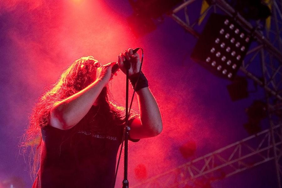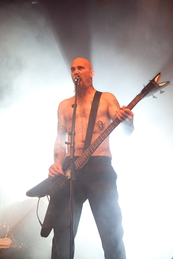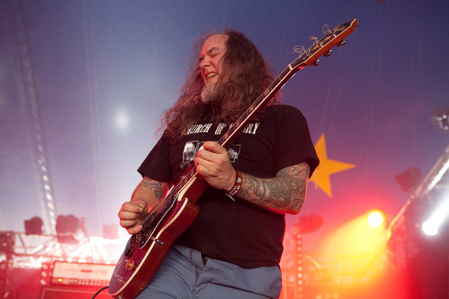 Dans la même veine, Slayer prend la suite du trio : le quatuor se plante sur la scène et n’en bougera quasiment pas. Que la boucherie commence ! Slayer sur scène, en festival notamment, c’est un peu le marronnier : toujours pareil, toujours le même effet imparable. Quelques morceaux récents (« Jihad ») côtoient une montagne de classiques à l’efficacité éprouvée. Le public est à fond, tandis que le groupe, à son habitude, reflète bien l’idée de « la force tranquille » : une machine de guerre an mode « auto-pilote », en quelque sorte. Implacable, une mécanique bien huilée, sans accroc. Sacrée baffe, comme d’habitude… mais on s’y habitue, justement !
