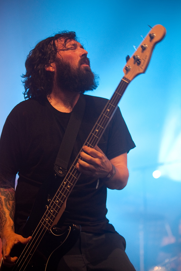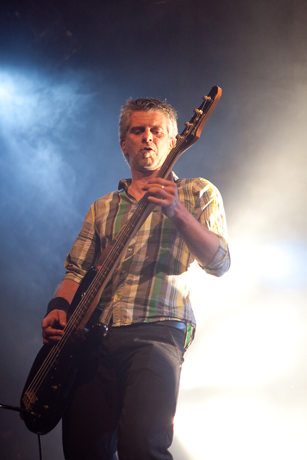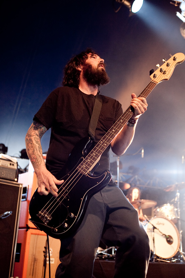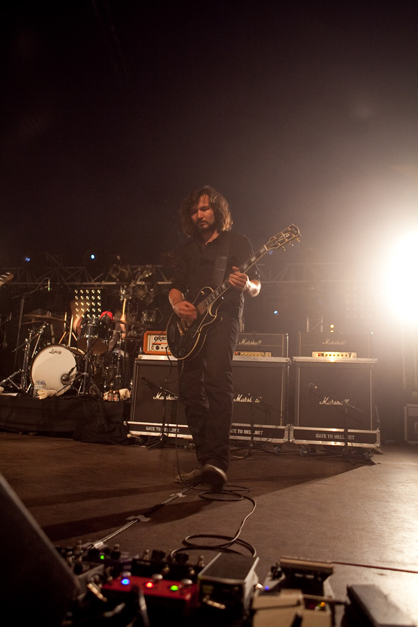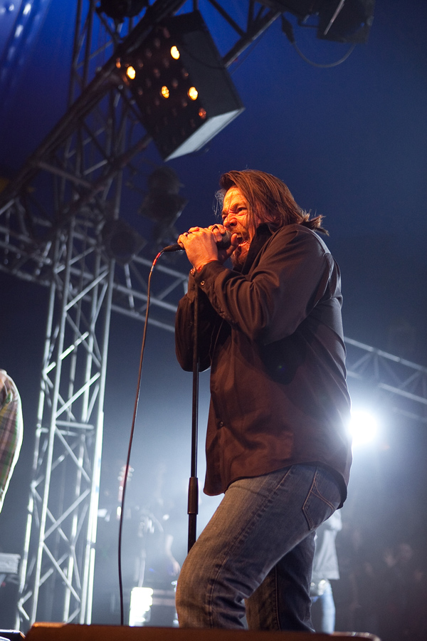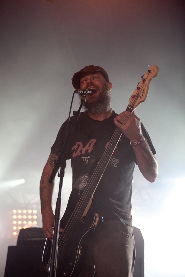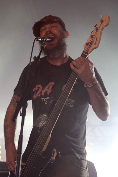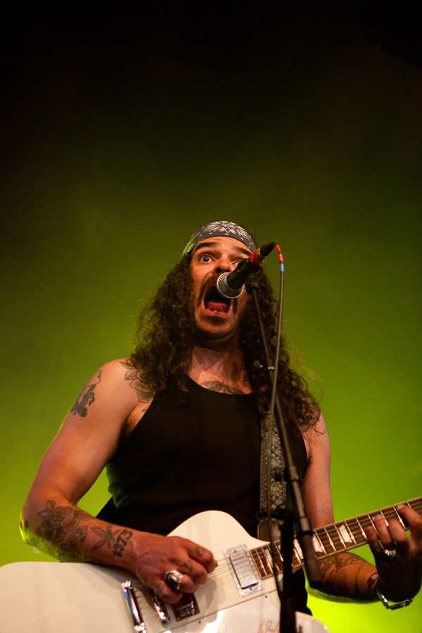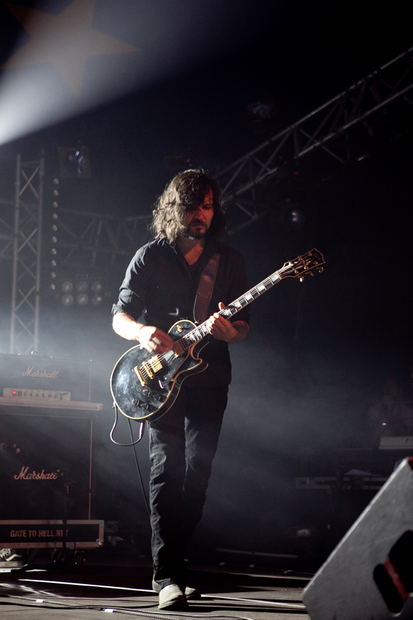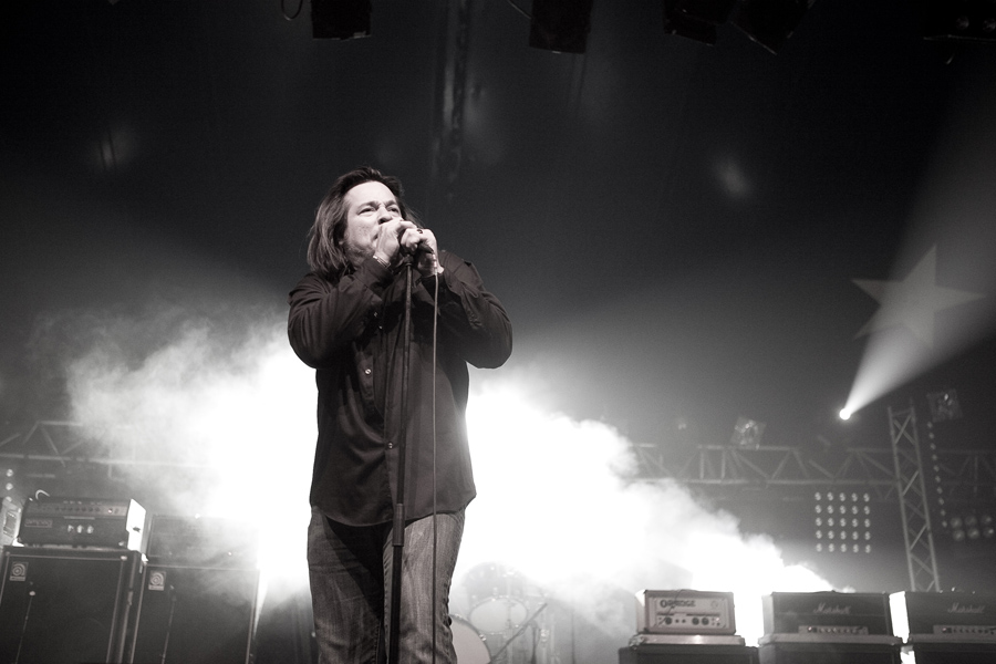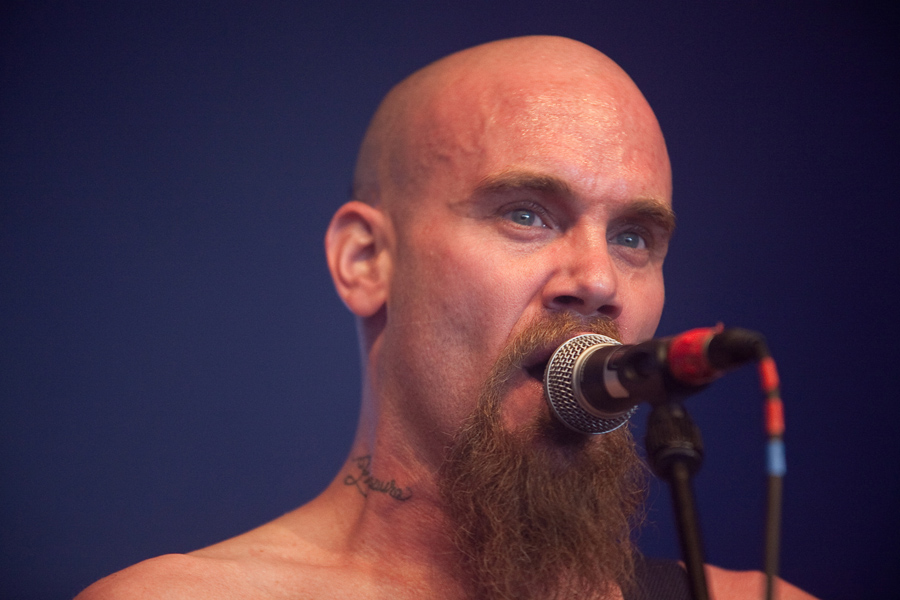 Changement de ton avec MONDO GENERATOR qui déboule sur scène avec « Fuck You I’m Free » et débite directement quelques pépites qui remettent les cases en place. Les fans se réveillent très vite et les connaisseurs dégustent une set list virulente et superbement exécutée, composée des morceaux les plus rentre-dedans du père Oliveri, de Mondo Generator surtout (de mémoire « Shawnette », « All the way down », « JR High Love »…), auxquels se greffent assez naturellement les titres les plus « Oliveri-esques » de Kyuss et QOTSA, of course. Oliveri agit en leader naturel du trio : vocaux impeccables, basse bien saturée omniprésente, attitude, hurlements… Nick est en grande forme ! Ses comparses, issus d’un combo australien apparemment, assurent bien : ça joue, ça a la pêche, ça sourit et ça donne le sourire ! Excellent, et trop court ! Un des points forts de la journée.