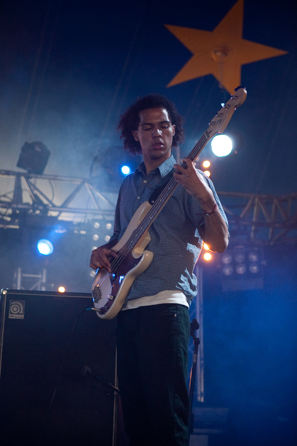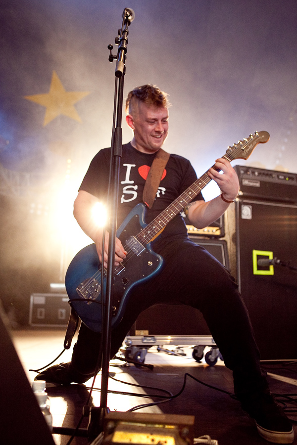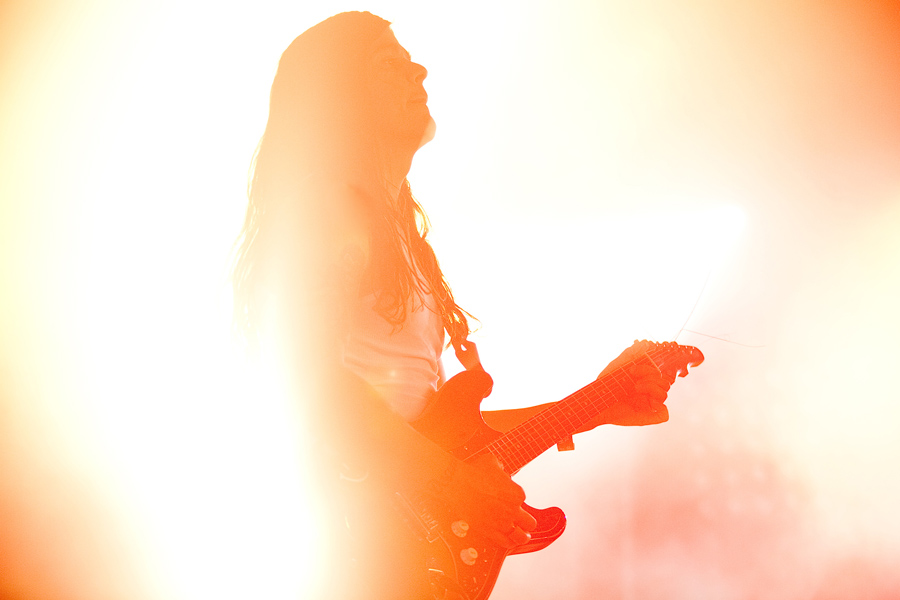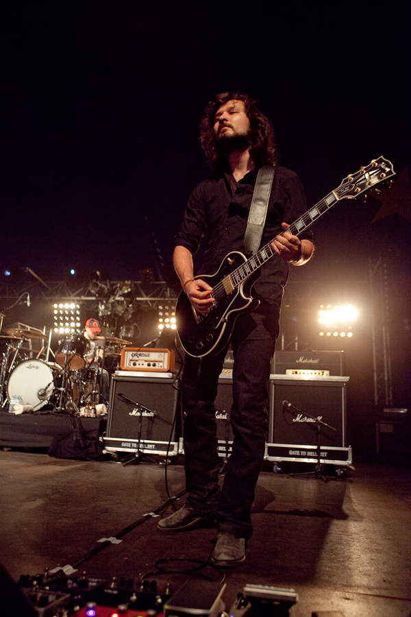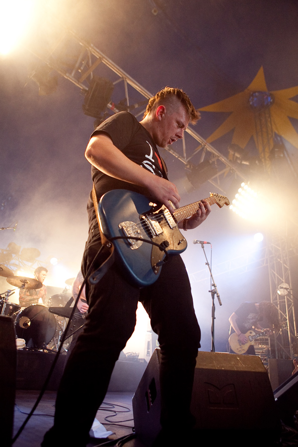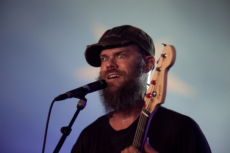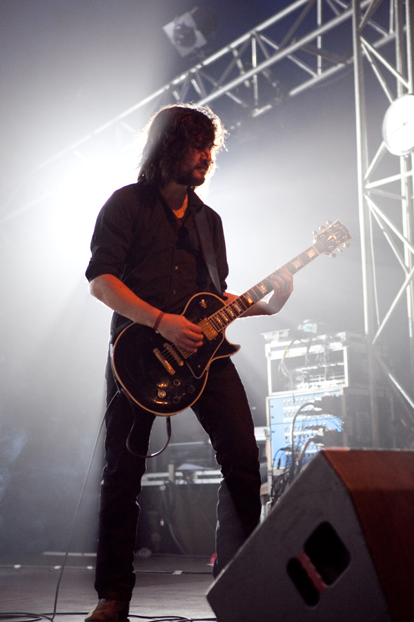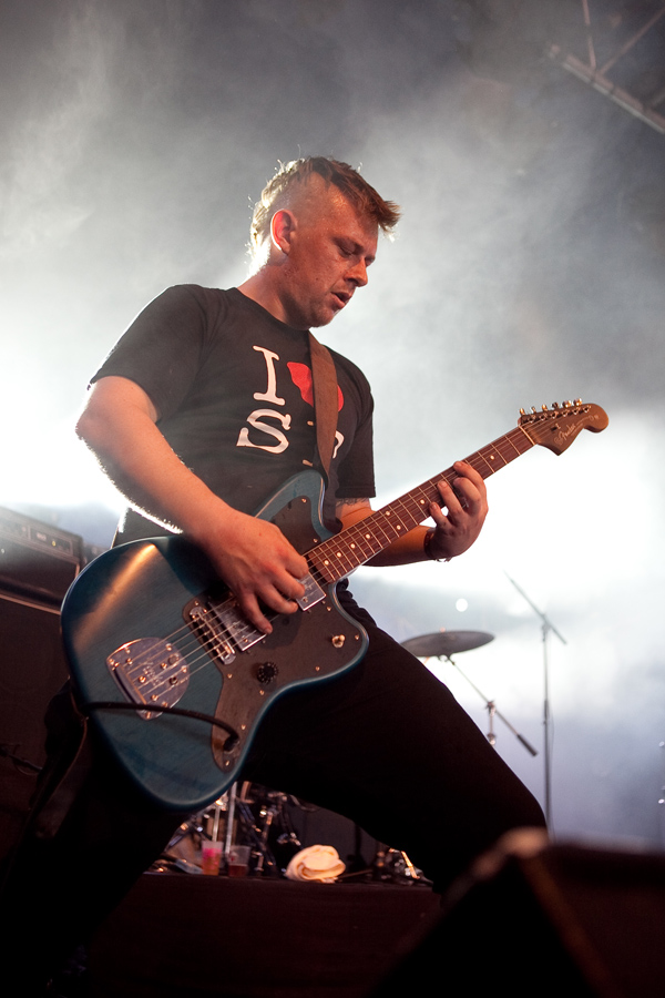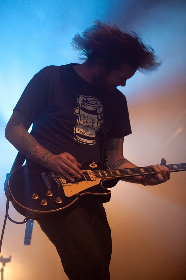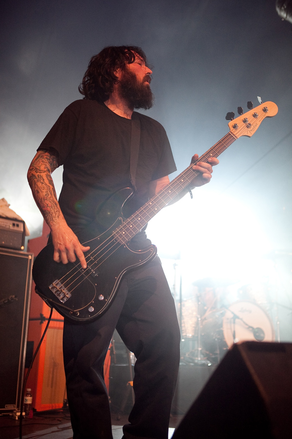 Changement de ton avec MONDO GENERATOR qui déboule sur scène avec « Fuck You I’m Free » et débite directement quelques pépites qui remettent les cases en place. Les fans se réveillent très vite et les connaisseurs dégustent une set list virulente et superbement exécutée, composée des morceaux les plus rentre-dedans du père Oliveri, de Mondo Generator surtout (de mémoire « Shawnette », « All the way down », « JR High Love »…), auxquels se greffent assez naturellement les titres les plus « Oliveri-esques » de Kyuss et QOTSA, of course. Oliveri agit en leader naturel du trio : vocaux impeccables, basse bien saturée omniprésente, attitude, hurlements… Nick est en grande forme ! Ses comparses, issus d’un combo australien apparemment, assurent bien : ça joue, ça a la pêche, ça sourit et ça donne le sourire ! Excellent, et trop court ! Un des points forts de la journée.