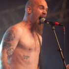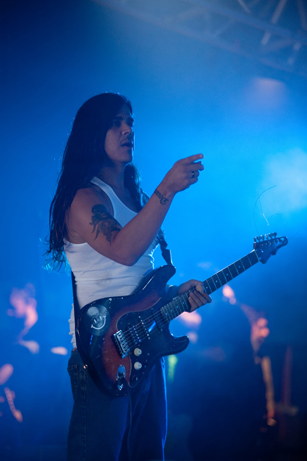 Du coup, on revient vers la Terrorizer tent au milieu de Slayer pour assister à la fin du set apocalyptique de Dillinger Escape Plan : les déjantés ricains évoluent sur une scène noyée dans la pénombre, déchirée de spots speedés et de stroboscopes jaunes et blancs. Et sur cette scène, les zicos courent dans tous les sens, crient, montent sur les retours, sautent, se roulent par terre… si on cligne des yeux un instant on les perd de vue ! Le très musculeux Greg Puciato en tête (qui court dans tous les sens, hurle dans son micro, et escalade les poteaux, murs d’amplis, etc…), le groupe se donne à 200%. Musicalement, c’est bien gaulé, mais peu mélodique : saccadé, froid, rêche, les compos du groupe vont droit au but. Une sacrée expérience !