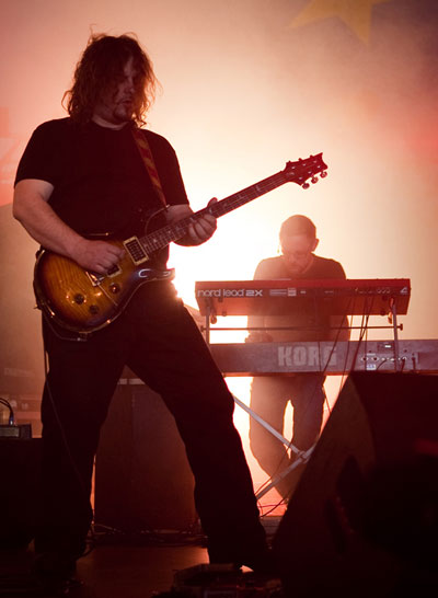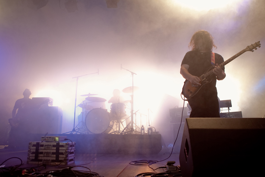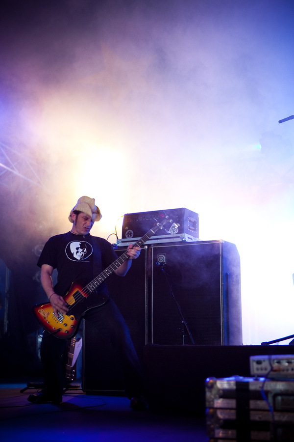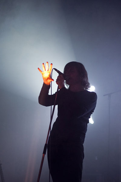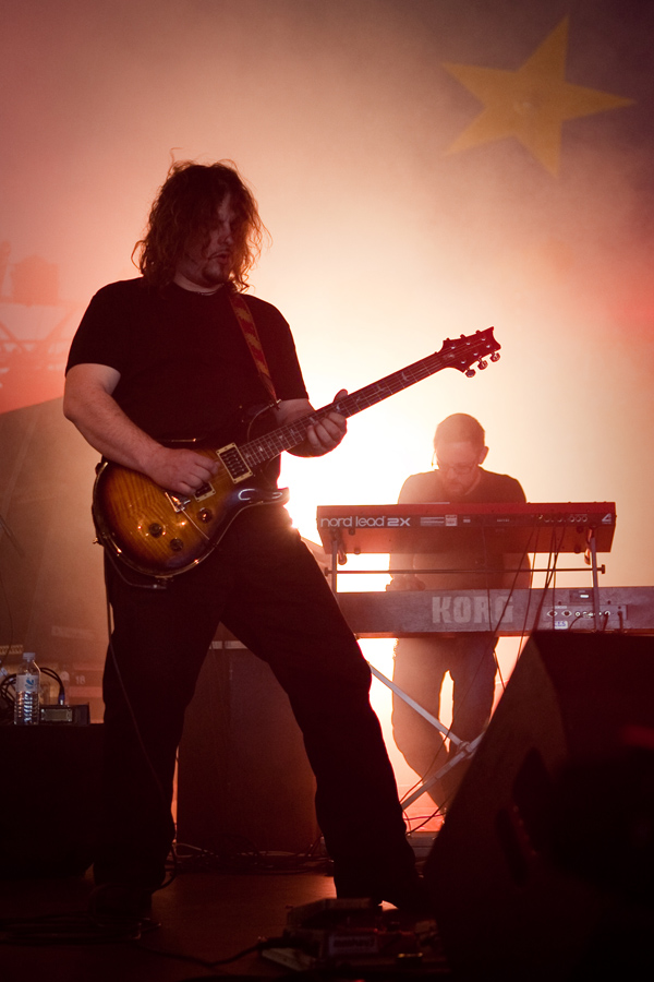 On passe faire un tour sous les tentes pour aller se rincer les oreilles à coups de Young Gods (qui n’ont plus de « young » que le nom, malheureusement). La scène est noyée de fumigènes, et les lumières en contre-jour systématique renforcent l’effet forcément énigmatique et nébuleux de la musique du combo. Un peu répétitif passée la première demi-heure (pour le non-esthète que je suis…), je me réfugie dans l’ambiance chaleureuse de la tente Rock Hard pour bouffer un peu du black metal des gros crétins de Watain. Cette scène superbe, toute en profondeur, est parfaitement mise à profit par le groupe, qui l’a décorée de bougies, tridents enflammés, croix inversées, etc… A voir plus qu’à entendre !