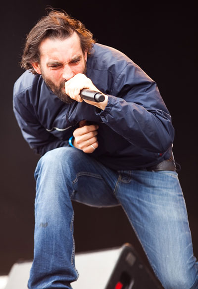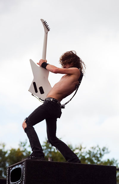 Bouffée d’air frais, les australiens d’Airbourne sont là pour mettre le feu. Même si les musiciens s’en donnent à coeur joie, c’est le chanteur / gratteux Joel qui assure le show : hurlant dans le micro, enchaînant les poses de guitar hero, il passe la moitié de son temps perché sur les amplis. Clou du concert, il escalade carrément la structure de la scène (au moins 30 mètres de haut à vue de nez) pour exécuter son solo sur le toit de la main stage !! Ebourrifant ! Notons que musicalement, leur hard rock dynamique est efficace, quoi qu’un peu lassant sur la longueur (qu’en resterait-il sans son leader ?).