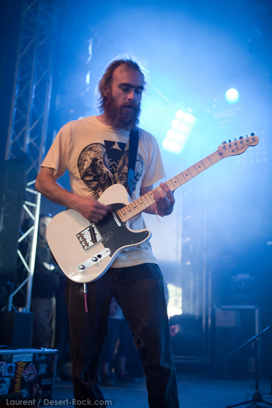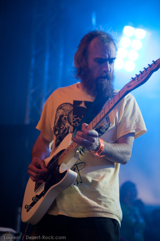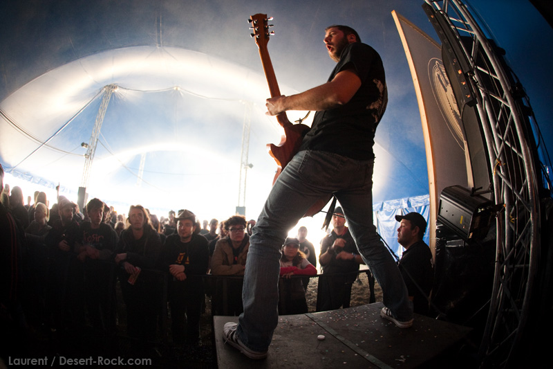 Après une petite balade (sous le soleil !) à l’occasion de laquelle je constate l’improbable succès public de Cavalera Conspiracy (le public enchaîne les circle pits furieux les uns après les autres), je rejoins assez vite la tente pour assister au set de KYLESA. Eternelle rencontre manquée entre Kylesa et moi, je n’ai jamais été complètement séduit par leur musique. Alors que leurs concerts m’avaient jusqu’ici semblé très « froids », leur musique puissante mais aseptisée, je note aujourd’hui un son plus chaleureux, et des compos plus accessibles, moins hermétiques. Le groupe fonctionne bien, le public est nombreux tassé dans la tente pour assister à leur gig, et les musiciens se donnent bien en retour, et surtout, rendons à César ce qui revient à César, le bassiste Corey Barhorst. Anti-star par excellence, Laura Pleasants reste relativement en retrait en terme de présence scénique. La double-batterie ne m’a toujours pas convaincu, mais au final, le set laisse un excellent souvenir. Rien de transcendant toutefois, et pas non plus selon moi à la hauteur du culte voué à ce groupe.