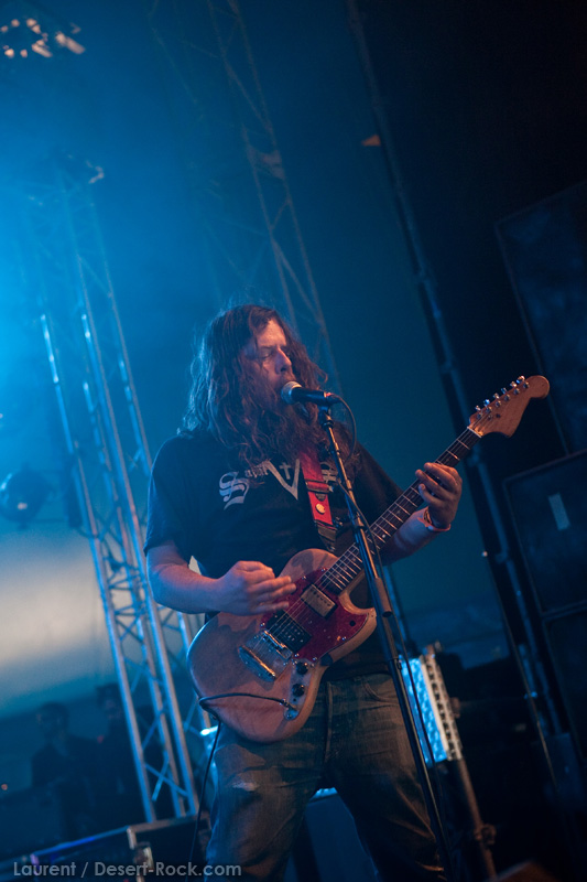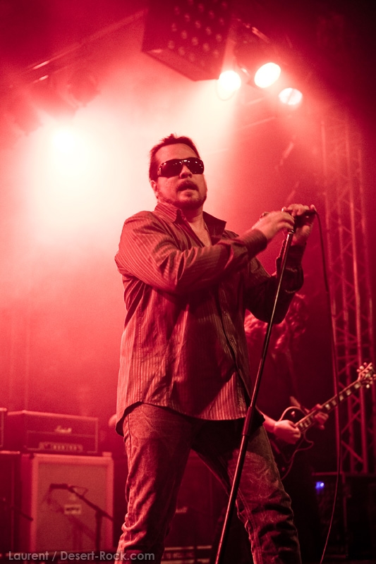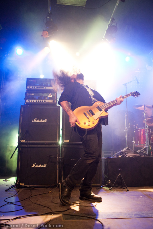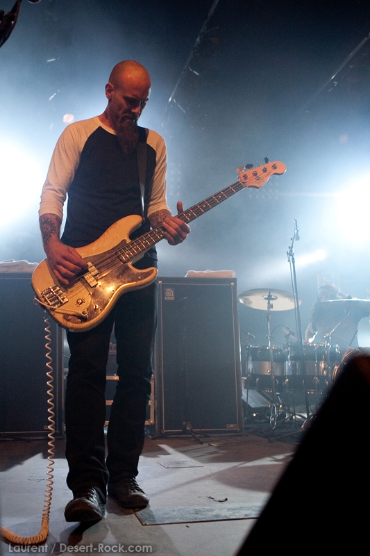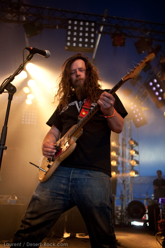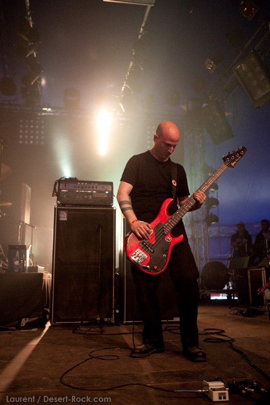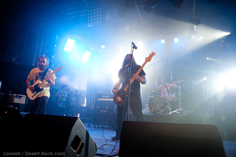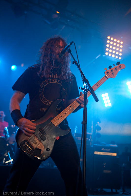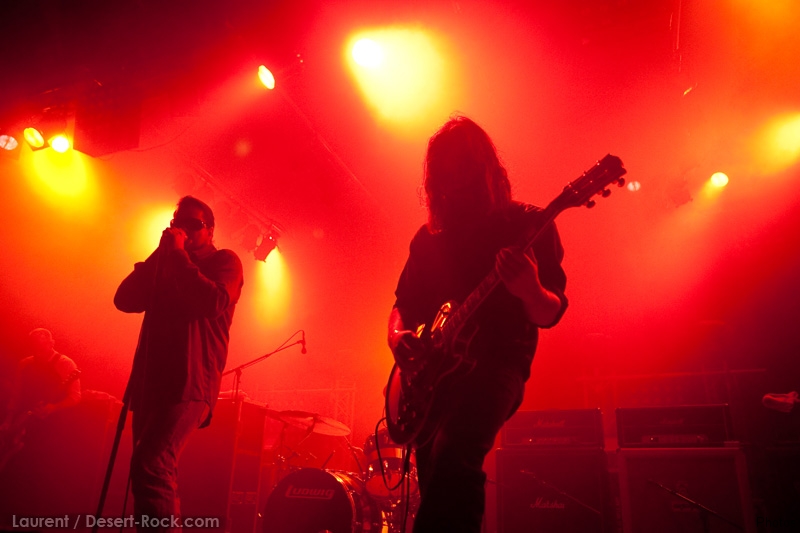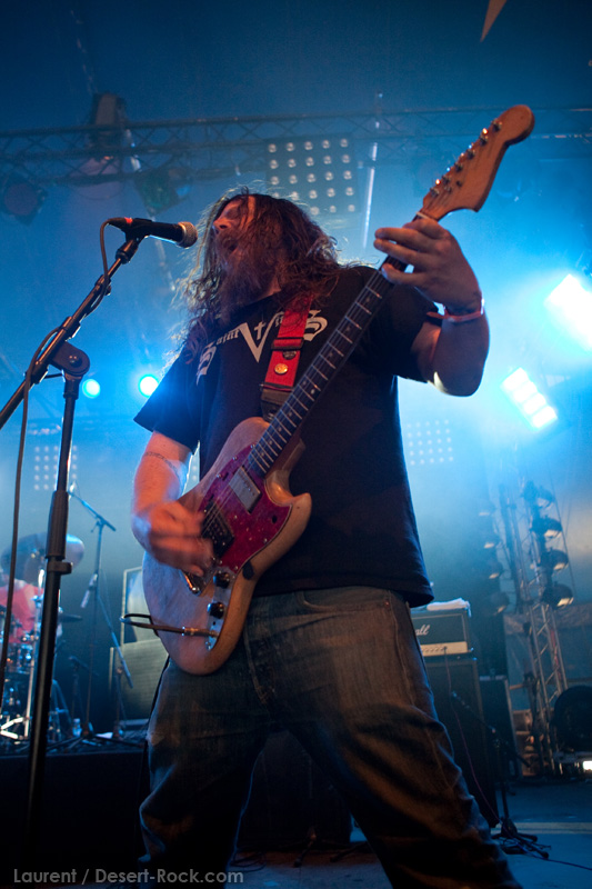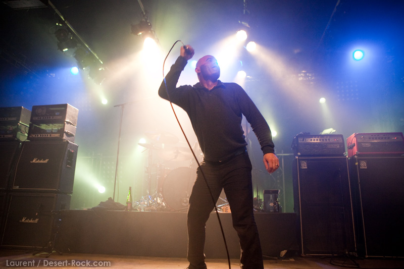 La tension monte petit à petit en attendant les mythiques GOATSNAKE, et atteint même son paroxysme quand, 10 minutes après le début supposé du set, le groupe n’est toujours pas sur scène… On peste devant ces 10 précieuses minutes de musique gâchées ! Heureusement, le quatuor monte sur scène et surprise derrière la basse, le frenchy Guy Pinhas ! Etant un gros branleur, je n’avais pas noté dans les communiqués que le groupe revenait sous sa formation initiale… [Parenthèse perso : à sa vue, alors que je prenais mes premiers clichés, j’ai eu un flashback redoutable : fin mai 2001, soit il y a presque exactement 10 ans de cela, je faisais mes premières photos de concert à Los Angeles, devant Acid King… et Guy Pinhas à la basse ! Le trip…] Très vite l’artillerie lourde est lancée, et la basse ronflante de Pinhas commence à labourer les conduits auditifs avec une efficacité de métronome sur le magnifique « Flower of disease » : un titre complexe, aérien et heavy, emblématique de la musique du groupe. Lorsque Pete Stahl monte sur scène, vêtu de vêtements de ville d’une banalité stupéfiante, son charisme naturel fait pardonner en 10 secondes le retard du groupe, et envoûte instantanément le public. Le voir vivre chaque morceau à fond, arpenter la scène de long en large, venir à la rencontre du public pour partager sa musique, participent à son aura. Clairement, le public lui mange dans la main, tout le monde est aux anges. Son organe vocal exceptionnel, avec ses tonalités nasillardes si caractéristiques et sa puissance, ne sera pas une seule fois pris en défaut. Greg Anderson sur le côté est à fond, il sourit, prend la pose, et globalement, assure ses montagnes de riff sans effort. Lorsque l’on ouvre à nouveau les yeux, un filet de bave au bord de la lèvre, le groupe a déjà joué plusieurs titres comme dans un rêve : en vrac, « Innocent », « Slippin’ the Stealth », « The Dealer », « IV »… Bref, une set list de rêve qui s’en va piocher dans tous les albums du groupe. Goatsnake, sur ce set, a montré un savoir faire remarquable, et surtout a démontré que le stoner le plus pointu, lorsque joué avec passion et talent, pouvait transporter des foules. Ce qui fut fait. La claque.