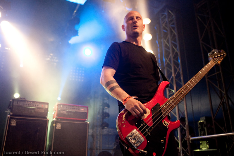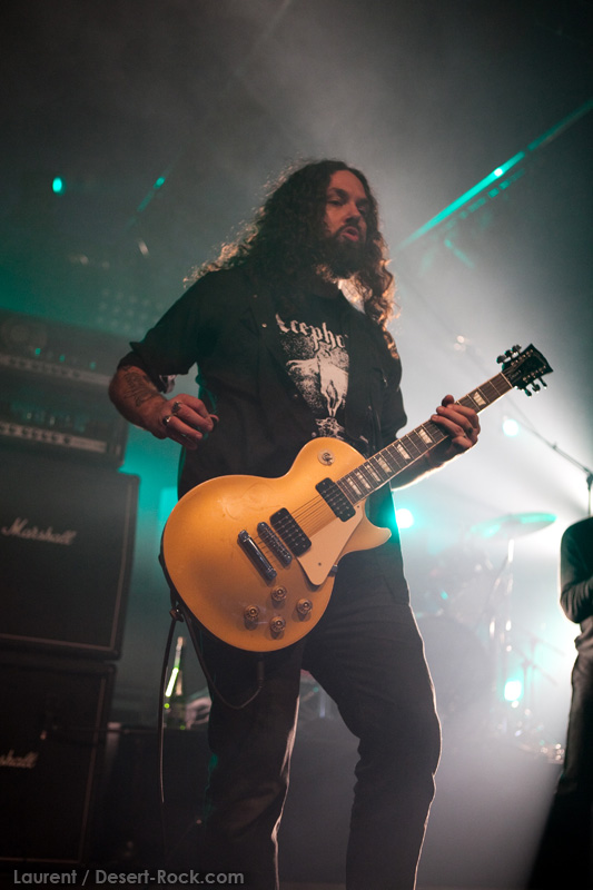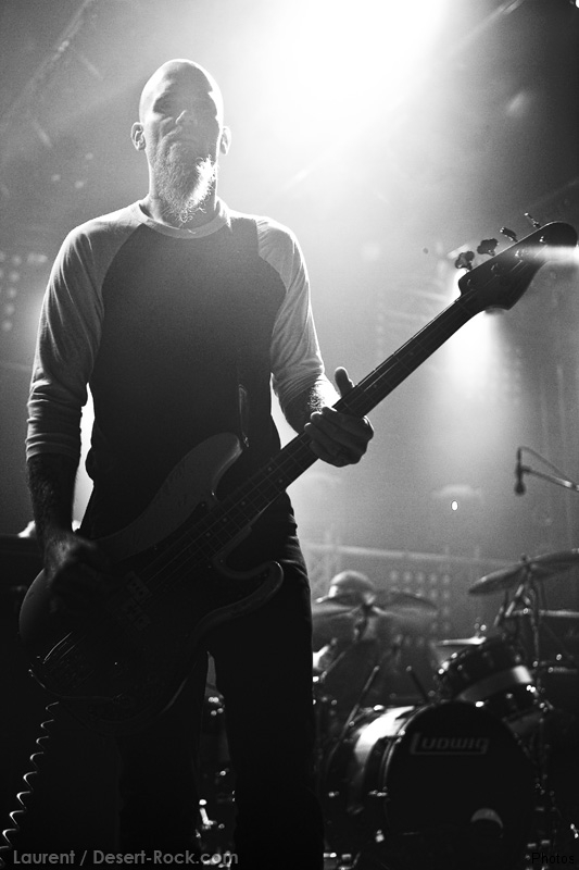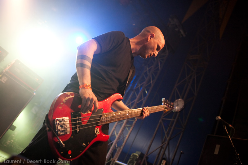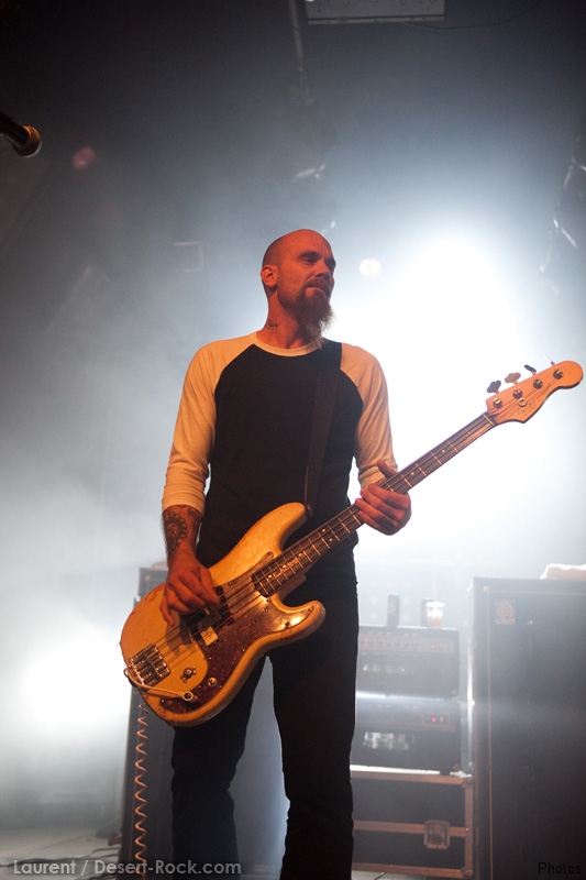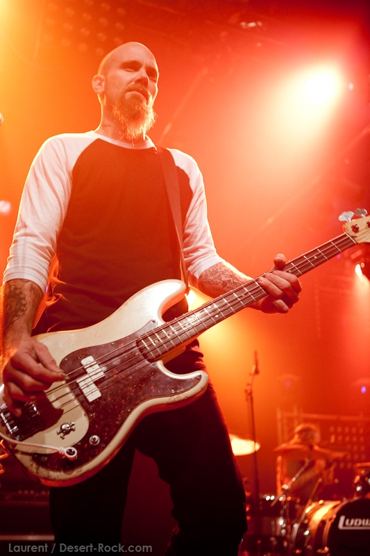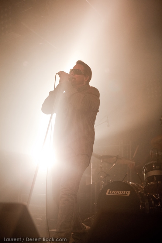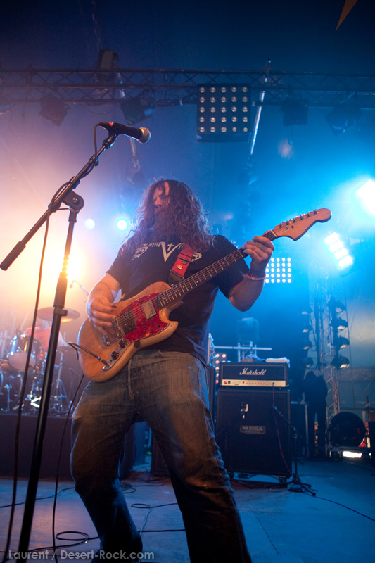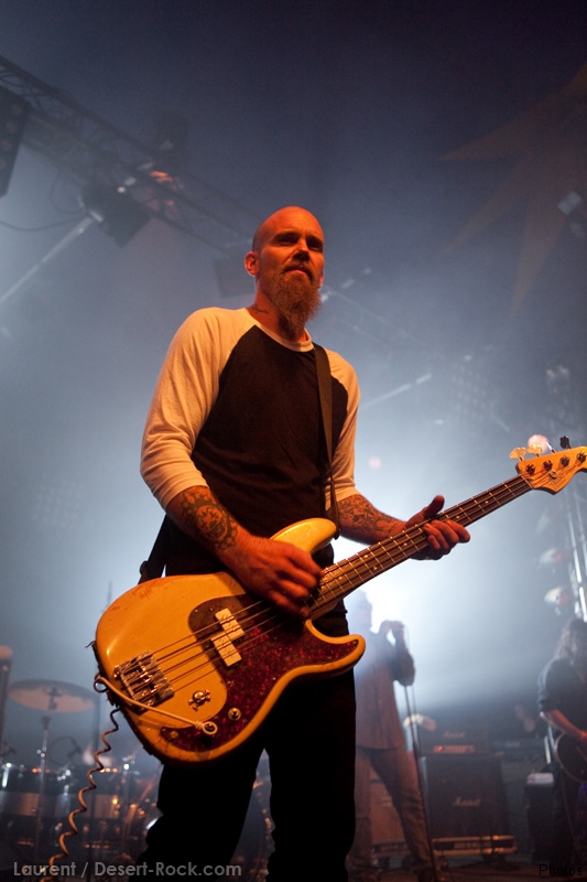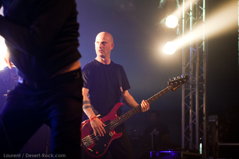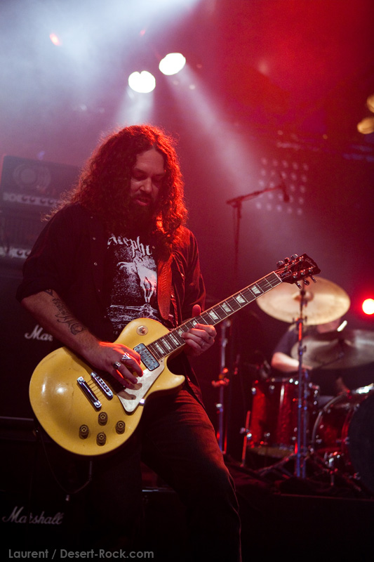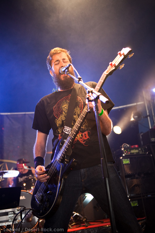 La tension monte petit à petit en attendant les mythiques GOATSNAKE, et atteint même son paroxysme quand, 10 minutes après le début supposé du set, le groupe n’est toujours pas sur scène… On peste devant ces 10 précieuses minutes de musique gâchées ! Heureusement, le quatuor monte sur scène et surprise derrière la basse, le frenchy Guy Pinhas ! Etant un gros branleur, je n’avais pas noté dans les communiqués que le groupe revenait sous sa formation initiale… [Parenthèse perso : à sa vue, alors que je prenais mes premiers clichés, j’ai eu un flashback redoutable : fin mai 2001, soit il y a presque exactement 10 ans de cela, je faisais mes premières photos de concert à Los Angeles, devant Acid King… et Guy Pinhas à la basse ! Le trip…] Très vite l’artillerie lourde est lancée, et la basse ronflante de Pinhas commence à labourer les conduits auditifs avec une efficacité de métronome sur le magnifique « Flower of disease » : un titre complexe, aérien et heavy, emblématique de la musique du groupe. Lorsque Pete Stahl monte sur scène, vêtu de vêtements de ville d’une banalité stupéfiante, son charisme naturel fait pardonner en 10 secondes le retard du groupe, et envoûte instantanément le public. Le voir vivre chaque morceau à fond, arpenter la scène de long en large, venir à la rencontre du public pour partager sa musique, participent à son aura. Clairement, le public lui mange dans la main, tout le monde est aux anges. Son organe vocal exceptionnel, avec ses tonalités nasillardes si caractéristiques et sa puissance, ne sera pas une seule fois pris en défaut. Greg Anderson sur le côté est à fond, il sourit, prend la pose, et globalement, assure ses montagnes de riff sans effort. Lorsque l’on ouvre à nouveau les yeux, un filet de bave au bord de la lèvre, le groupe a déjà joué plusieurs titres comme dans un rêve : en vrac, « Innocent », « Slippin’ the Stealth », « The Dealer », « IV »… Bref, une set list de rêve qui s’en va piocher dans tous les albums du groupe. Goatsnake, sur ce set, a montré un savoir faire remarquable, et surtout a démontré que le stoner le plus pointu, lorsque joué avec passion et talent, pouvait transporter des foules. Ce qui fut fait. La claque.