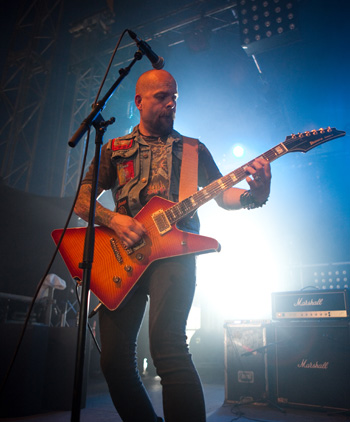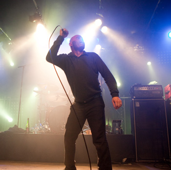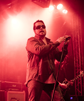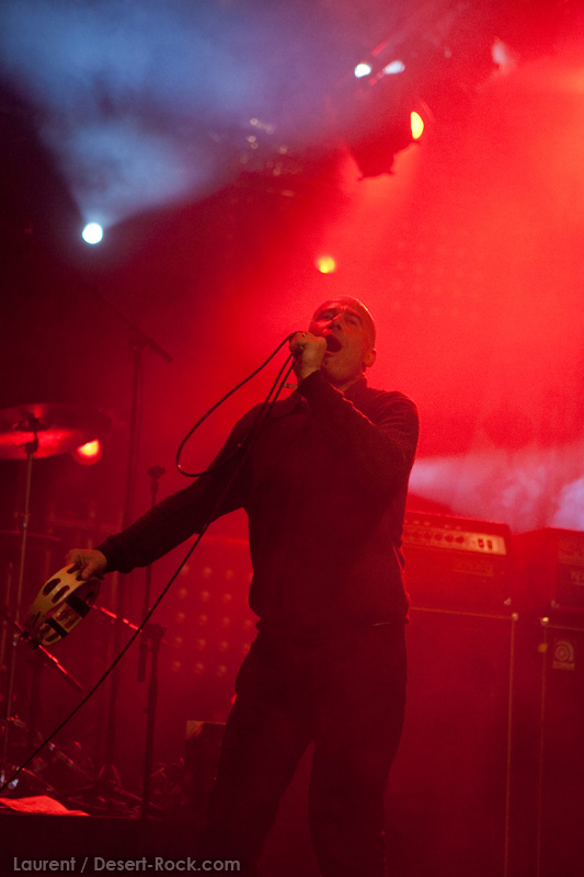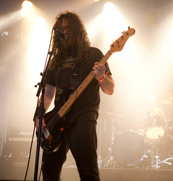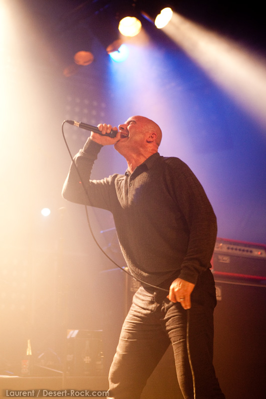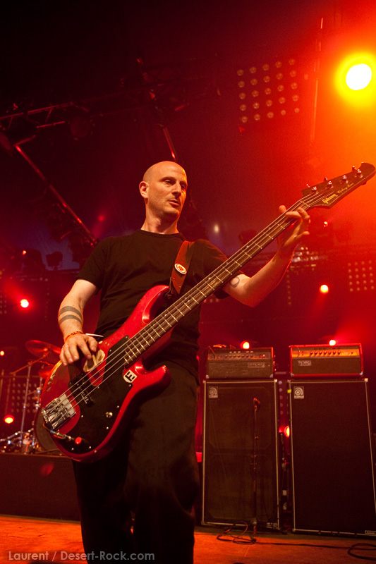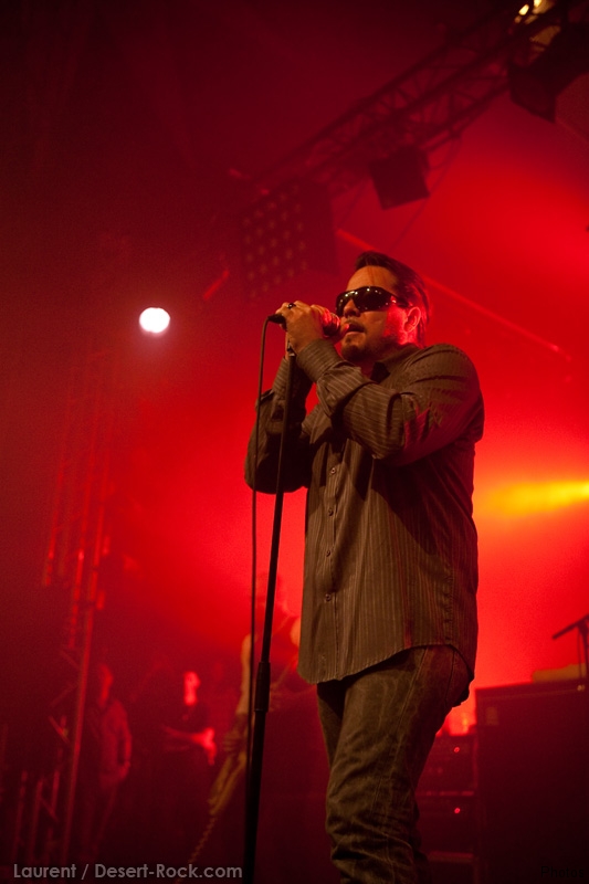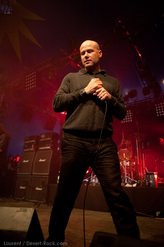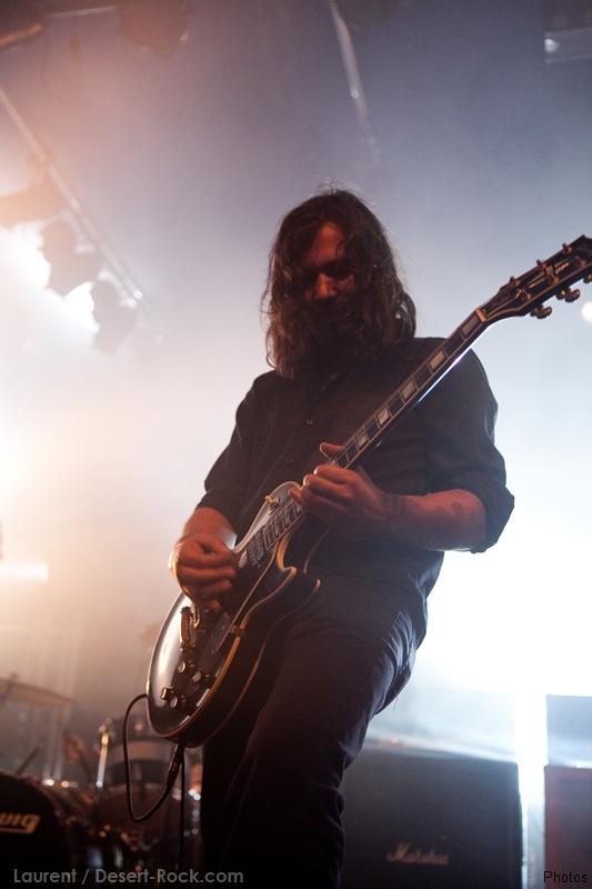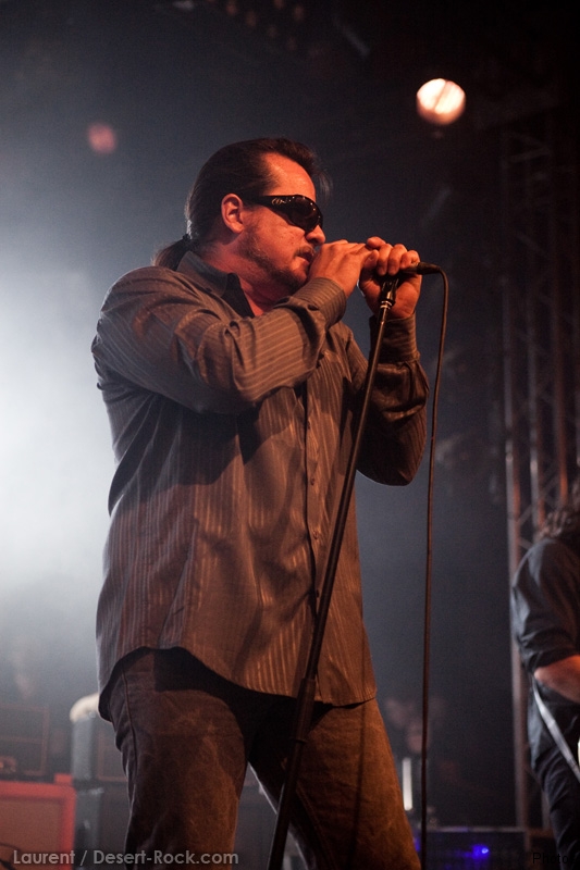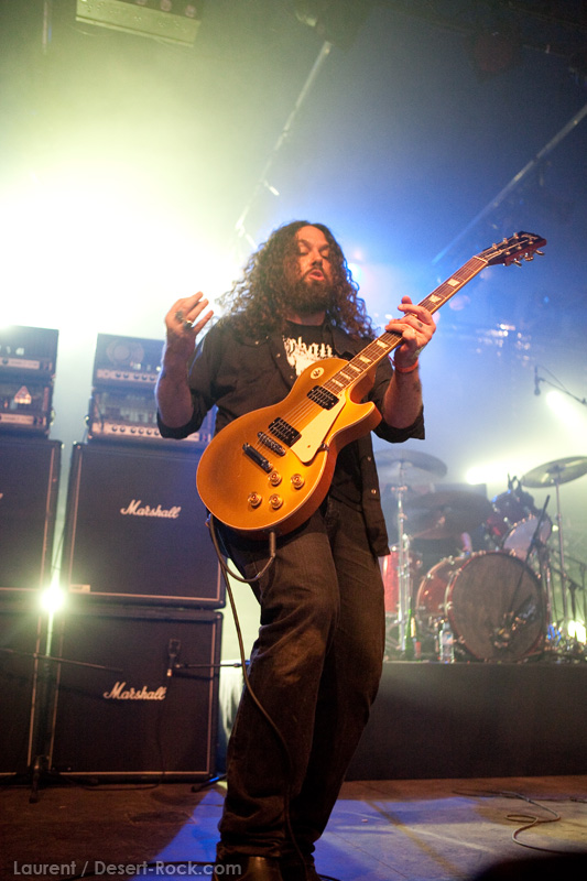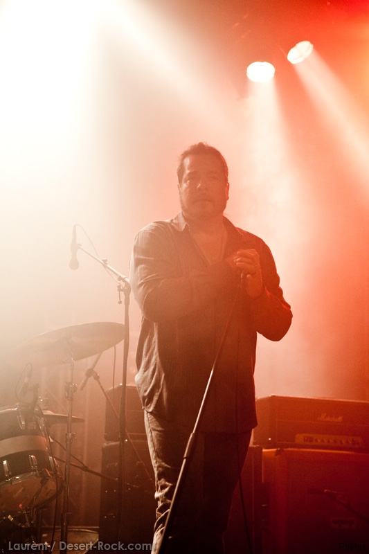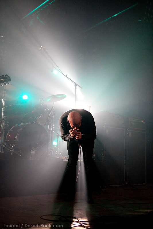 La tension monte petit à petit en attendant les mythiques GOATSNAKE, et atteint même son paroxysme quand, 10 minutes après le début supposé du set, le groupe n’est toujours pas sur scène… On peste devant ces 10 précieuses minutes de musique gâchées ! Heureusement, le quatuor monte sur scène et surprise derrière la basse, le frenchy Guy Pinhas ! Etant un gros branleur, je n’avais pas noté dans les communiqués que le groupe revenait sous sa formation initiale… [Parenthèse perso : à sa vue, alors que je prenais mes premiers clichés, j’ai eu un flashback redoutable : fin mai 2001, soit il y a presque exactement 10 ans de cela, je faisais mes premières photos de concert à Los Angeles, devant Acid King… et Guy Pinhas à la basse ! Le trip…] Très vite l’artillerie lourde est lancée, et la basse ronflante de Pinhas commence à labourer les conduits auditifs avec une efficacité de métronome sur le magnifique « Flower of disease » : un titre complexe, aérien et heavy, emblématique de la musique du groupe. Lorsque Pete Stahl monte sur scène, vêtu de vêtements de ville d’une banalité stupéfiante, son charisme naturel fait pardonner en 10 secondes le retard du groupe, et envoûte instantanément le public. Le voir vivre chaque morceau à fond, arpenter la scène de long en large, venir à la rencontre du public pour partager sa musique, participent à son aura. Clairement, le public lui mange dans la main, tout le monde est aux anges. Son organe vocal exceptionnel, avec ses tonalités nasillardes si caractéristiques et sa puissance, ne sera pas une seule fois pris en défaut. Greg Anderson sur le côté est à fond, il sourit, prend la pose, et globalement, assure ses montagnes de riff sans effort. Lorsque l’on ouvre à nouveau les yeux, un filet de bave au bord de la lèvre, le groupe a déjà joué plusieurs titres comme dans un rêve : en vrac, « Innocent », « Slippin’ the Stealth », « The Dealer », « IV »… Bref, une set list de rêve qui s’en va piocher dans tous les albums du groupe. Goatsnake, sur ce set, a montré un savoir faire remarquable, et surtout a démontré que le stoner le plus pointu, lorsque joué avec passion et talent, pouvait transporter des foules. Ce qui fut fait. La claque.