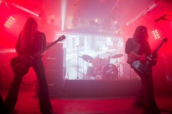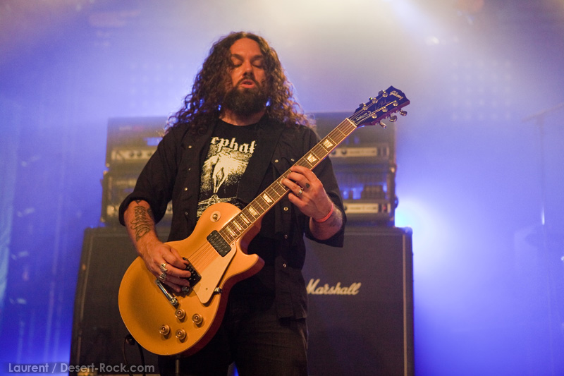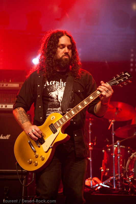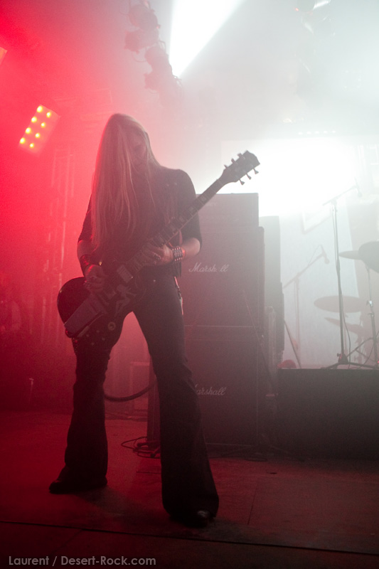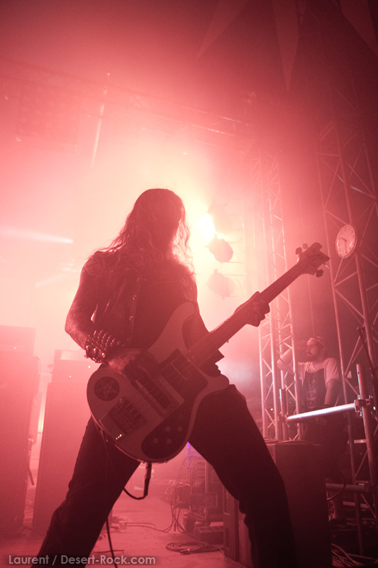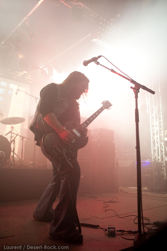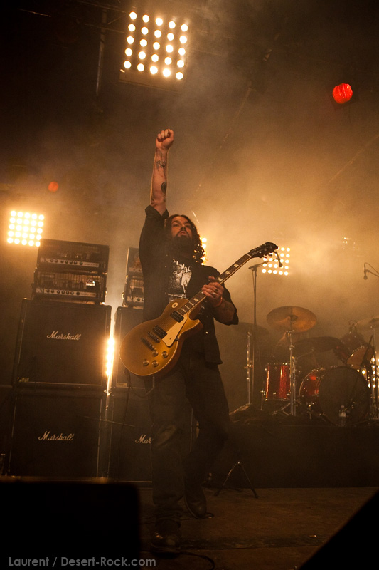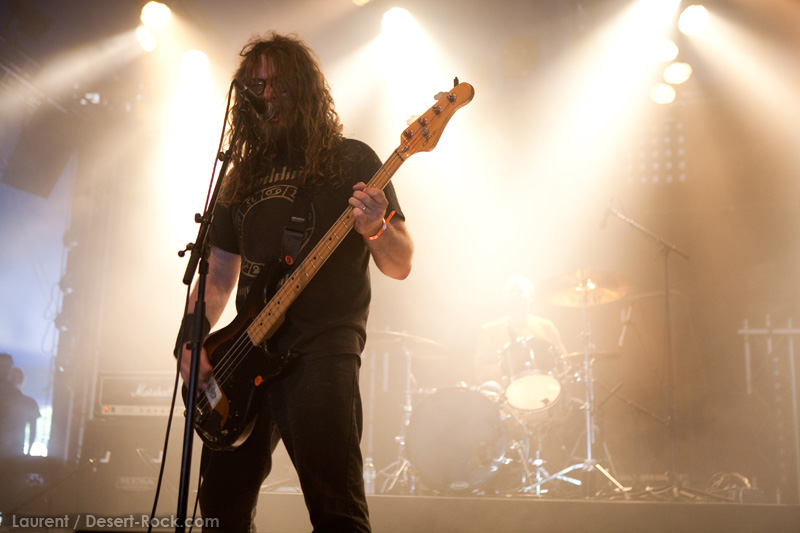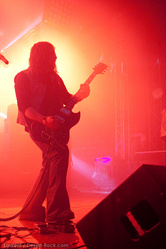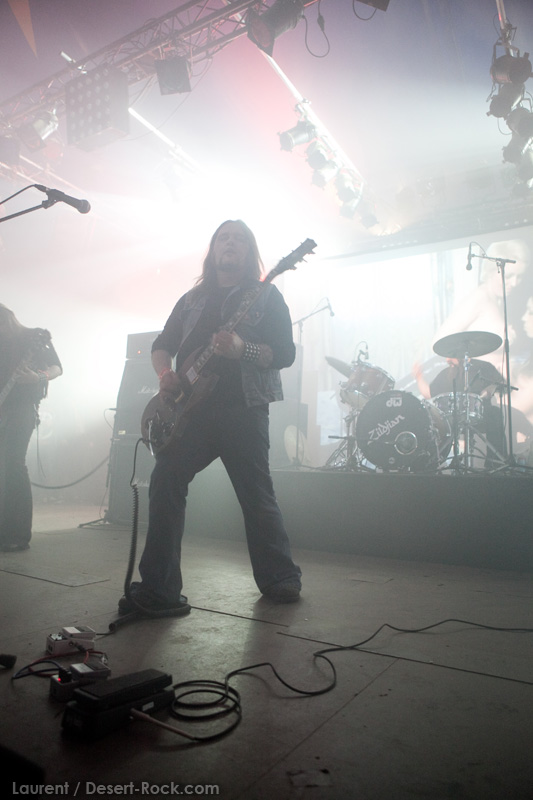 GRAND MAGUS prend la suite sur la même scène, avec une configuration plus modeste : une basse, une batterie, et JB au chant + guitare. Depuis quelques années, le groupe du suédois nous pose un cas de conscience certain : alors que leurs premiers albums d’excellents stoner / doom nous avaient collé de sérieuses mandales à leur sortie, petit à petit le groupe s’était orienté vers un heavy metal très traditionnel, qui ne laisse désormais plus vraiment de place au stoner (une tendance que l’on observe à l’identique chez son ex-groupe d’adoption, Spiritual Beggars). D’ailleurs (je peux me tromper, n’ayant pas analysé la set list en détail), le groupe ne joue durant son set aucun titre issu de ses deux premières perles, préférant servir à un public d’aficionados de nombreux extraits de ses derniers albums. Objectivement, force est de constater que non seulement JB chante merveilleusement, mais que ses soli et rythmiques de gratte sont impeccables, et la musique du groupe est vraiment superbement exécutée. Subjectivement, en revanche, on est en train de faire notre deuil…