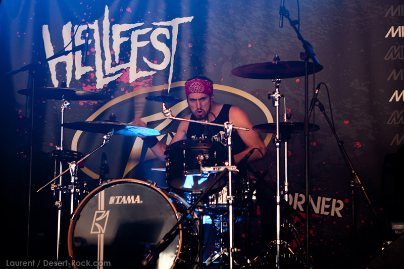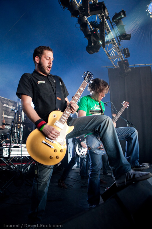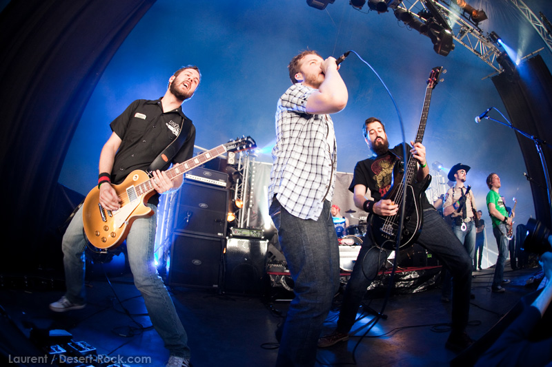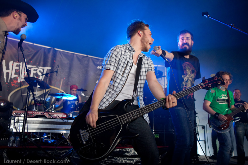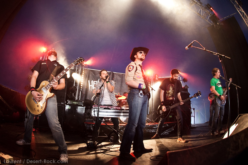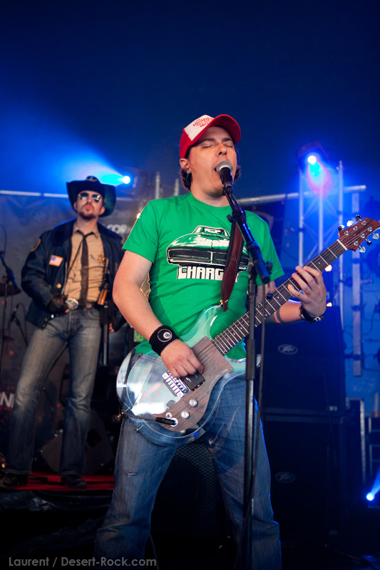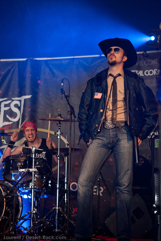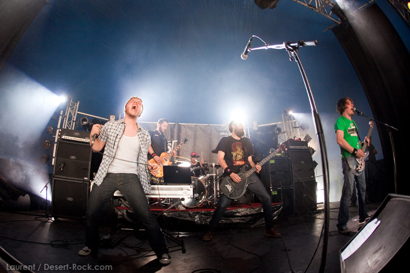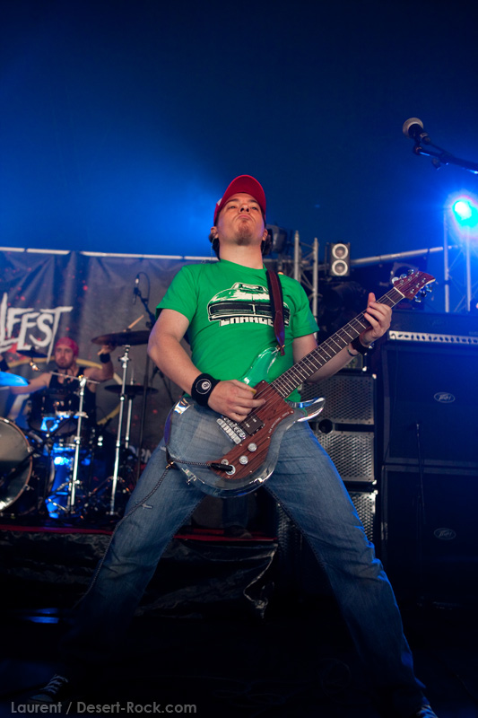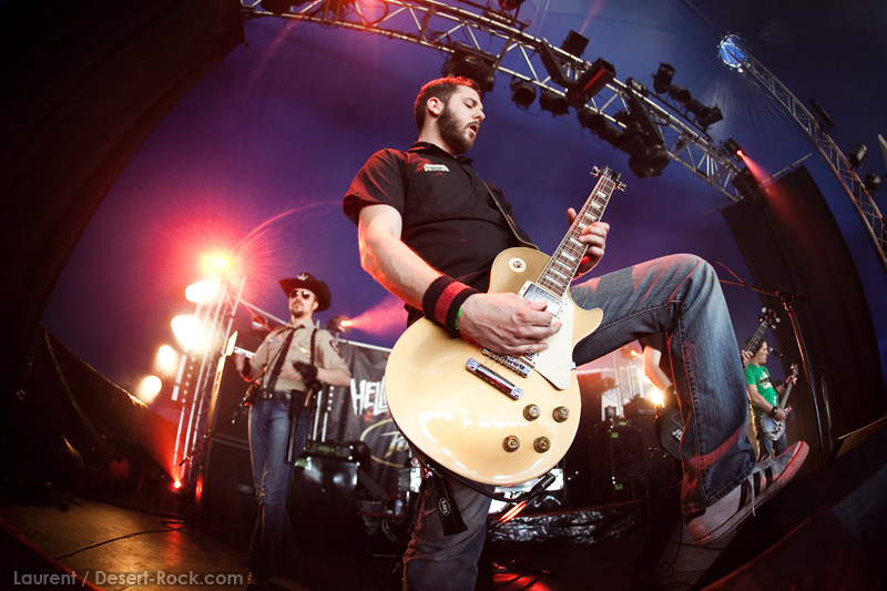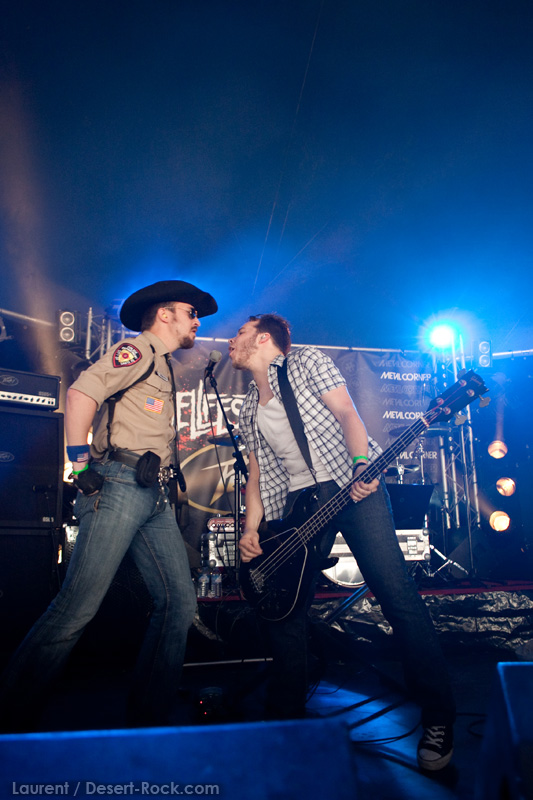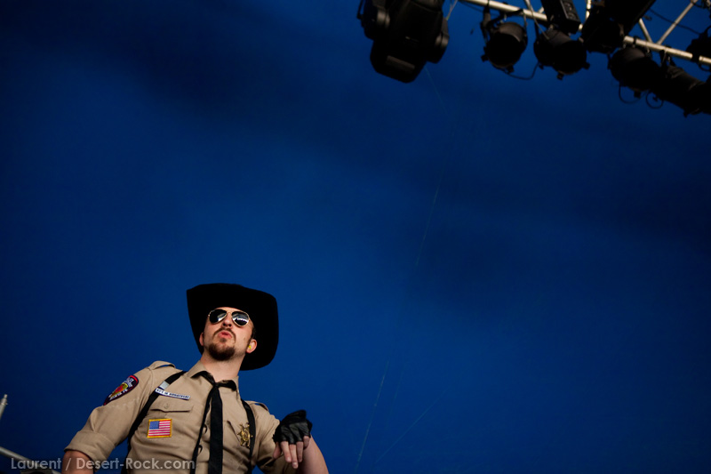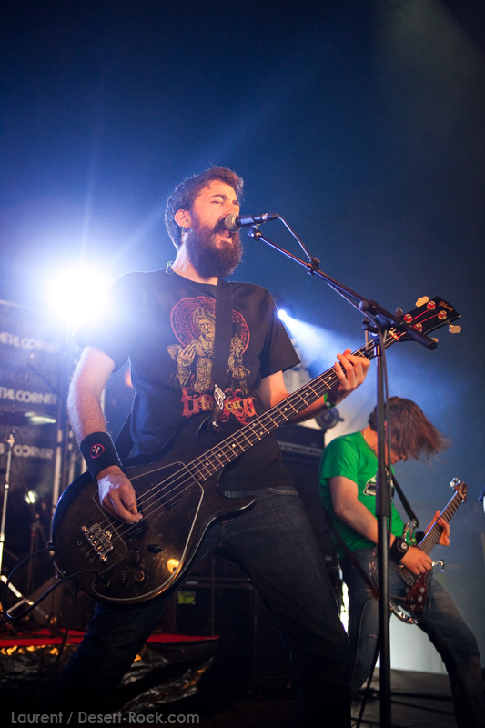 A l’inverse de leurs collègues américains, LOS DISIDENTES DEL SUCIO MOTEL finissent leur soundcheck un peu en retard, je ne rate donc pas une miette de leur set. Très vite, les strasbourgeois me rassureront sur mon choix de planning : quelle qu’ait été la qualité du set de Red Fang, ce concert aura été excellent. Officiant sous la « petite » scène du Metal Corner (une tente de taille très conséquente en réalité, placée juste à la sortie du camping), le groupe rassemble petit à petit les derniers campeurs et l’ensemble des passants et curieux mélomanes. La tente se remplit ainsi progressivement de plusieurs centaines de personnes, et le groupe est bien décidé à ne pas les laisser repartir une fois ferrés. Pour cela, bien conscients qu’une opportunité comme celle-là ne se rate pas (ce n’est pas uniquement une ligne prestigieuse sur un CV) ils tournent à plein régime, comme à leur habitude. Les zicos sont donc à fond dans leur trip, jouent et chantent comme si leur vie en dépendait : il faut voir Billy marteler sa batterie comme un cinglé, Francky et Johnny enchaîner les poses de guitar hero, ou Sonny beugler dans son micro… Choix étrange, même si la plupart des morceaux de la set list sont issus de leur dernier album, le groupe choisit cette opportunité pour jouer quelques nouveaux titres (ou en tout cas des titres qui me sont inconnus), on peut saluer cet excès de couillitude ! Le groupe ayant joué à 200 à l’heure, fatalement il reste 5 minutes au compteur lorsque le set est terminé : à l’arrache, le groupe choisit de conclure avec sa célèbre reprise des Bangles « Walk like an egyptian », propice à échange d’instruments, stage diving, chœurs avec le public, etc… Bref, le groupe et le public repartent avec le sourire, et nous on est bien boostés pour continuer cette journée qui commence sous les meilleurs auspices.