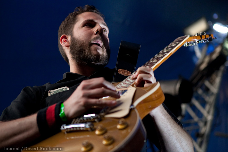 De fait, je regrette un peu de ne pas avoir été voir Ozzy à la place de Hawkwind (ça n’aurait pas changé grand-chose à la moyenne d’âge, notez) mais il est trop tard désormais : il faut rester sur place pour s’assurer d’être aux premières places pour KYUSS LIVES !. De manière assez stupéfiante, le « phénomène » déjà rencontré l’an dernier au même moment se produit à nouveau : sans parler de l’atmosphère littéralement électrique qui précède le concert, on voit se masser sur le bord de la scène et derrière (en coulisse) des dizaines de curieux et d’amateurs (un phénomène pas constaté une seule fois en 3 jours de festival). Evidemment, le groupe monte sur scène 15 bonnes minutes plus tard que prévu, et entame son set avec un libérateur « Gardenia », permettant à Garcia de soigner son entrée après un long tour de chauffe de ses musiciens. Concentré, Oliveri reste sur son côté de la scène et soigne ses lignes de basse. Son jeu au médiator finalement ne choque pas tant que ça (même si l’on ne peut que regretter la rondeur et la profondeur du son de Reeder). Quant à Fevery, il ne bougera quasiment pas de tout le concert, affichant l’assurance franche et le charisme d’une sole meunière. Ce qui ne signifie pas qu’il joue mal, bien au contraire : les lignes de guitare sont maîtrisées, et les andouilles qui le comparent à Josh Homme devraient se repasser quelques bootlegs live de Kyuss et compter les pains du grand rouquin ! (ça c’est le problème avec une armée de pseudo-fans qui ne connaissent le groupe que via leurs albums à la production impeccable – mais c’est un autre débat). Enchaînant avec « Hurricane » et « One Inch Man », le groupe choisit de contenter sa fan base et de viser le KO au premier round. Ensuite seulement, le groupe pioche dans son unique album « légitime » (rappelons que « Blues… » est le seul album de Kyuss avec Bjork et Oliveri) via « Thumb » et « Freedom Run ». Puis s’ensuivent des titres issus de leurs trois derniers albums, en vrac… Garcia, lui aussi plutôt sérieux ce soir, assure, tout simplement : ayant retrouvé sa voix d’antan (ou presque), il est infaillible. Quant à Brant Bjork, on avait simplement oublié, derrière le modeste guitariste, quel excellent batteur il est : carré, solide, il assure sa part du job sans soucis. Certes, il n’y aura pas ce soir la « magie » que d’aucuns pouvaient espérer, mais au final, voir la tente Terrorizer dégueuler de monde à 2h du mat’ après 3 jours de festival, remplie de fans et de néophytes en train de danser sur place avec le sourire, c’est une part de magie que l’on ne peut pas négliger.