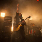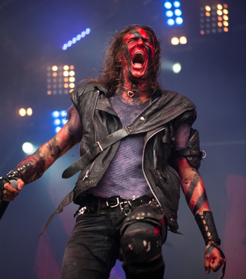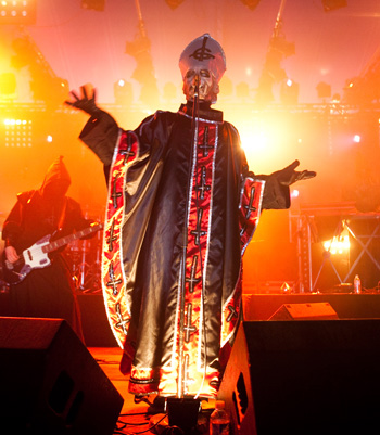 S’ensuivent quelques pérégrinations plus ou moins intéressantes sur le site (dur dur la bascule Tsjuder / Duff Mc Kagan !), puis je reviens sous la Terrorizer pour le set très « hypé » de GHOST : tout le monde parle du groupe depuis 2 jours, comme « la » surprise décalée du festival… bien vu ! Pour être décalé, le groupe l’est à tous les niveaux ! Les musiciens sont tous vêtus de soutanes « intégrales » (même leur visage est dissimulé) et le chanteur, grimé en pape proche de la décomposition cadavérique, frontman pour le moins décalé, assure le show par son charisme remarquable (sa voix n’étant pas en reste). Musicalement, difficile de définir la musique du combo scandinave : metal, doom, hard, prog,… tout y passe ! Mais au final, ça joue bien, et les titres sont franchement super bien gaulés : plus d’une fois on se prend à hocher la tête en rythme, surpris par le côté catchy de certains morceaux. Pas uniquement une blague ou un groupe anecdotique, Ghost paraît mériter quelques écoutes vinyliques, et si possible d’autres passages live pour confirmer tout le bien qu’ils ont démontré sur scène.