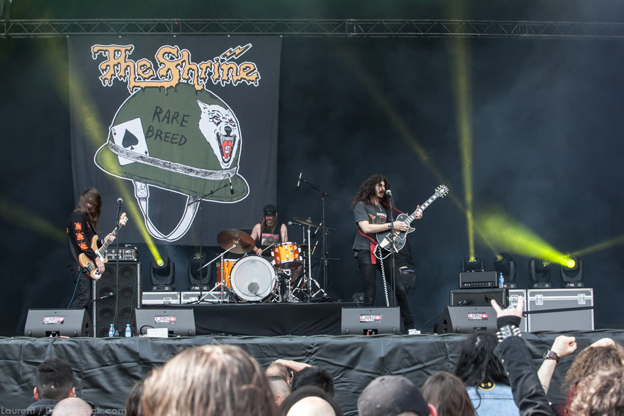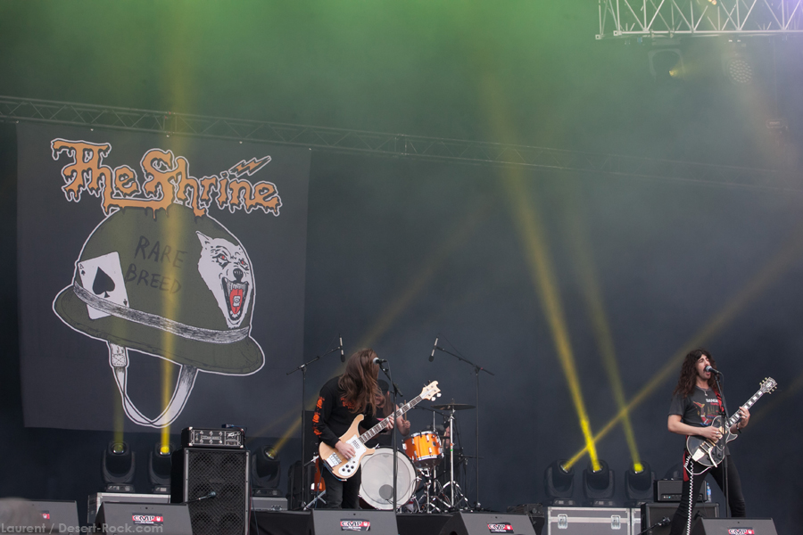 Malgré un travail remarquable concernant la programmation et les horaires des groupes, il y a bien quelques frustrations et choix cornéliens à opérer pour tout fan de gros riffs durant ces trois jours… Et le premier de ces choix doit être opéré dès les premières minutes de cette édition 2016, avec une ouverture de festival simultanément opérée par Monolord et The Shrine, un groupe que nous affectionnons particulièrement. Le trio de heavy-punk-stoner-garage-rockers californiens grimpe donc sur cette mainstage 2 bien trop grande pour eux, bien décidés à tirer le meilleur de cette opportunité. A cette heure-ci, les américains souffrent du même problème que Monolord : le public est clairsemé, et comme souvent à ces horaires sur la main stage, globalement plutôt passif. Le soleil a par ailleurs le bon goût de resplendir sur la demi-heure de set du groupe, ce qui rend l’apathie contagieuse. Mais l’énergie est là, et se reposent sur un set de compos parmi leurs plus péchues, bien sûr. On citera notamment l’énervée « Worship », mais aussi « Death to Invaders » et son riffage majestueux. Plus remarquable : sur une petite demi-heure de set, le groupe prend quand même le temps de faire monter le déjanté Beb, du groupe punk rock rémois (!!) culte mais confidentiel Soggy (combo qui a plié les gaules depuis plusieurs années mais dont The Shrine est fan) pour une interprétation énergique de leur classique « Waiting for the War ». Respect pour ça. Mais bon, on aurait aimé voir le groupe dans un contexte plus favorable à l’énergie qu’il déploie sur scène.