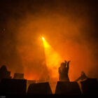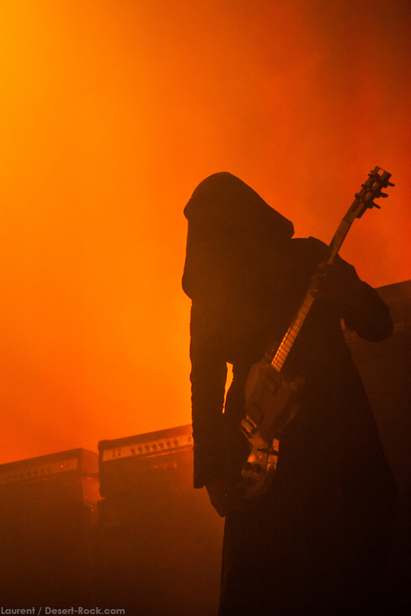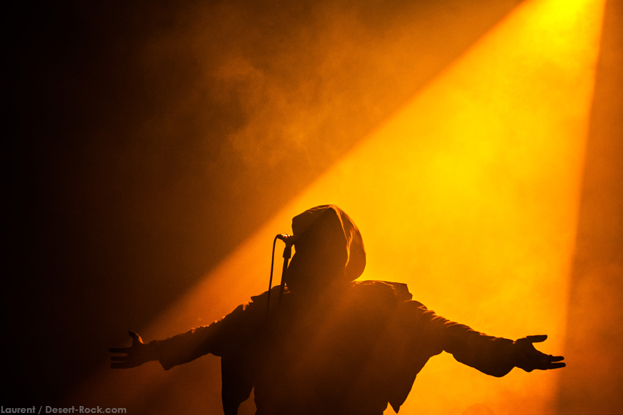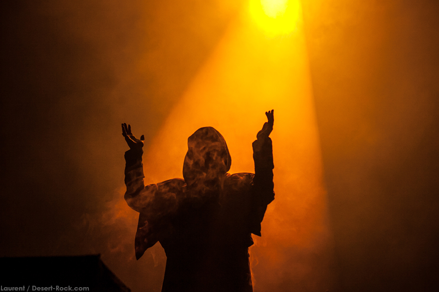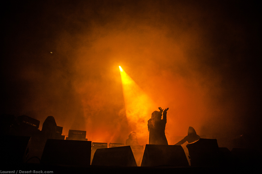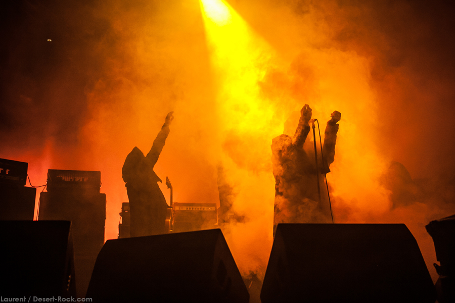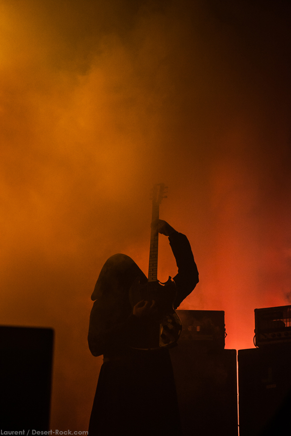 Annonçons-le tout de go : l’objectivité, tout comme le sens commun, finalement, n’ont pas de place dans le cadre d’un concert de Sunn O)). Ce postulat ainsi formulé, c’est avec une grande impatience que l’on gagne la Valley, déjà noyée dans un épais brouillard synthétique (les machines à fumée crachent non stop depuis un bon moment déjà !) ; tout juste y distingue-t-on cette configuration scénique pour le moins atypique, avec des murs d’amplis à taille humaine disposés comme en arc de cercle. Nos quatre prêtres du son, comme en procession, prennent place un à un dans cet espace, et entament un rituel dont peu de monde ressortira indemne. Précisons à ce stade que la Valley n’est pas vraiment blindée, comme chaque année pour les principaux artistes sous cette tente, et il faut dire que ce soir en particulier, la concurrence du set de Rammstein (et de son grand spectacle quasi assuré) fait du mal. Mais les puristes seront récompensés : dès le premier accord dégainé (on ne peut pas parler de riff quand plusieurs minutes séparent chaque accord… si ?), maître SOMA fait vrombir la puissance tellurique de ce mur d’ampli, allant pousser dans leurs retranchements les pourtant grandes capacités des subs du Hellfest, et vient faire vibrer à l’unisson les corps surpris/apeurés/amusés d’un public qui ne sait pas vraiment sur quel pied danser pendant une heure. Ainsi se crée cette communalité qui fera la force du set tout du long, que l’on peut résumer par cette phrase que l’on retrouve en en-tête de la spec technique du groupe : « Audio philosophy : maximum volume yields maximum results« . Le maître de cérémonie incontesté sera Attila, qui incarne pleinement le set, en théâtralité évidemment, mais aussi en pure technique vocale : sa technique époustouflante, mêlant growls profonds et incantations, est captivante. Plus qu’un concert, on a vécu une expérience mémorable, et la configuration « Hellfest », que l’on pensait inadaptée pour ce type d’événement, s’avère finalement, une fois la nuit arrivée, parfaitement compatible. Une claque.