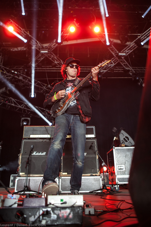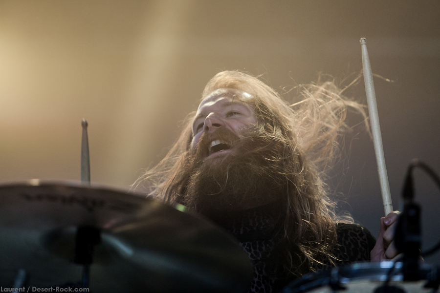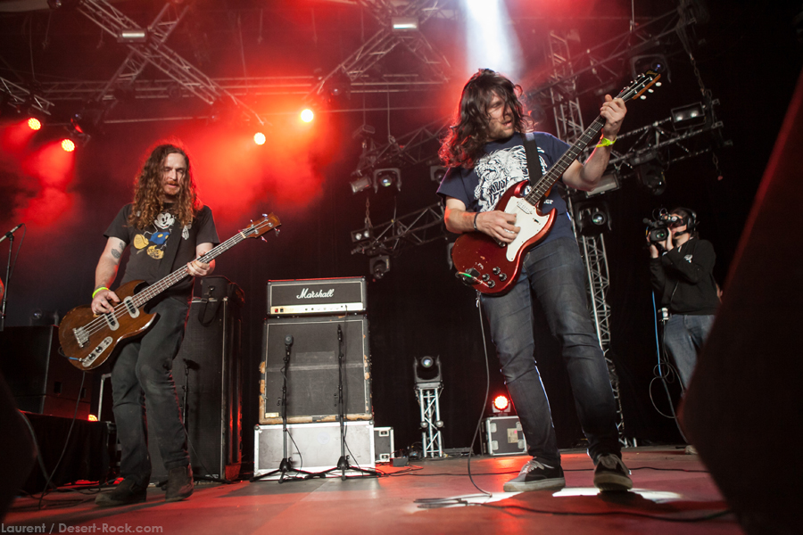 Les déjantés de Lecherous Gaze nous avaient laissé un souvenir quelque peu brutal il y a quelques années lors de leur passage au Desertfest Berlin : leur attitude punk et Lakis Panagiotopulos, leur chanteur déjanté (qui avait joué tout son set avec la tête dans un collant), détonnaient dans un environnement psyche ou doom… C’est donc avec un grand intérêt qu’on attend de voir s’ils ont évolué (j’ai failli dire « grandi », bande de sales gosses…) et quel type de performance ils vont proposer cette fois. Faut dire que le « Johnny B. Goode » râpeux, sale et déjanté joué en entier durant le soundcheck nous a un peu mis la bave aux lèvres… Le set commence d’ailleurs sur « Animal Brain », brulot à mi-chemin entre Chuck Berry et les Sex Pistols, en gros, permettant à Panagiotopulos de commencer à faire son show (mimiques, fausse bosse de bossu bricolée avec un vieux tee shirt…). Faut dire que derrière ses pitreries, les gaziers envoient du gros steak garage bien gras, et peuvent même effleurer des passages presque psyche (comme sur « New Distortion »). Quand le chanteur part backstage le temps d’une de ces jouissives plages chargées en soli testostéronés, c’est pour mieux revenir la gueule et le torse entourés avec un large rouleau de scotch rigide « duct tape »… Gros budget accessoires ! (et je vous passe les détails du gars backstage hurlant à la mort quand il faut lui arracher le scotch dans les cheveux après le concert). Sans prétention, grosse énergie, musiciens décalés mais pas manchots… Pas le set du siècle musicalement mais un bon gros moment de fun !