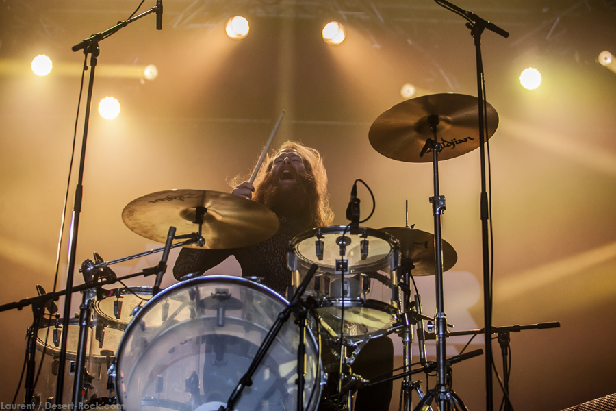 La dernière fois qu’on a vu Kadavar au Hellfest, ils étaient clairement sur la pente ascendante, à deux doigts d’exploser pour atteindre un niveau de notoriété qu’ils n’ont pas quitté depuis. C’est donc en seigneurs que nos trois grands chevelus barbus montent sur scène et engagent l’introductif « Lord of the Sky ». Bien décidés à appuyer leur dernière production, le trio franco-germanique pioche allègrement dedans pour remplir rien moins que la moitié de sa set list de ce soir. Ce choix audacieux s’avèrera moins casse-gueule que l’on n’aurait pu le craindre : les nouveaux titres se fondent finalement pas mal dans la discographie du groupe, et stylistiquement, on n’y voit que du feu. Bref, ça ne détonne pas… Sauf que, diantre, on aurait bien aimé quelques titres un peu plus chauds que les insipides « Old Man » ou « Last Living Dinosaur » pour enflammer un peu cette set list qui se perd un peu dans le mid-tempo (dans lequel ils excellent, il est vrai). Pas beaucoup de relief, quoi. Reste que les bonhommes ont une assurance et une efficacité instrumentale qui laisse pantois : les deux grands échalas à droite de la scène déroulent une rythmique parfaitement huilée (mention spéciale, encore et toujours, au déjanté Tiger, qui n’a rien à envier au Animal du Muppets show en terme d’attitude scénique…) tandis que Lupus aligne ses riffs et ses somptueux soli avec fougue et (reconnaissons-le) grand talent. On ne pourra pas non plus dire que les allemands sont en mode automatique : ils se donnent bien dans le set et font (très) bien ce qu’on attend d’eux. Le public est à fond, d’ailleurs. Reste qu’on aurait apprécié quelque chose d’un peu moins policé, un peu plus fou…