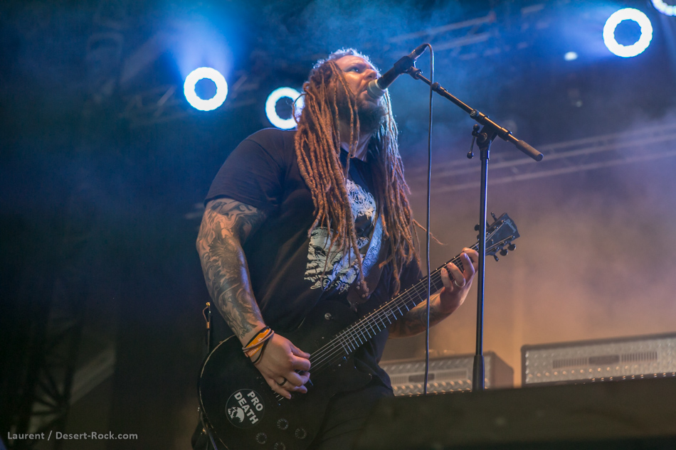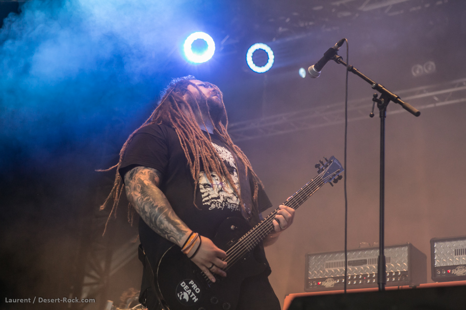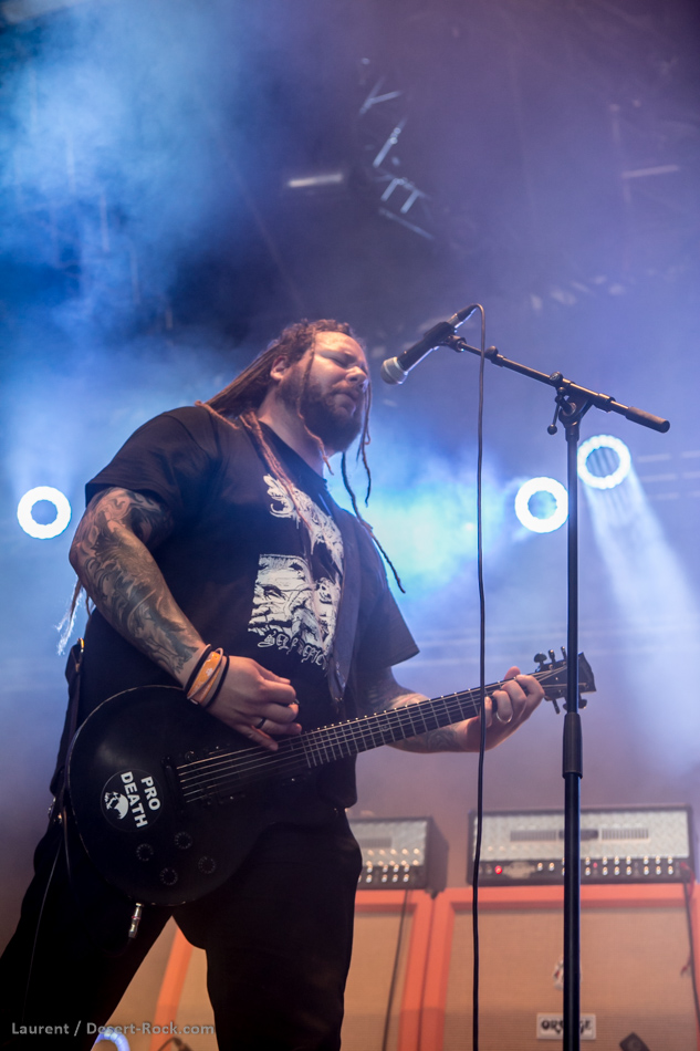 Pour ce deuxième jour, le public s’est déplacé en masse pour accueillir les doomeux du Colorado. Eux ne semblent pas particulièrement heureux d’être là, mais il s’agit aussi peut-être d’une pose liée à leur ambiance musicale. Difficile de faire bouger la foule sur des tempos aussi lents, mais la lourdeur du son montre que l’on a pas affaire à des baltringues ! Les gars déchaînent les enfers dans des turpitudes de guitare plombantes, et l’on en ressort tout chamboulé. Disons que l’ambiance du groupe n’est pas spécialement estivale !