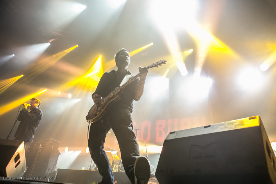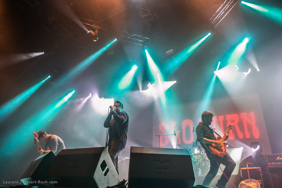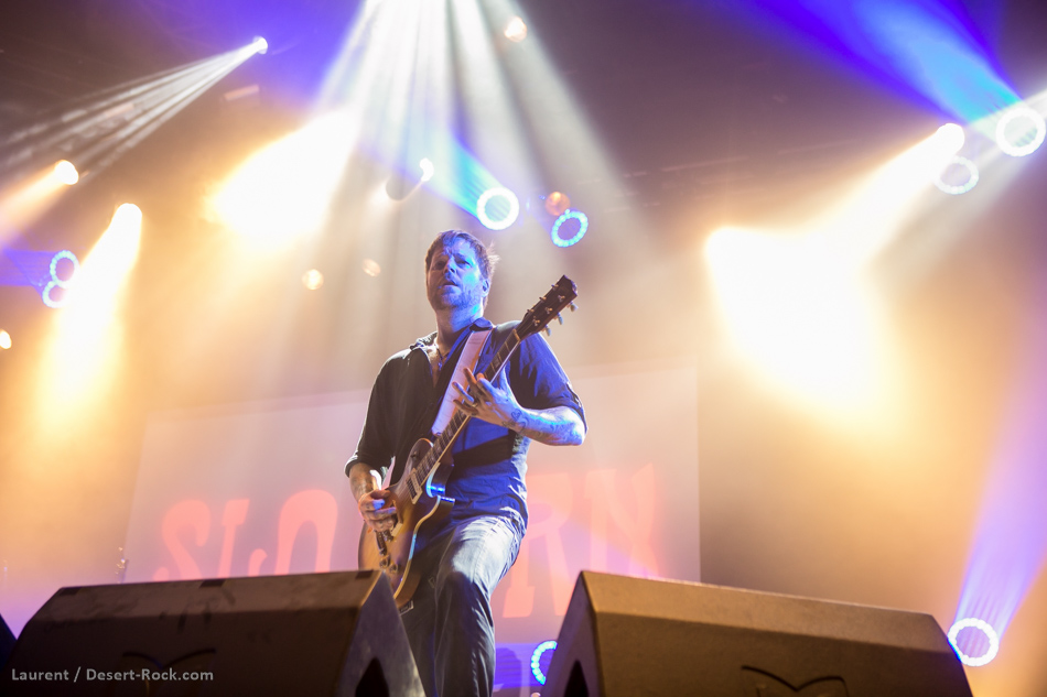 Après une journée bien remplie de formations représentant toutes les tendances de la scène, et même plus avec Les Claypool et sa bande de joyeux lurons, John Garcia est de nouveau au Hellfest avec l’une de ses multiples formations. Nous n’allons pas bouder le plaisir qui a été le nôtre, que de se taper Slo Burn live, même si la discographie homéopathique du groupe ne justifie en rien le placement des Californiens en tête d’affiche de la deuxième journée dans la Valley. D’ailleurs on s’en branle un peu de ce que peuvent penser certains vu que Garcia incarne quand-même une bonne proportion du mythe fondateur du mouvement et que Slo Burn c’était clairement le truc que nous ne pensions jamais voir sur scène. Le frontman avait pourtant déjà occasionnellement interprété des titres de ce projet éphémère (comme ils disent sur Wikipédia) lors des prestations live qu’il multiplie depuis son retour aux affaires sous de multiples appellations. Excités comme de jeunes pucelles le soir du bal de promo, nous trépignions d’impatience aux douze coups de minuit pour voir la légende. Nous étions nombreux dans ce cas, mais la Valley n’était pas pleine, autant se l’avouer même si c’est douloureux au niveau du postérieur. Le quatuor emmené par sa star a balancé le film d’intro (à l’iconographie pachydermique) avec une grosse poignée de minutes de retard puis il a envoyé son répertoire officiel et officieux dans la foulée. Nous avons humidifié nos petites culottes sur certaines masterpieces (« July » ou l’incroyable « The Prizefighter » par exemple), mais avons aussi été ramenés à la réalité en constatant que le leader vêtu de sa chemise noire était un chouia à la peine sur certains titres. Le groupe a certes rempli son contrat, mais il aurait pu se montrer plus aventureux en insérant autre chose que de l’instrumental comme nouveauté (ils répètent ensemble depuis un moment selon leurs dires) voire en proposant une vraie heure de concert puisque c’est cinq minutes avant la fin officielle que les lumières se sont éteintes sur la scène de la Valley. Malgré le ressenti un poil mitigé de types qui deviennent exigeant avec les années, les spectateurs présents dans la place pourront se targuer d’avoir vu Slo Burn lorsqu’ils raconteront leur jeunesse à leur descendance.